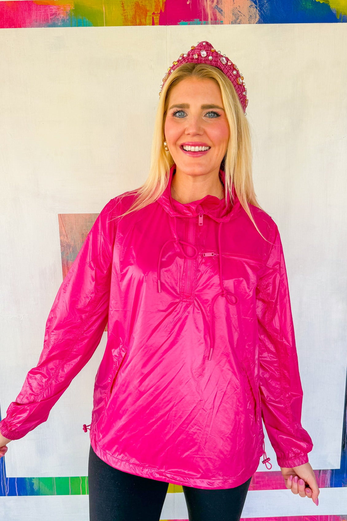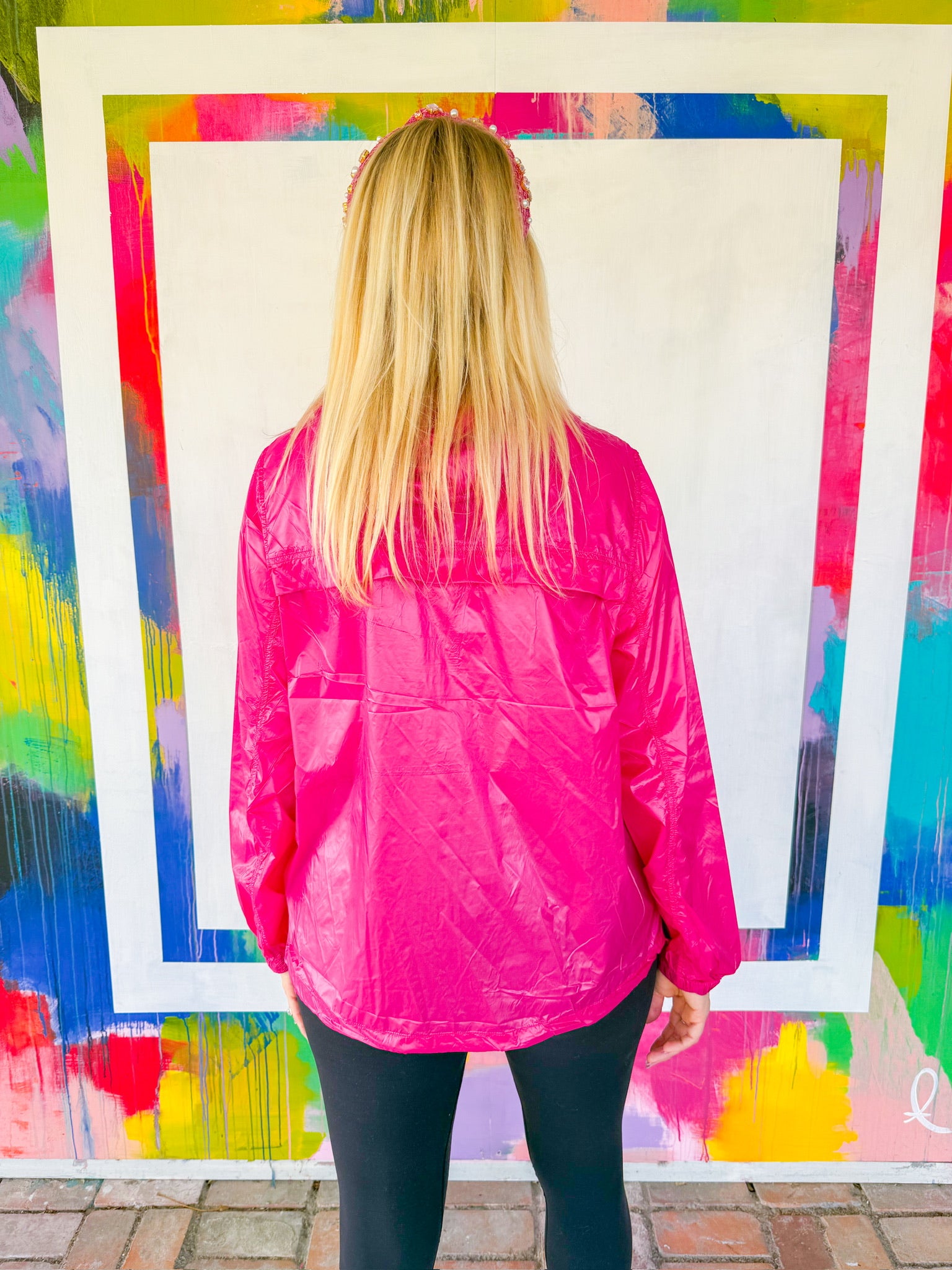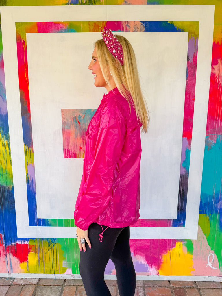 Caught without an umbrella? No problem. This feather-light rain jacket slides into your bag like it's barely there, keeping you dry without the bulk. The attached hood means you're always ready for a surprise downpour, and the paper-thin fabric moves with you—perfect for layering under sweaters or wearing solo on breezy days. Fuchsia pop included.