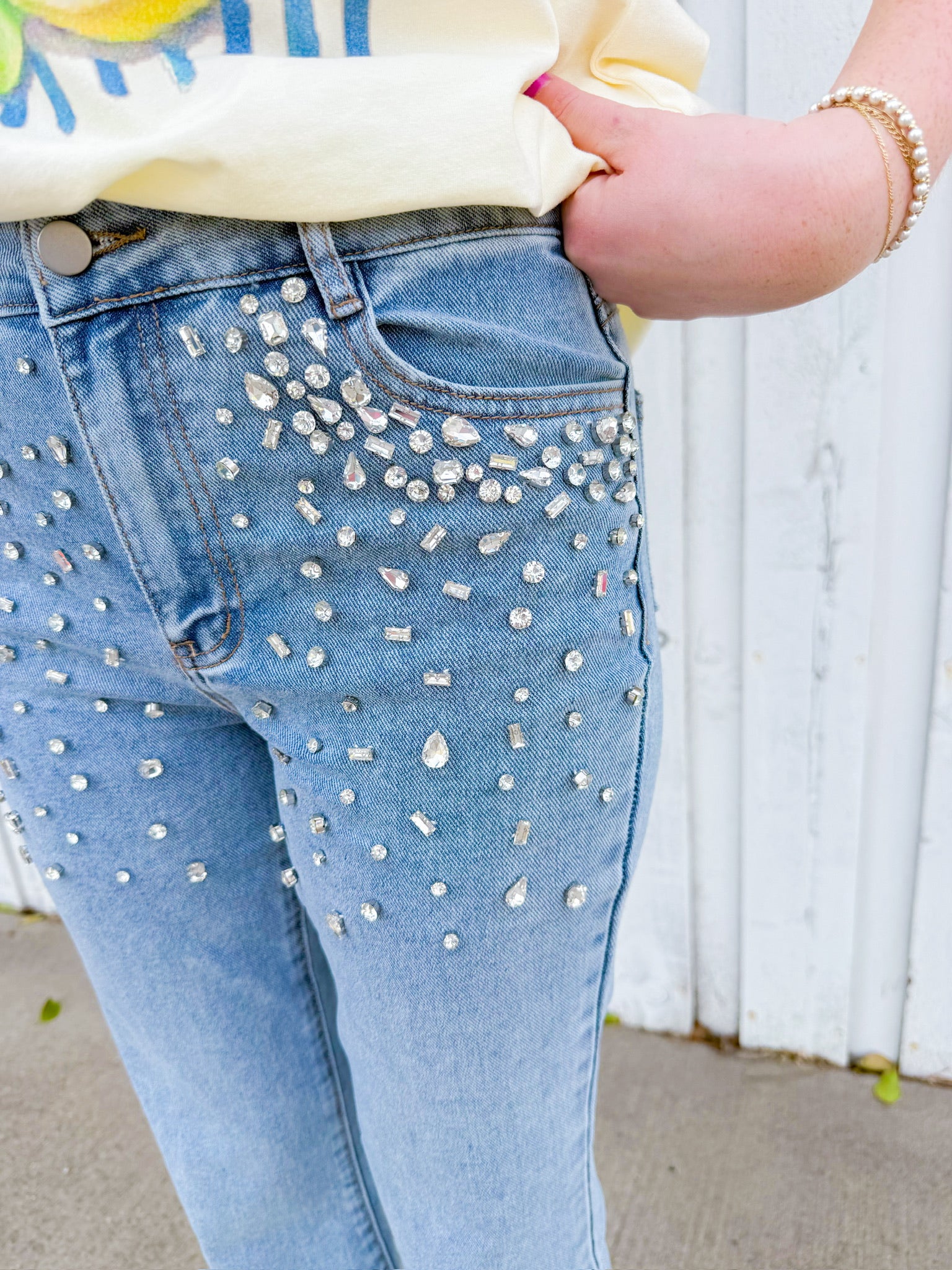 Star Shine Jeans - Light Wash Elevate your everyday denim with a touch of sparkle. These light wash jeans feature scattered rhinestones across the top, adding just the right amount of glam to your casual look.