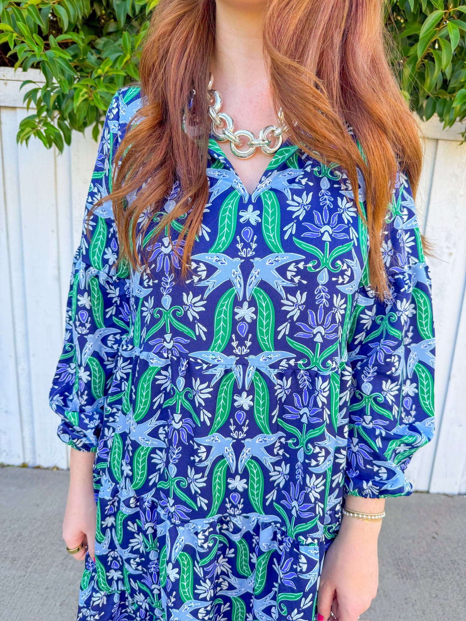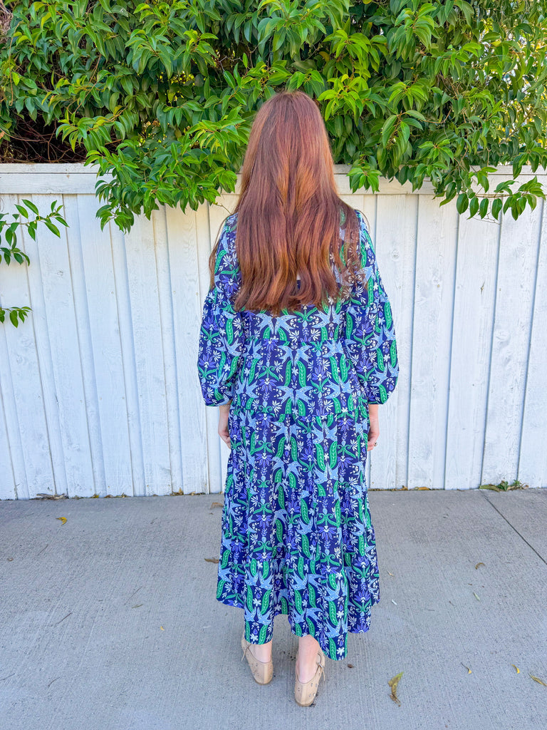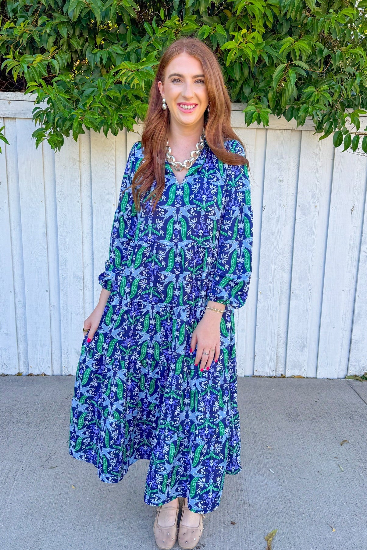 Twirl into enchantment with this whimsical maxi dress, featuring a navy base adorned with a graceful lighter blue bird and intricate paisley flourishes.