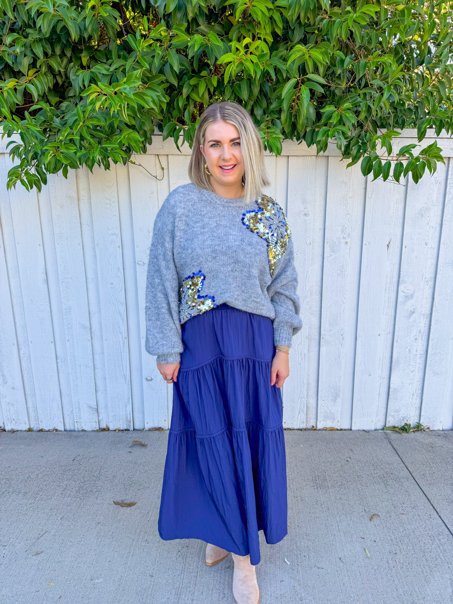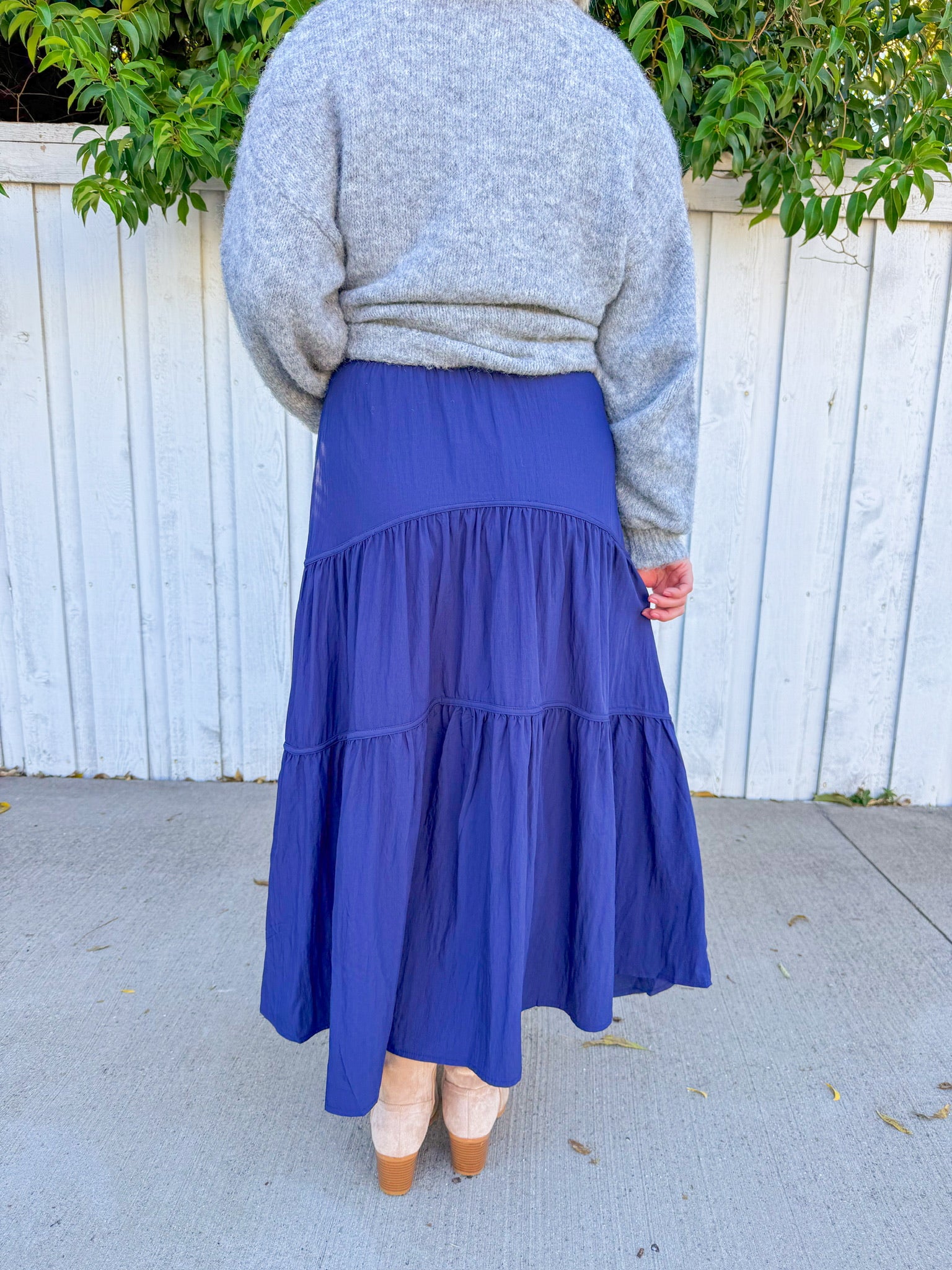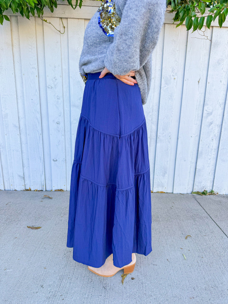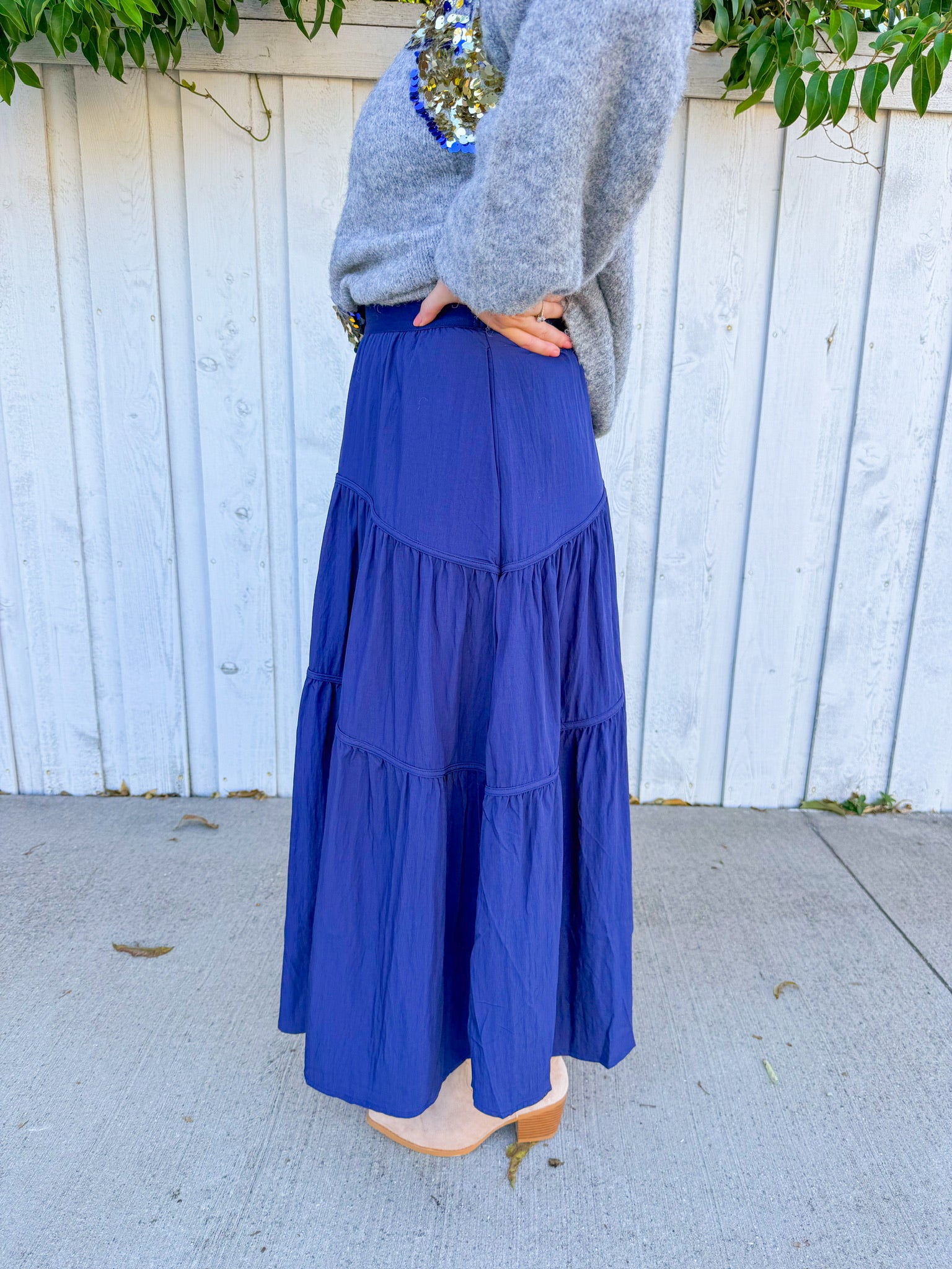 Flowy blue maxi skirt with a lightweight, windbreaker-inspired fabric that moves with you. Tiered seams add dimension and visual interest, while the stretchy waistband ensures all-day comfort.