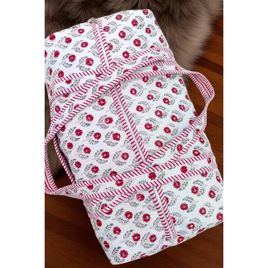Chic, functional, and full of charm—this quilted duffle bag is the perfect blend of style and practicality. Featuring a dainty red floral print on a crisp white background, it’s a timeless design that feels both classic and fresh. The spacious interior makes it ideal for weekend getaways, overnight stays, or carrying everything you need on the go, while the sturdy striped handles add a playful touch. Lightweight yet durable, this duffle is ready to be your new favorite travel companion. 20x10x10