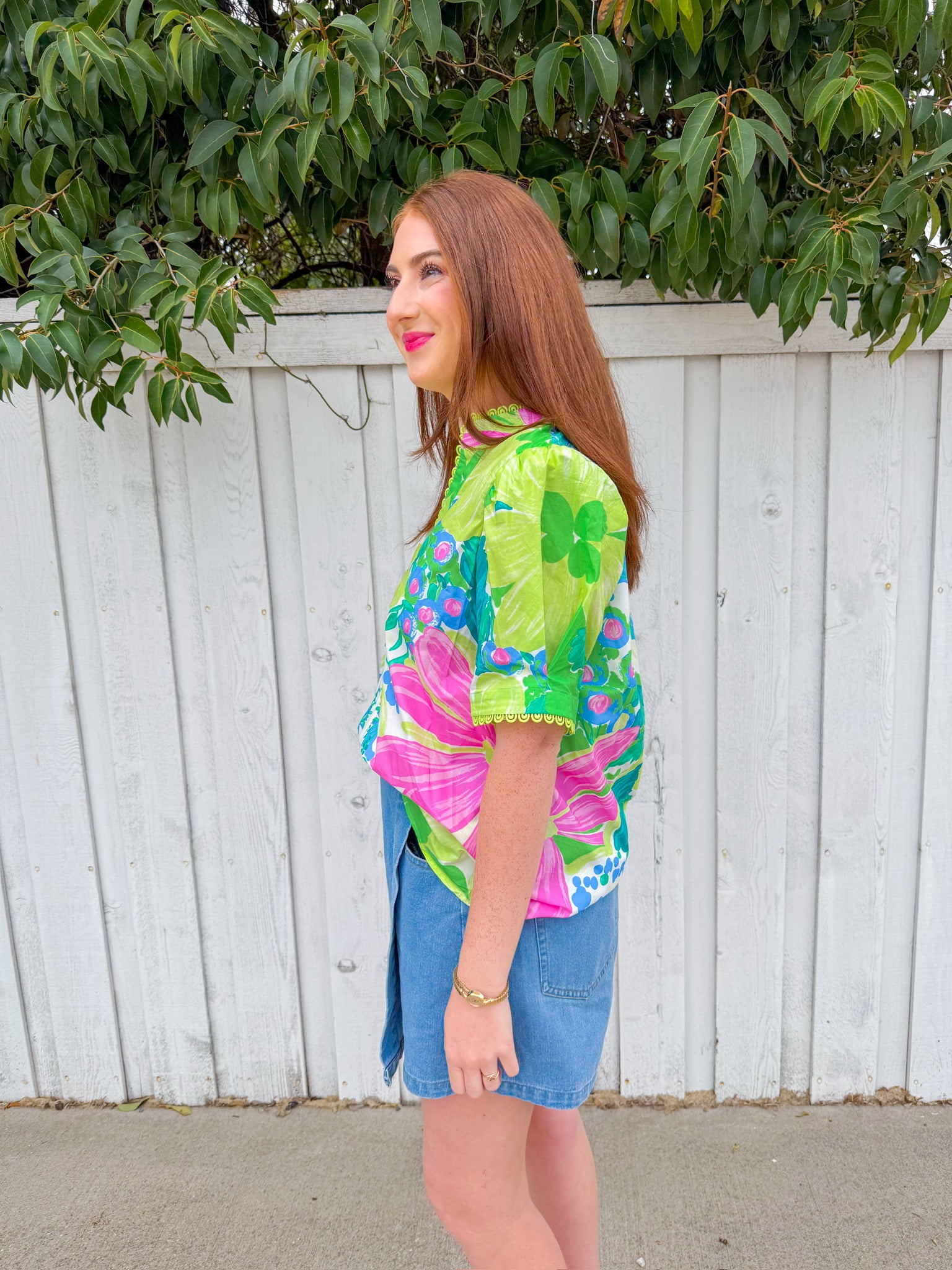 Sunday Best Top - Lime Brighten your wardrobe with this vibrant lime green short sleeve blouse, featuring a tropical lily print inspired by Lilly Pulitzer's iconic aesthetic. The playful scalloped trim adds a charming, feminine touch that's perfect for warm-weather styling.