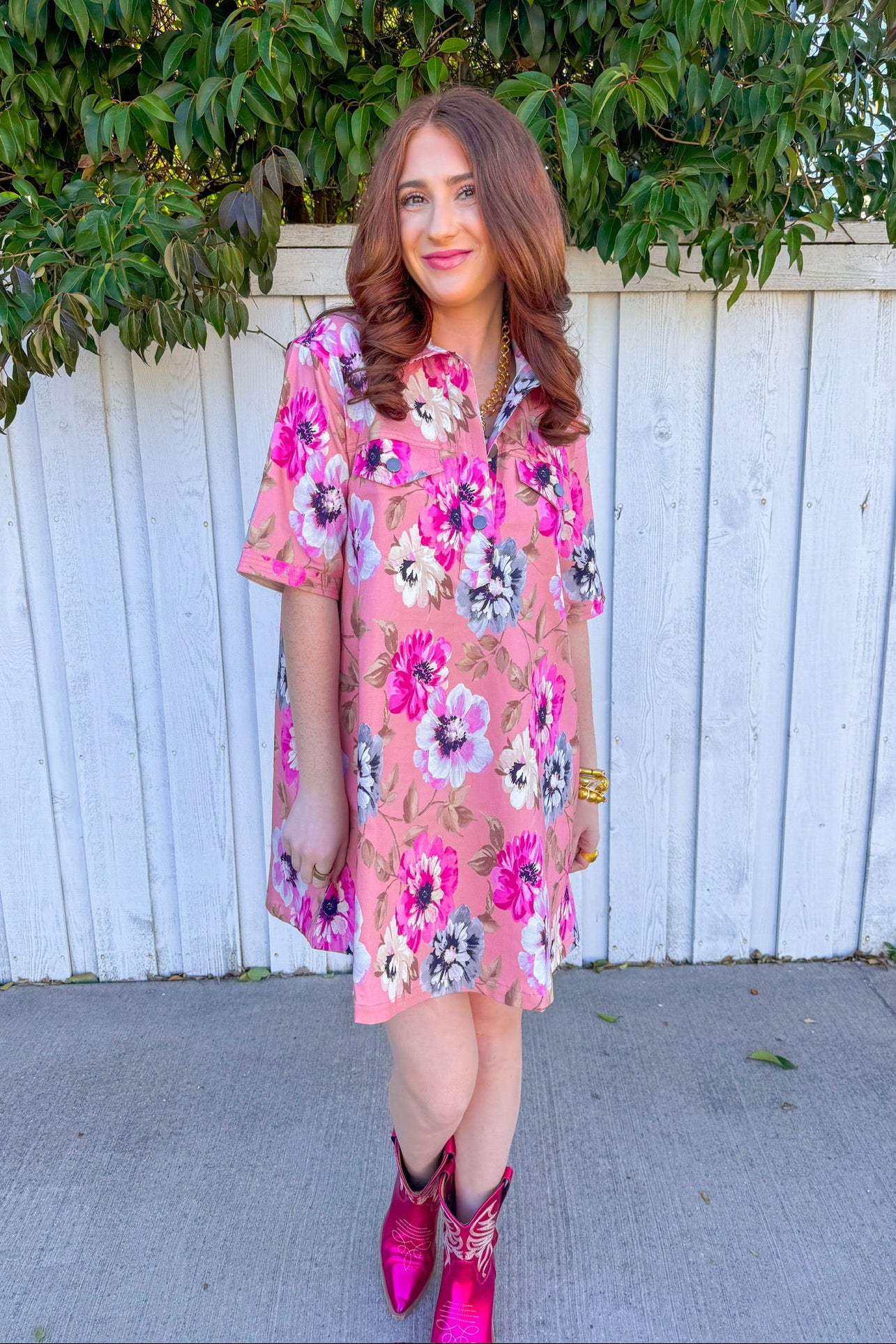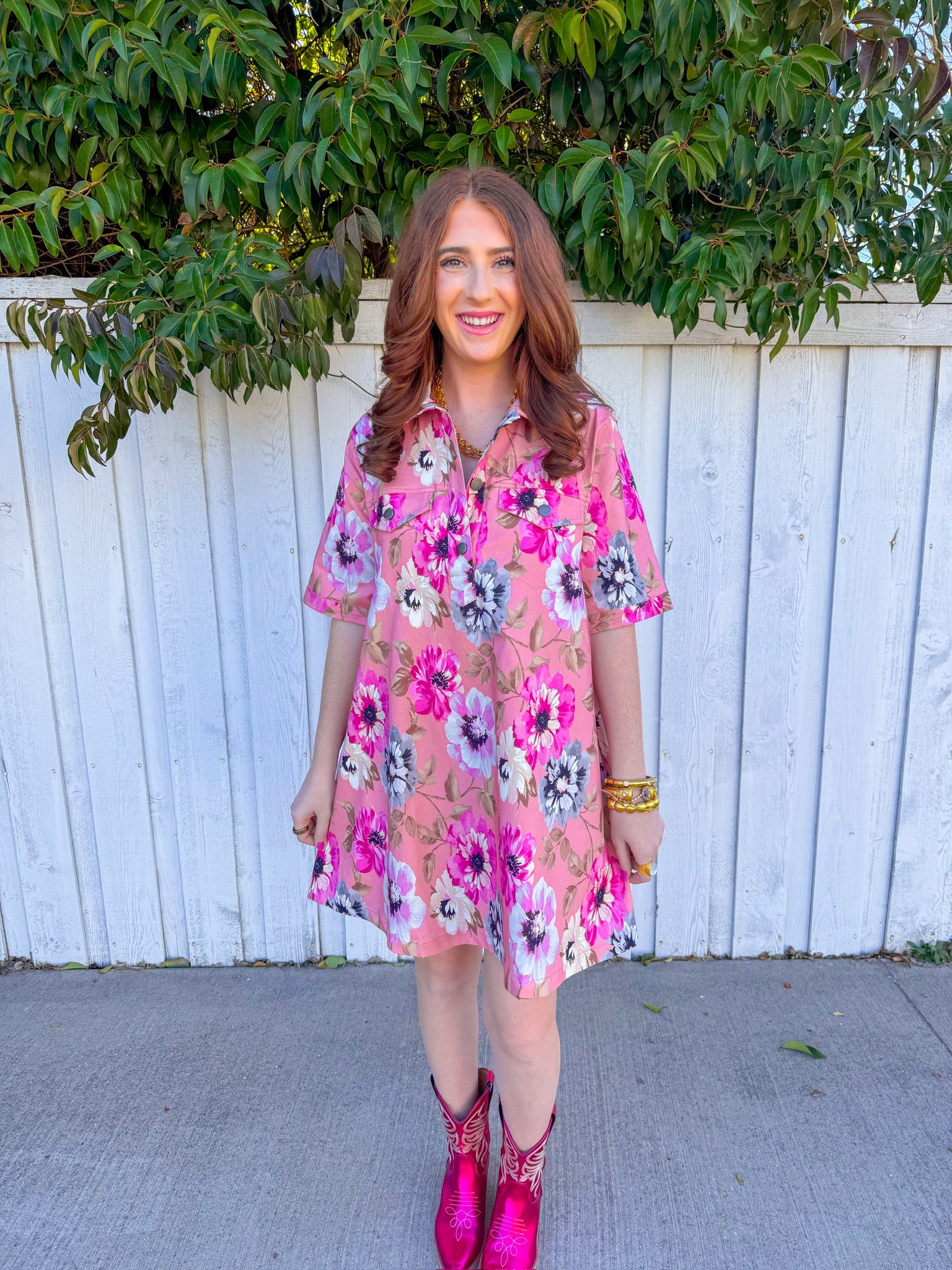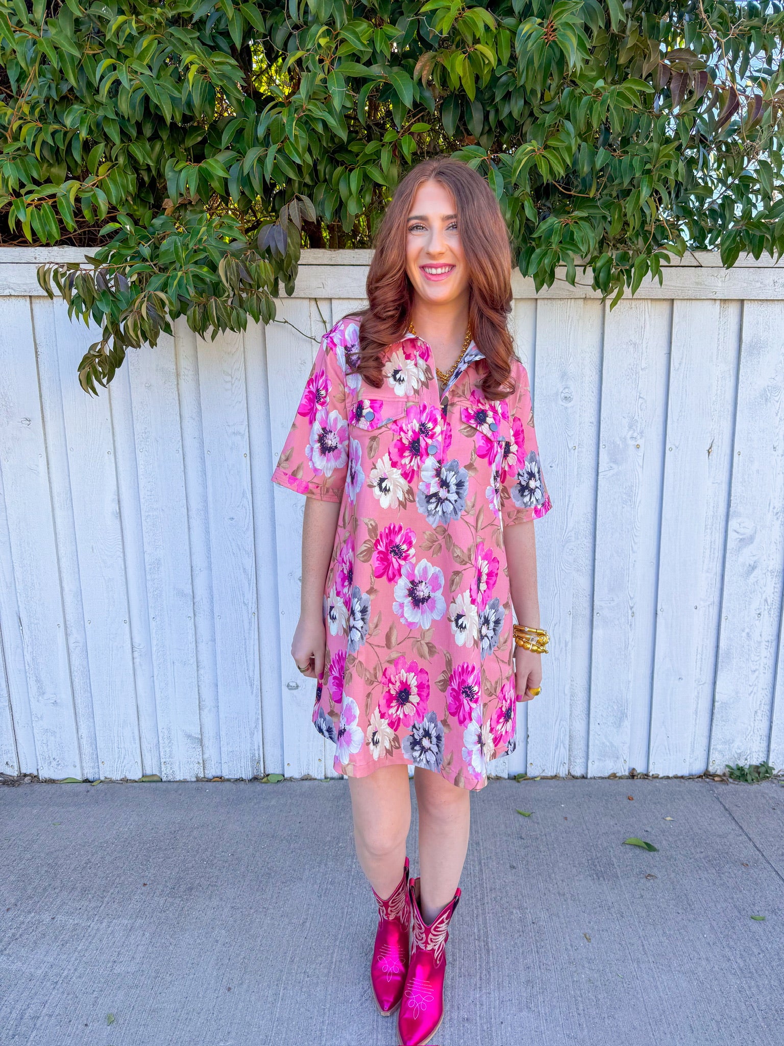 Soft pink fabric blooms with scattered florals in blush, magenta, and ivory tones, creating an effortlessly romantic look.