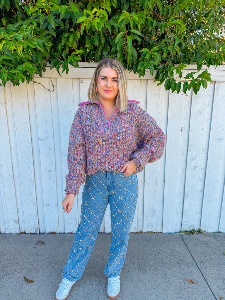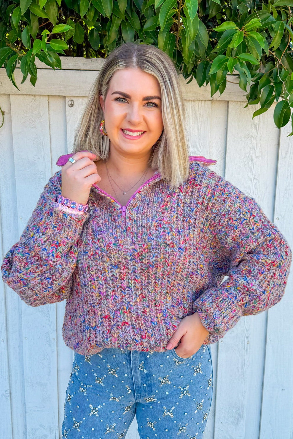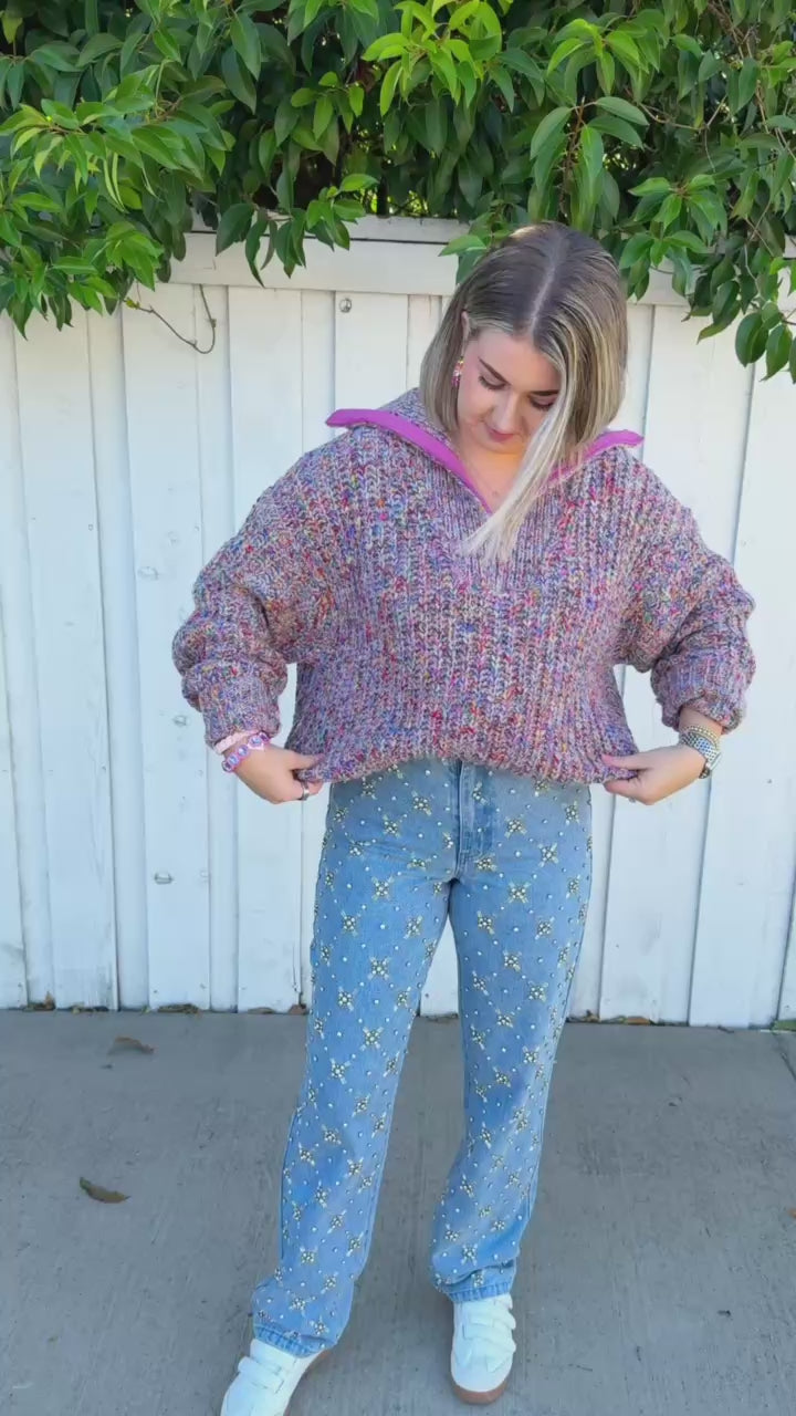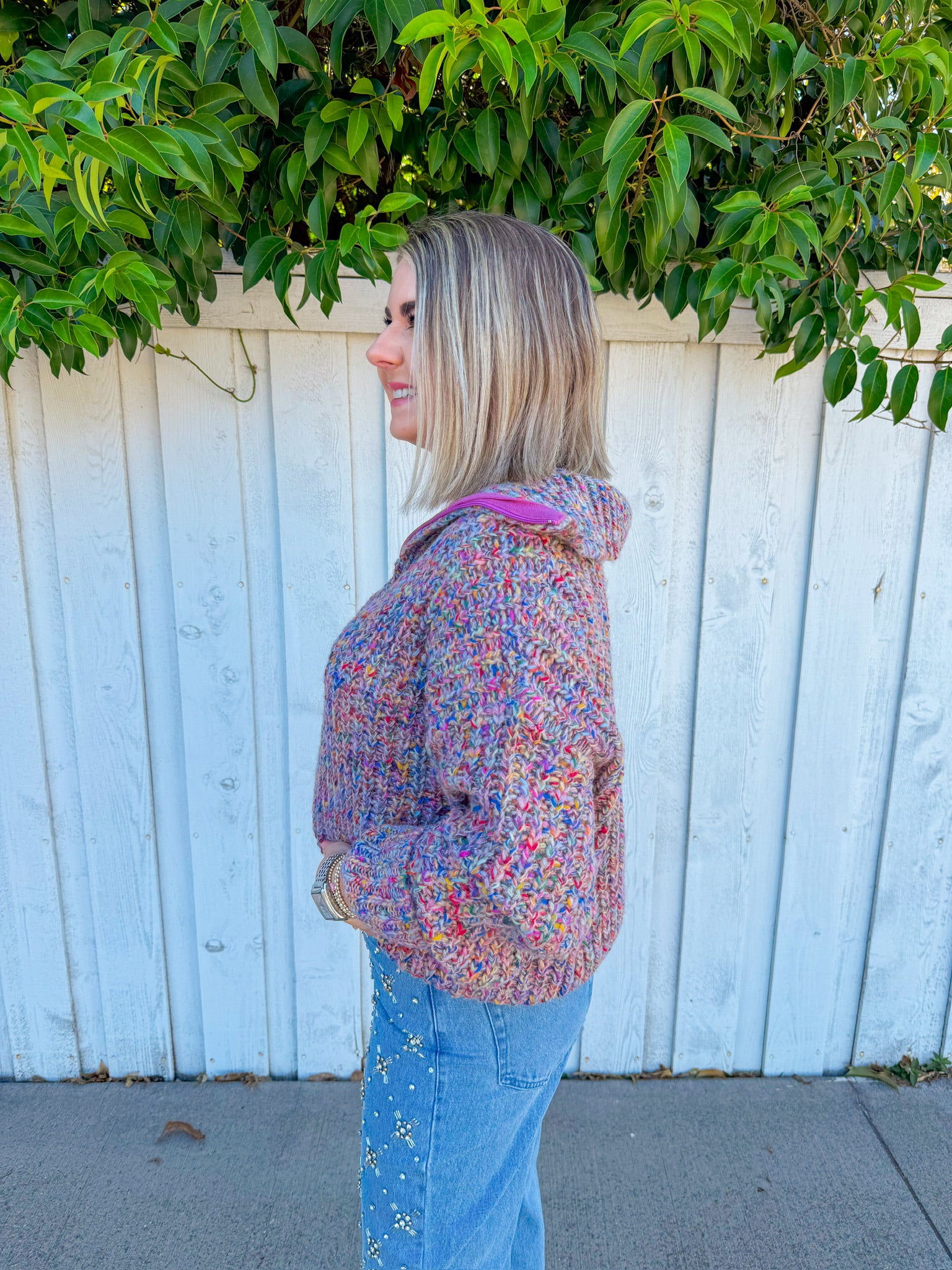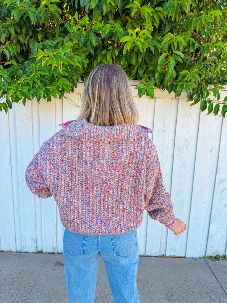 This multi-color chunky knit sweater is your new favorite excuse to stay cozy in style. The snug turtleneck and quarter-length zipper give you total control over your comfort level—zip it up for extra warmth or leave it open for a relaxed vibe.