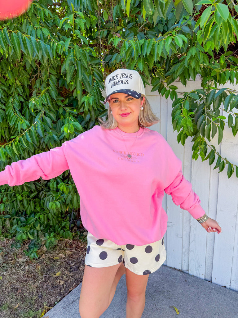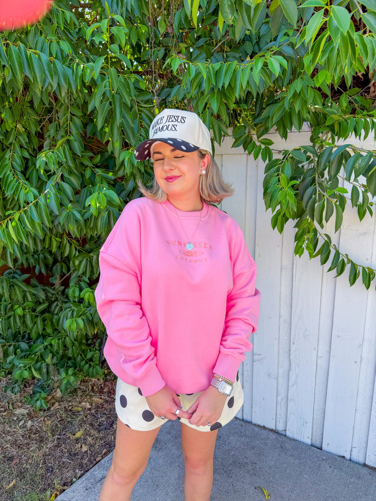 Stay cozy and stylish in the Surfboard Crew Sweatshirt in Lucky Pink from Sunkissed Coconut. Its soft fabric and vibrant pink hue add a splash of fun to your everyday look, while the relaxed fit keeps you comfy whether you're catching waves or just chilling.