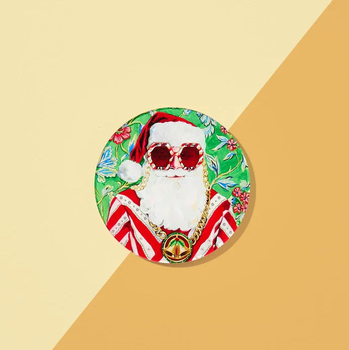 Bring festive flair to your holiday gatherings with this charming Santa coaster. Perfect for protecting surfaces while sipping seasonal cocktails or hot cocoa, it adds a jolly touch to any table setting. Whether you're hosting a Christmas party or simply spreading yuletide cheer year-round, this playful piece keeps drinks in style. A delightful stocking stuffer or gift for the Santa enthusiast in your life.
