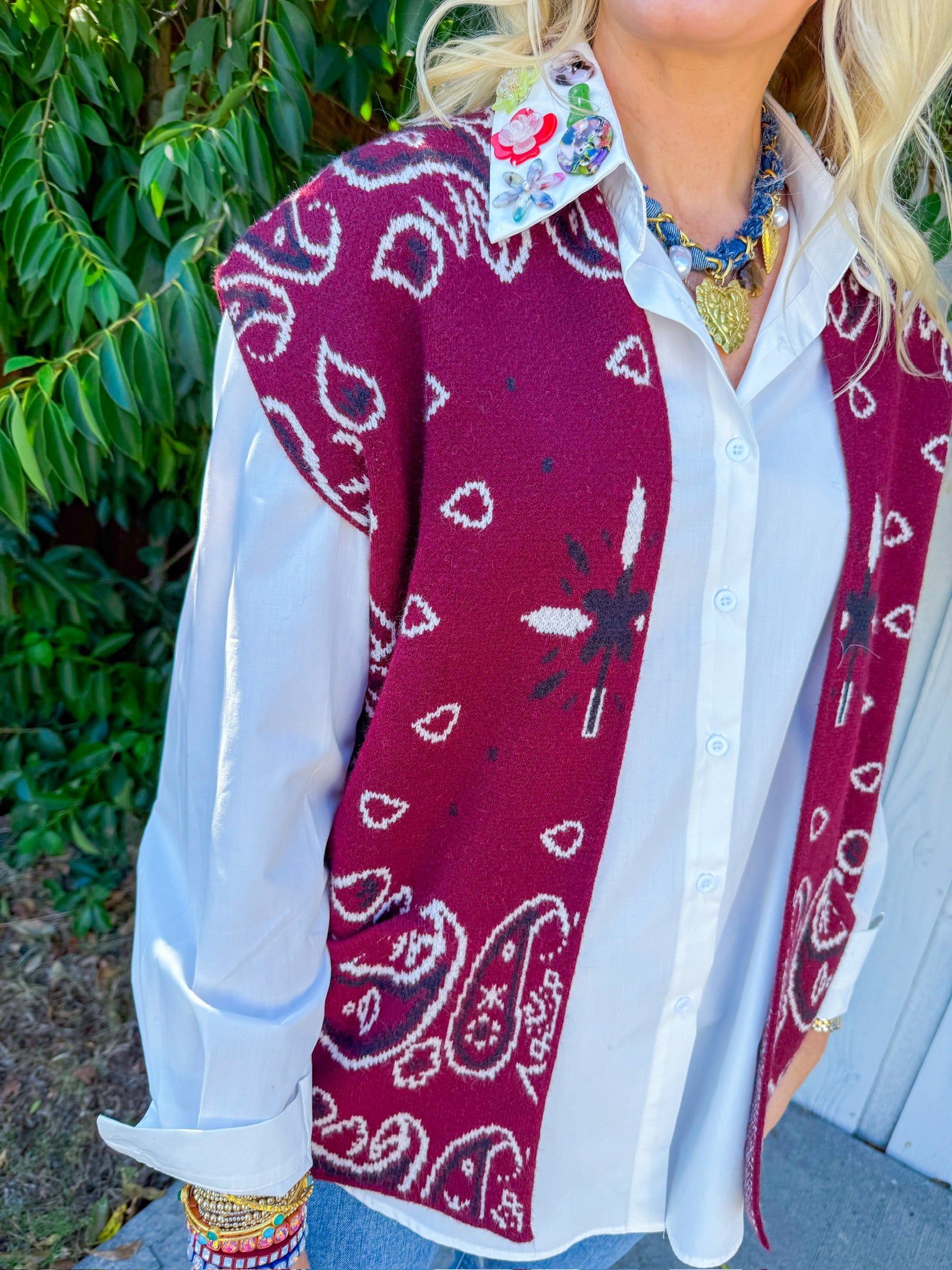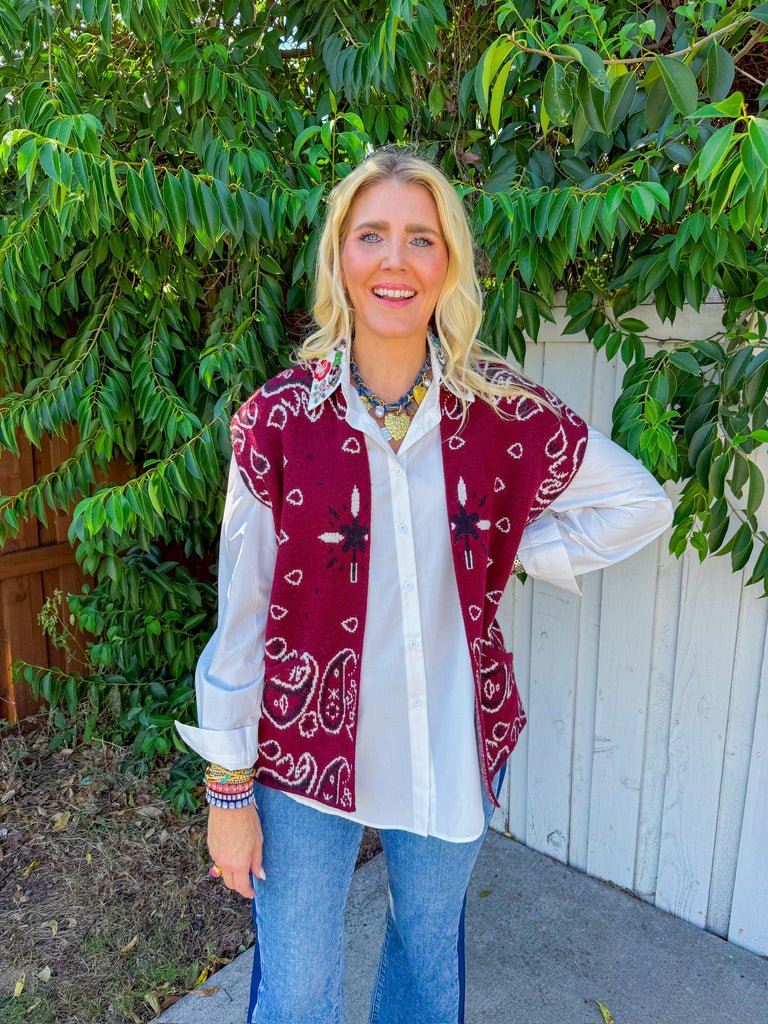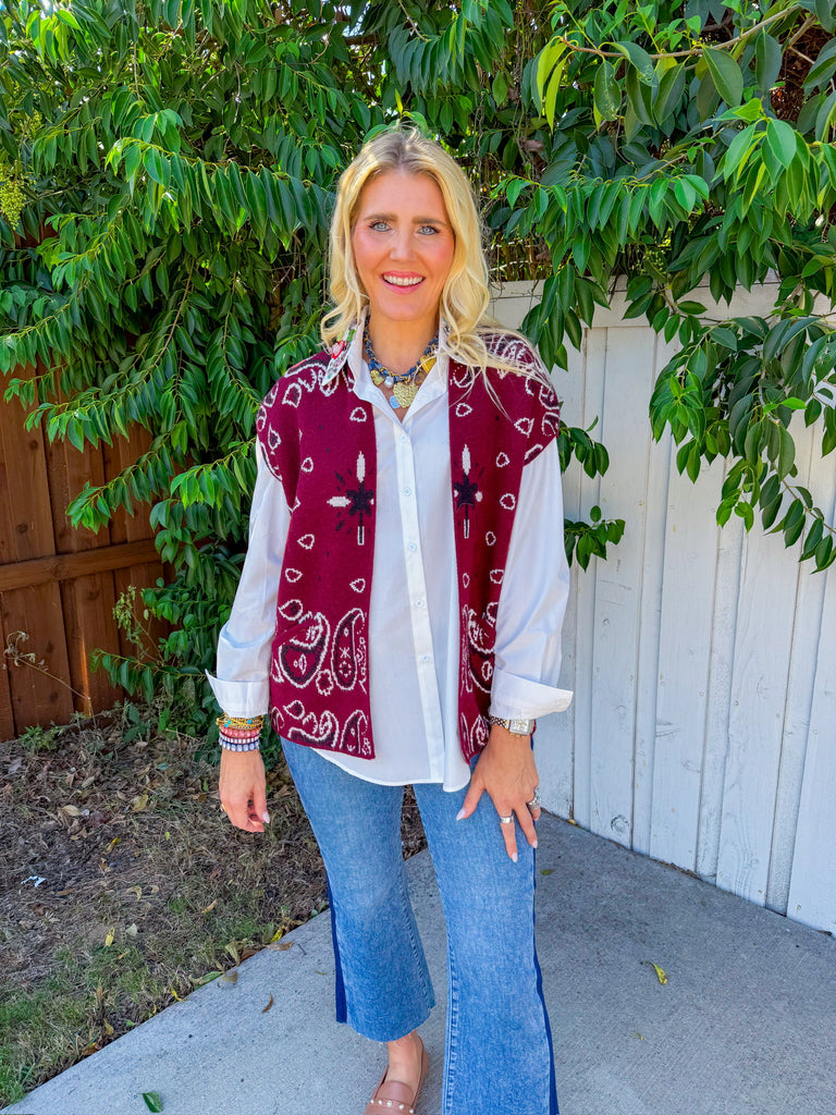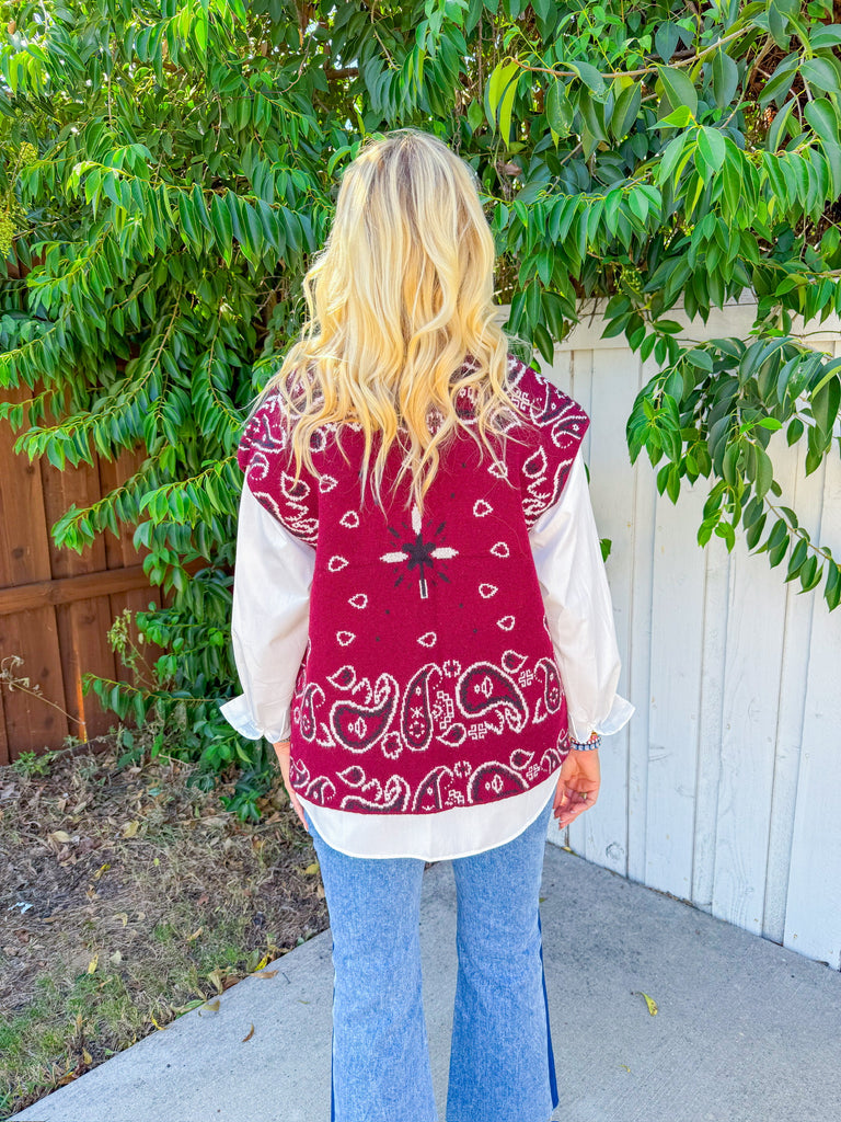 Bring a fun twist to your outfit with the Sway To The Music Vest in rich burgundy. Featuring a lively bandana print, this sweater vest adds a playful pop of pattern to your look while keeping you cozy.