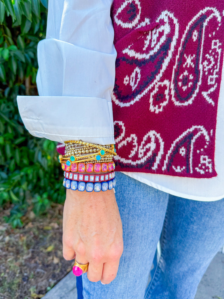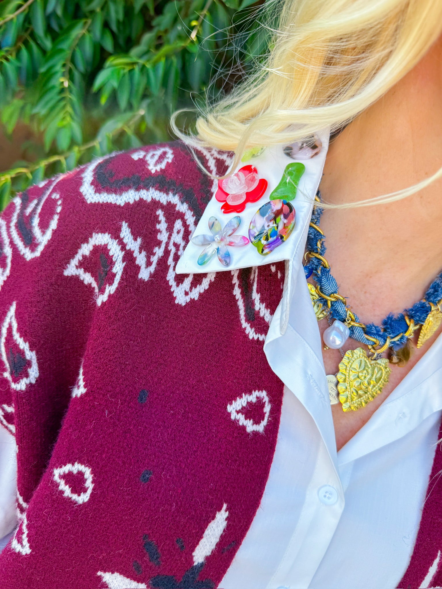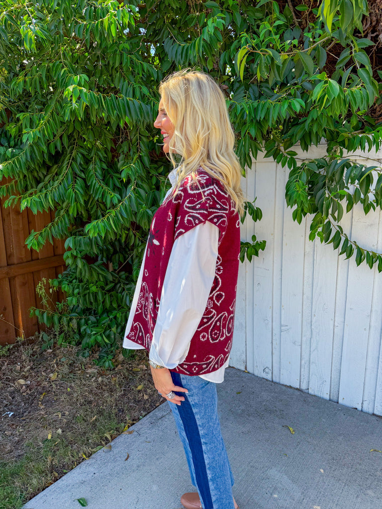 Bring a fun twist to your outfit with the Sway To The Music Vest in rich burgundy. Featuring a lively bandana print, this sweater vest adds a playful pop of pattern to your look while keeping you cozy.
