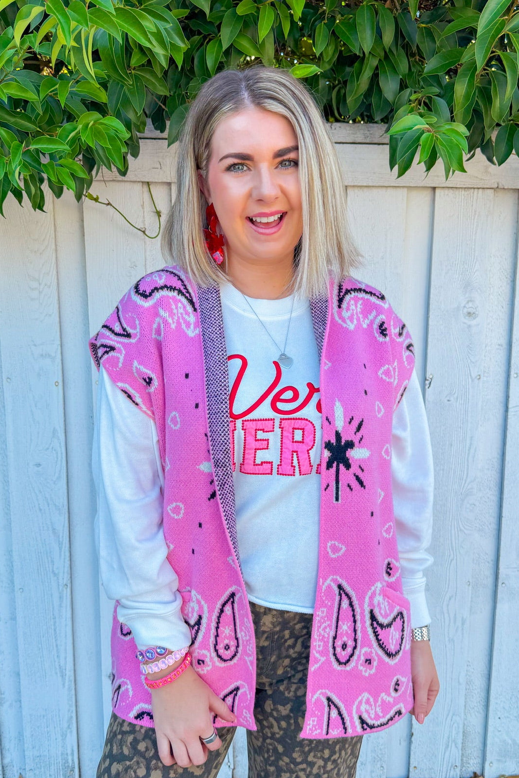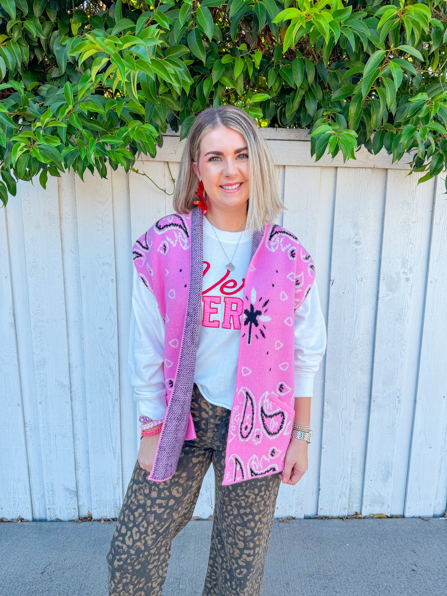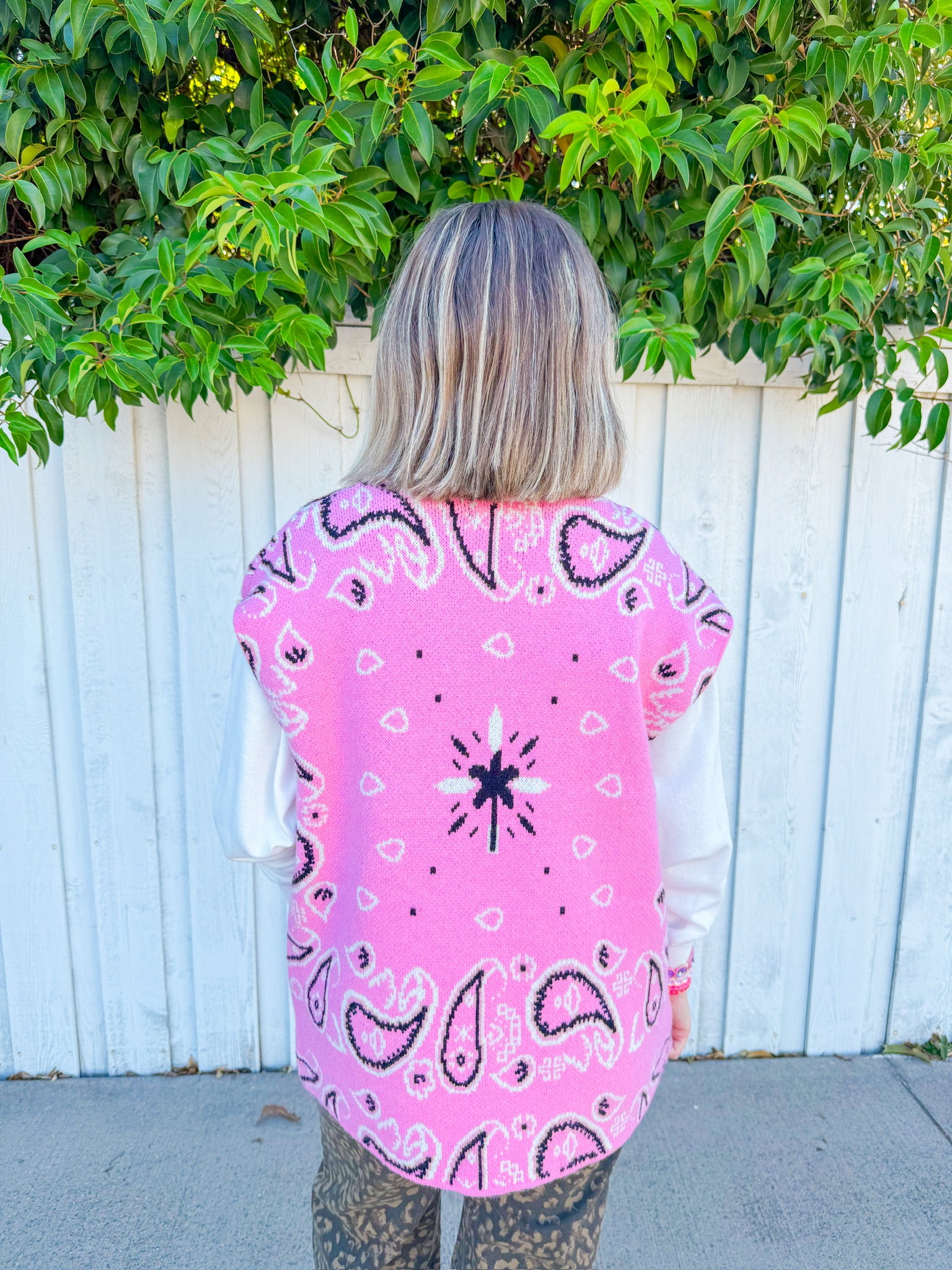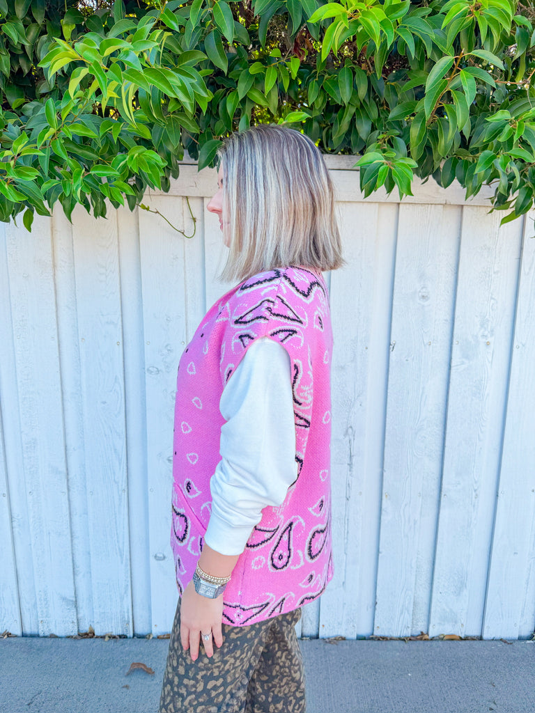 This pink sweater vest is your new favorite way to add a splash of fun to your closet. The eye-catching bandana print brings that carefree, boho-inspired vibe that makes getting dressed feel like a celebration.