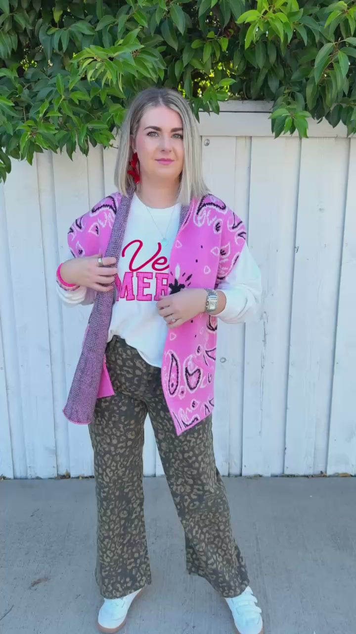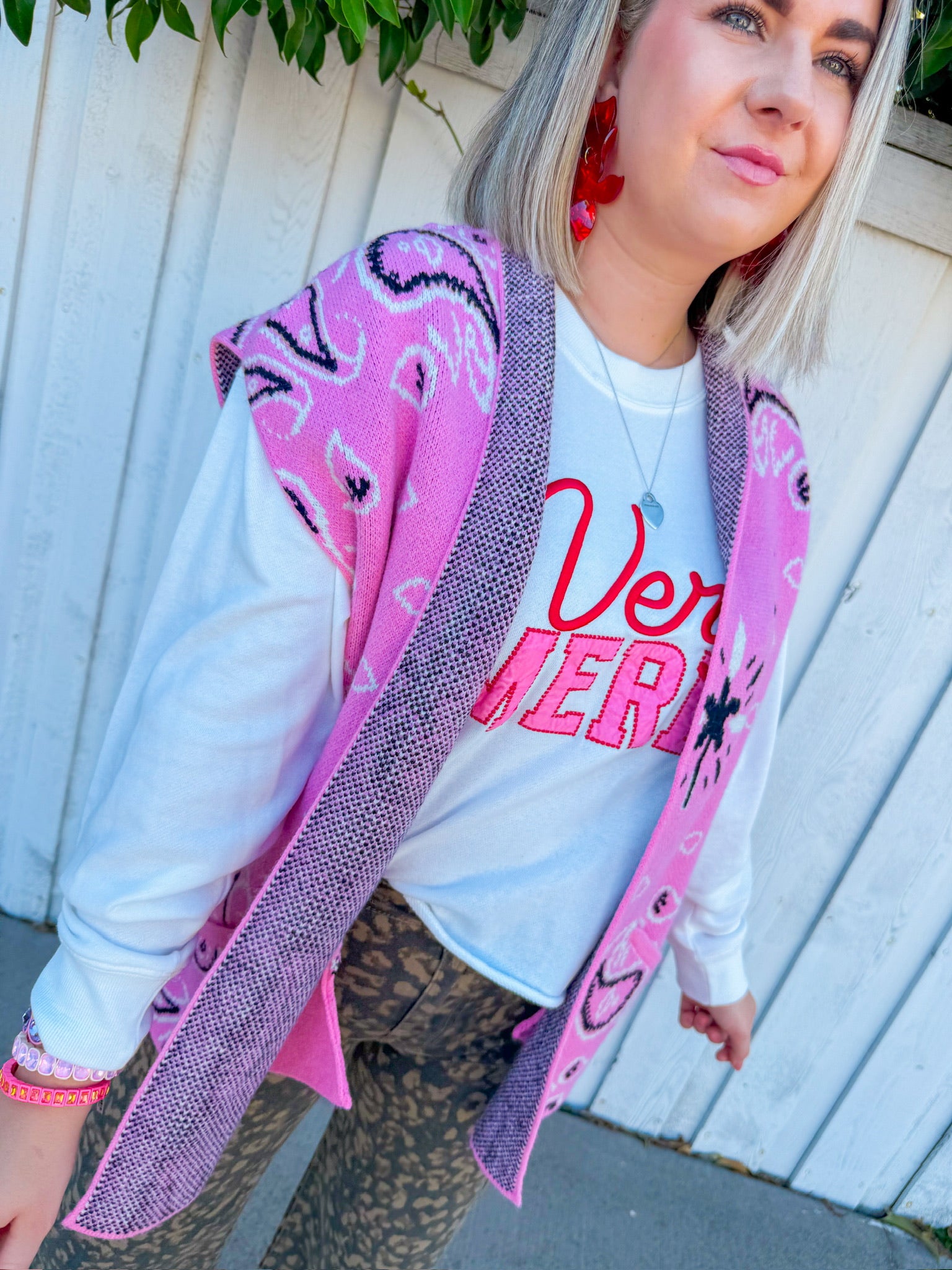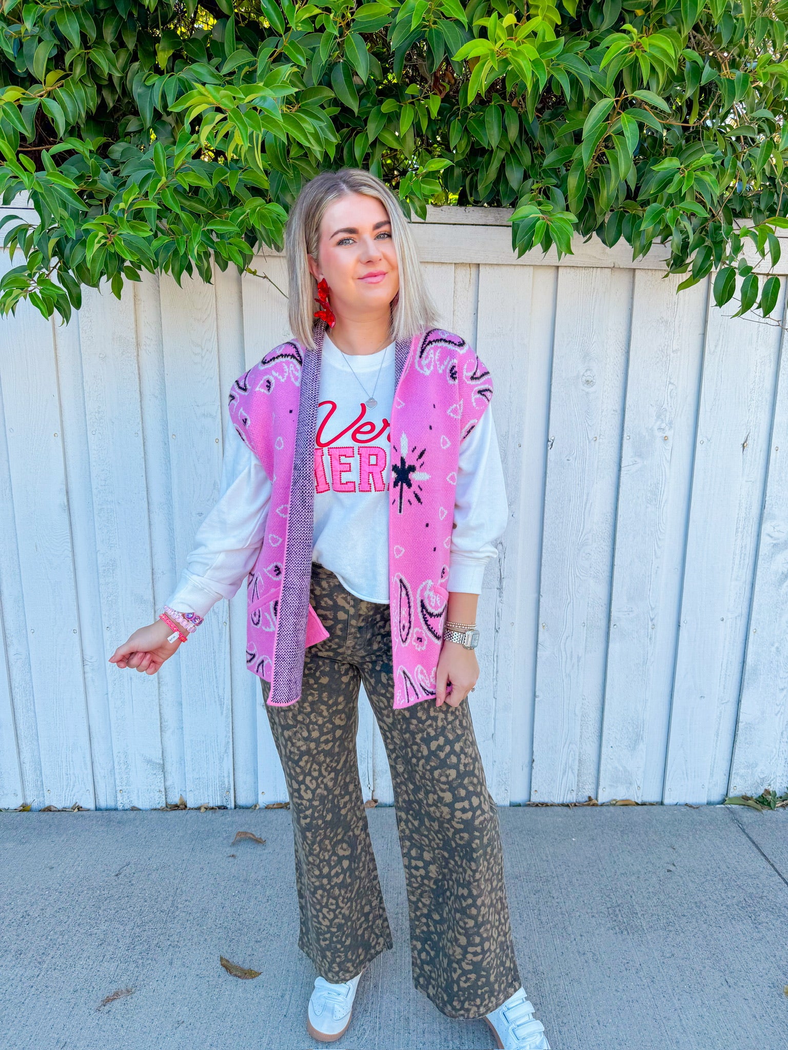 This pink sweater vest is your new favorite way to add a splash of fun to your closet. The eye-catching bandana print brings that carefree, boho-inspired vibe that makes getting dressed feel like a celebration.