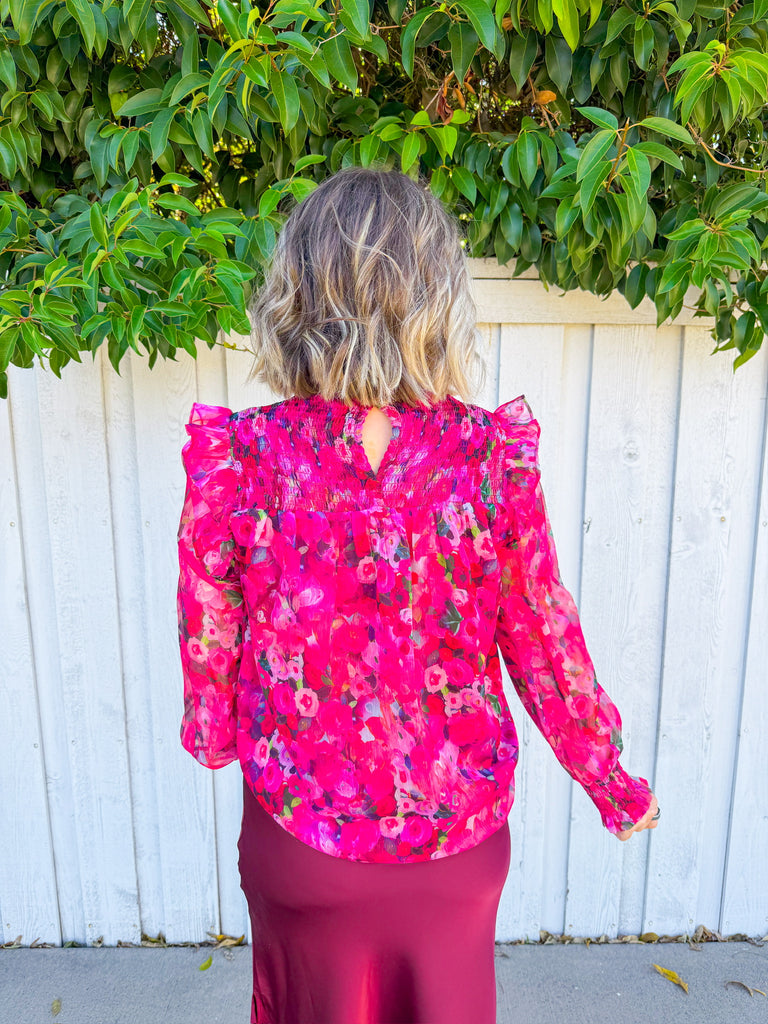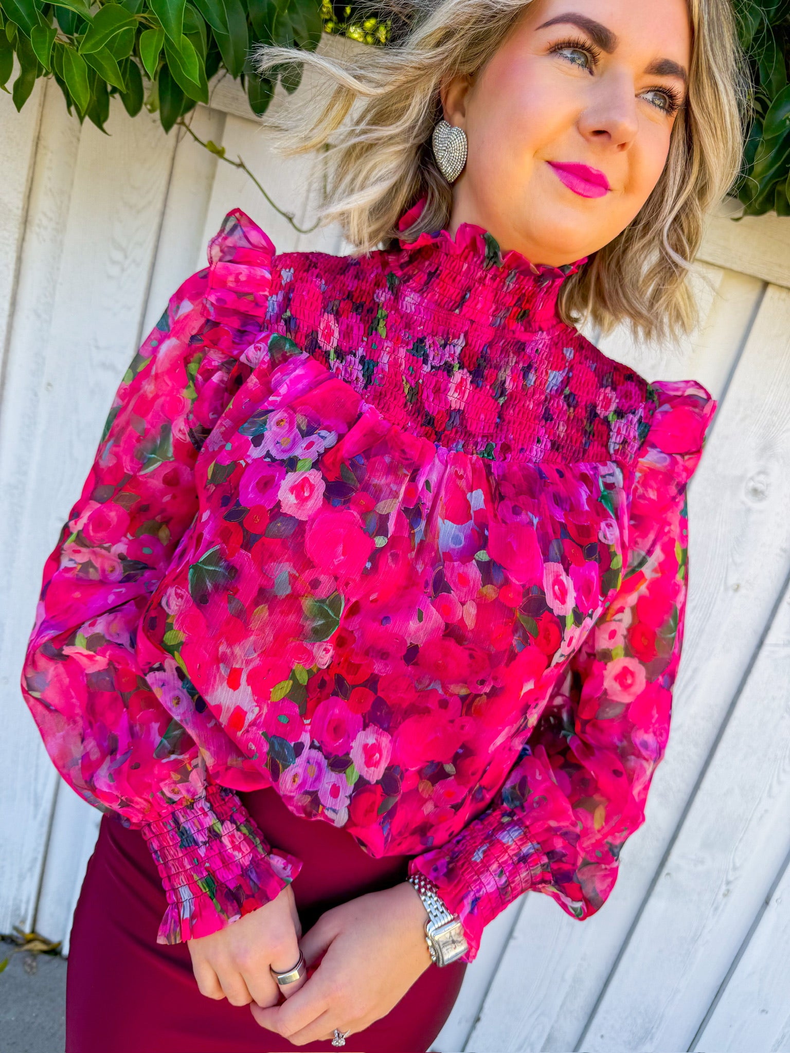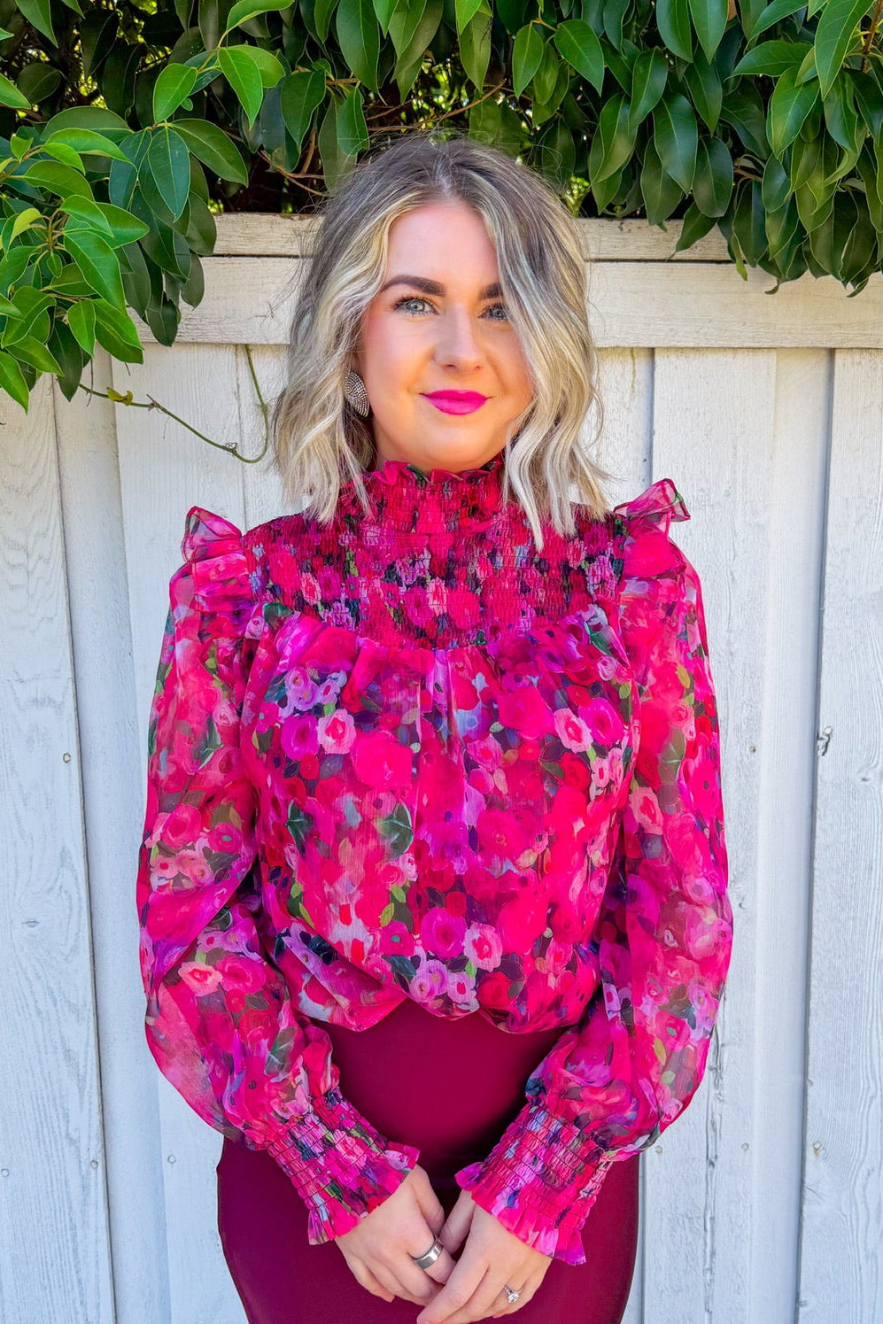 Embrace effortless elegance with this charming pink floral blouse. Delicate blooms dance across soft fabric, while the smocked neckline adds a touch of vintage-inspired detail that frames your face beautifully. Long sleeves provide versatile coverage for any season, making this piece perfect for layering or wearing solo.