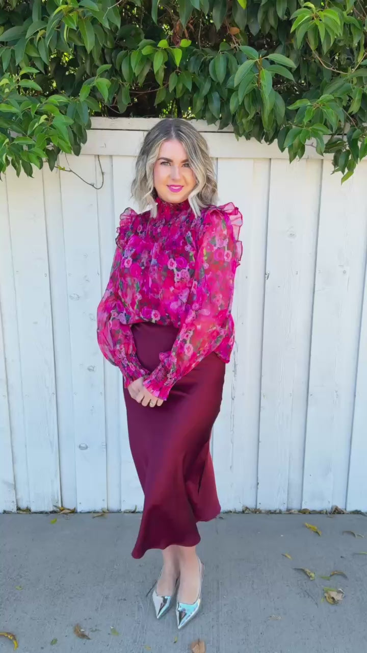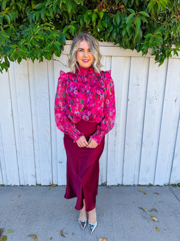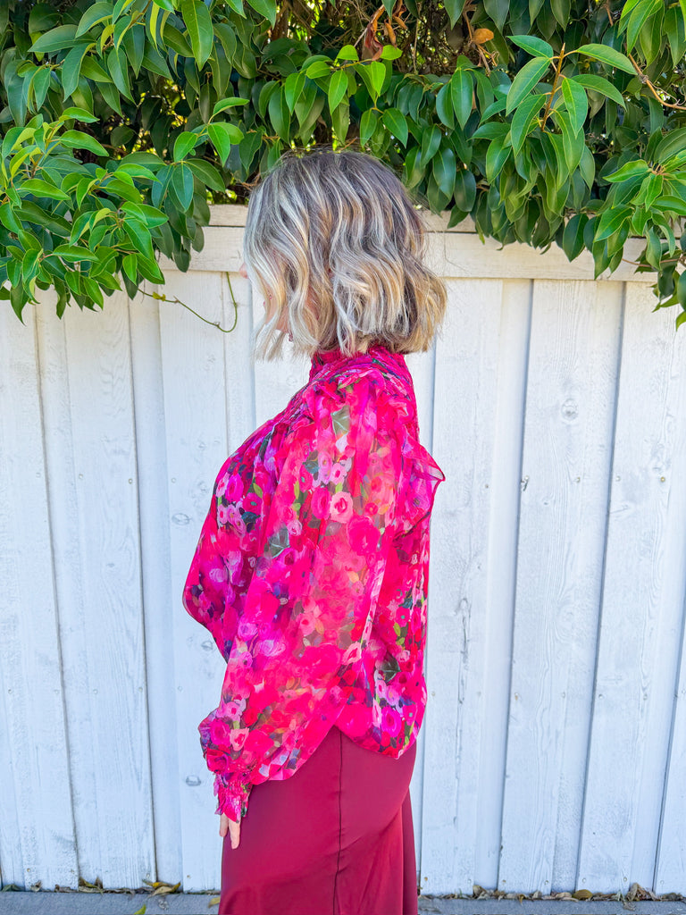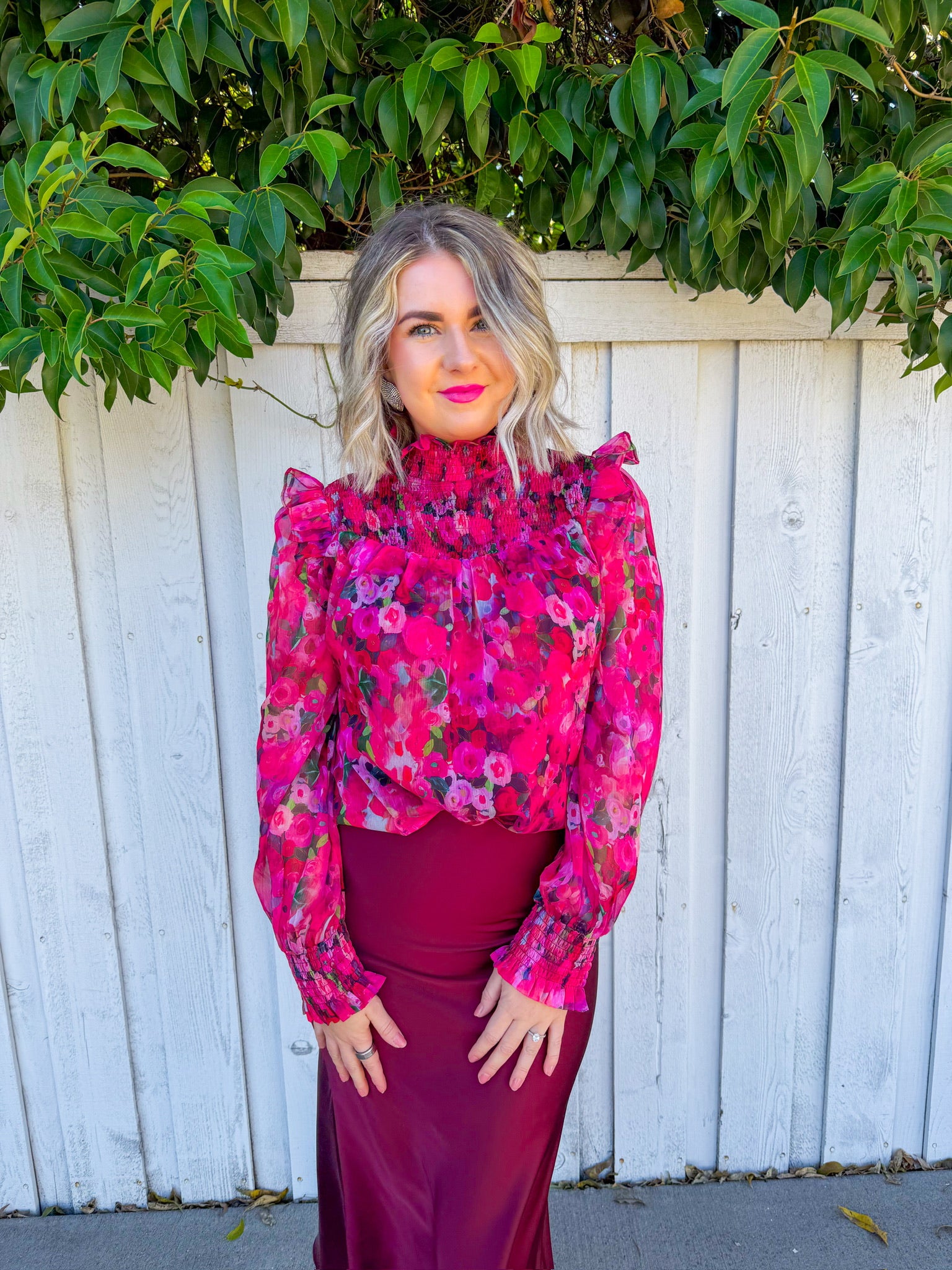 Embrace effortless elegance with this charming pink floral blouse. Delicate blooms dance across soft fabric, while the smocked neckline adds a touch of vintage-inspired detail that frames your face beautifully. Long sleeves provide versatile coverage for any season, making this piece perfect for layering or wearing solo.