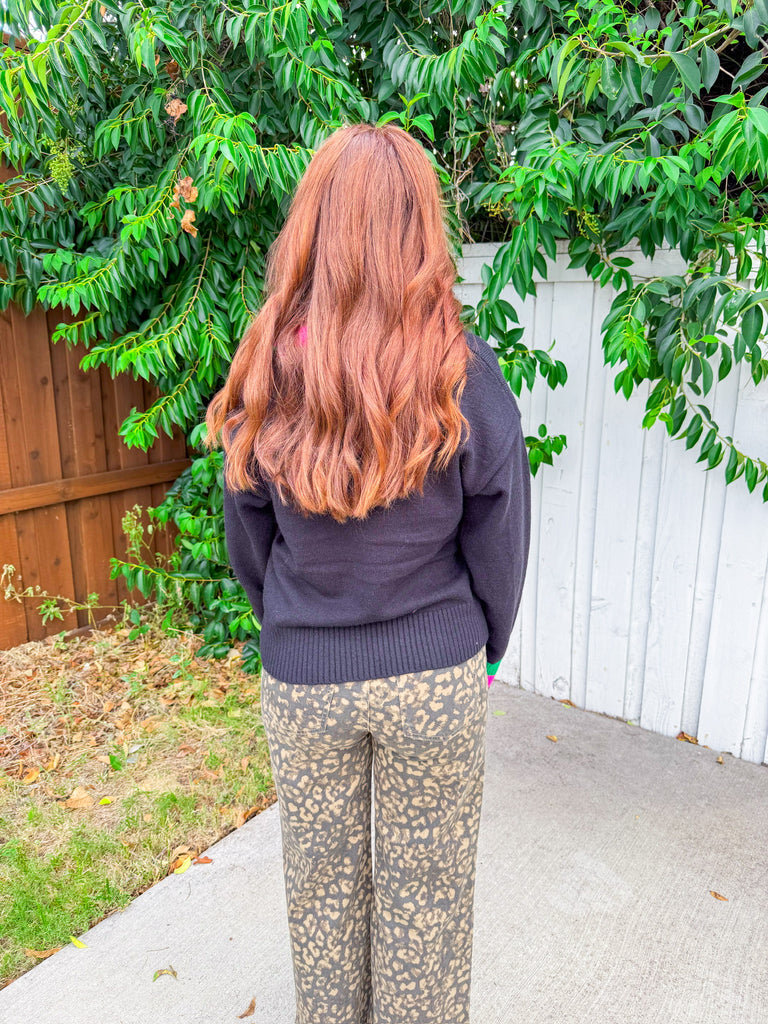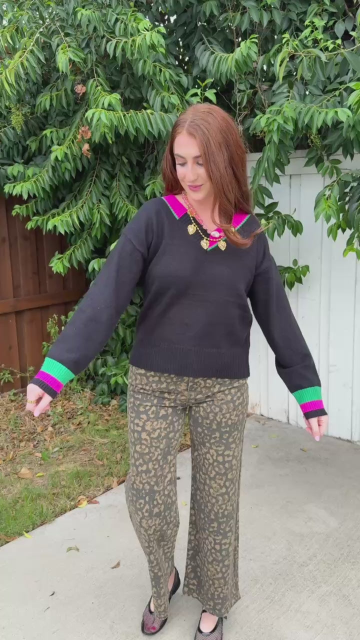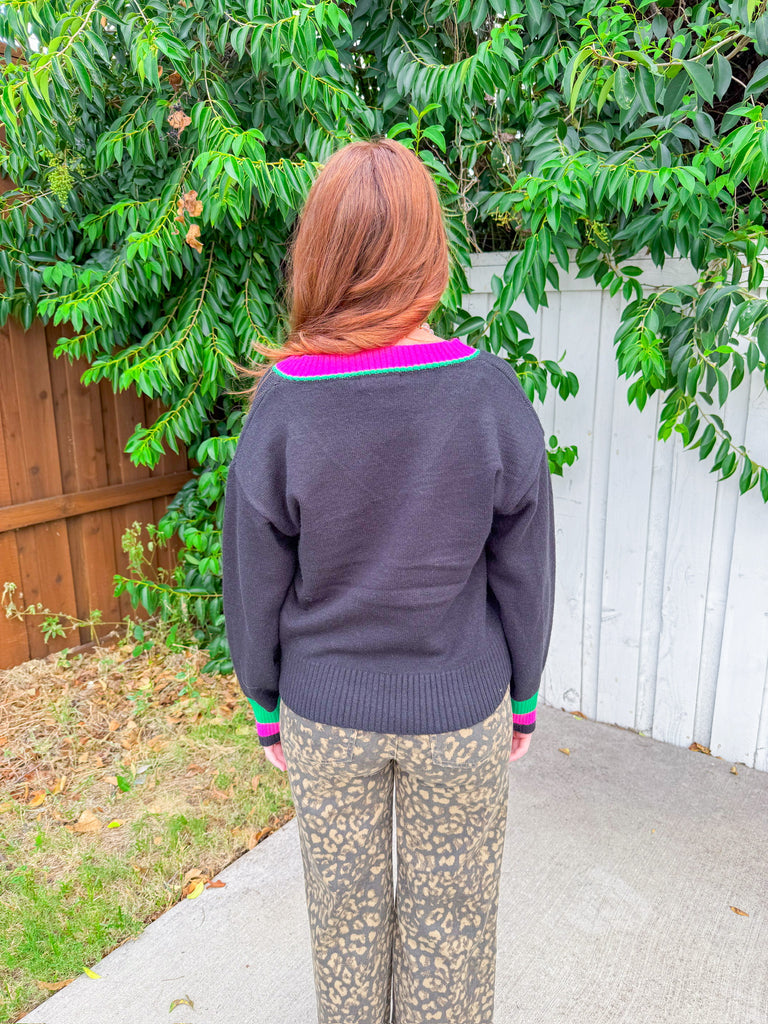 This black sweater charms with playful pink and green trim details that add a pop of fun and flair to your cozy look.