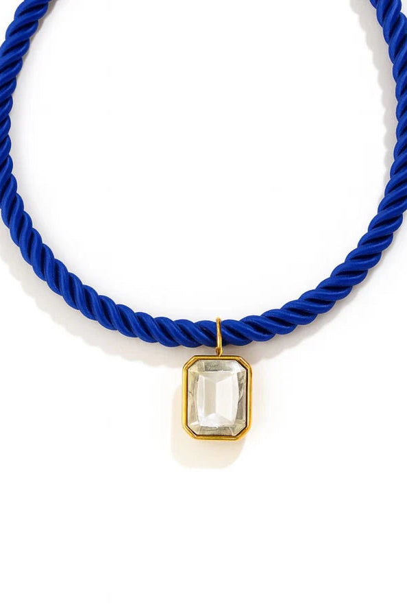 - Bold cobalt blue cord with gold-framed gemstone pendant