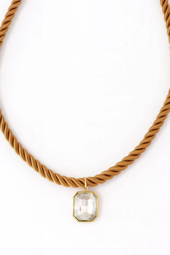 The Tailyn Rope Necklace in Copper pairs a rich, golden-brown rope with a sparkling rectangular crystal charm, creating a bold yet refined design. Measuring 15–18 inches with a 3-inch extender, this versatile piece is designed for layering or wearing solo. Its satin-finished cord provides a soft, elegant touch, while the gemstone charm adds just the right amount of sparkle.