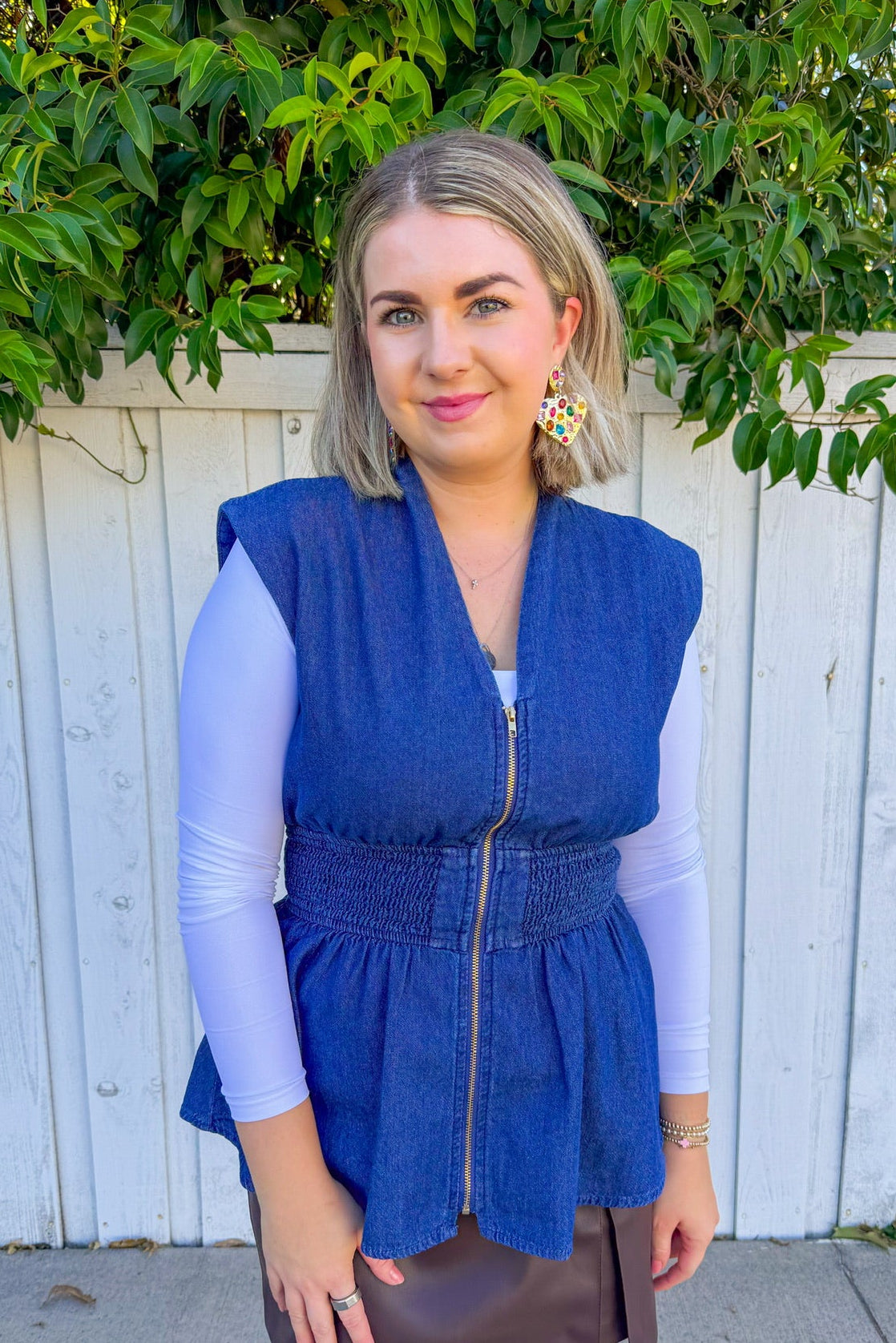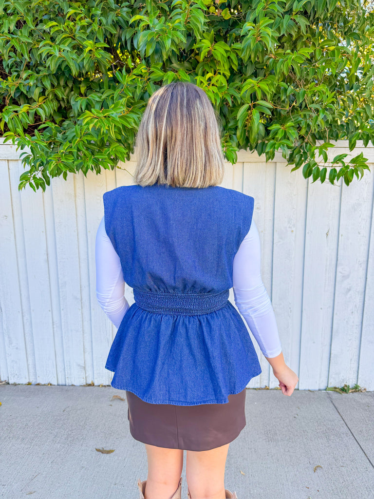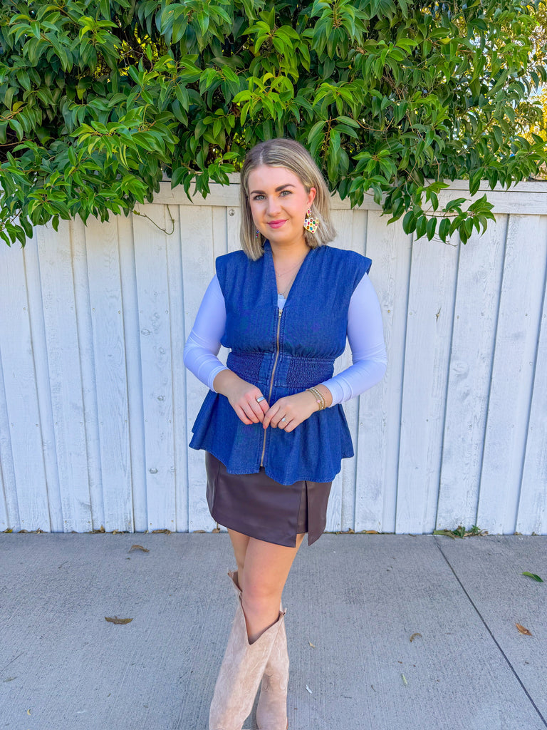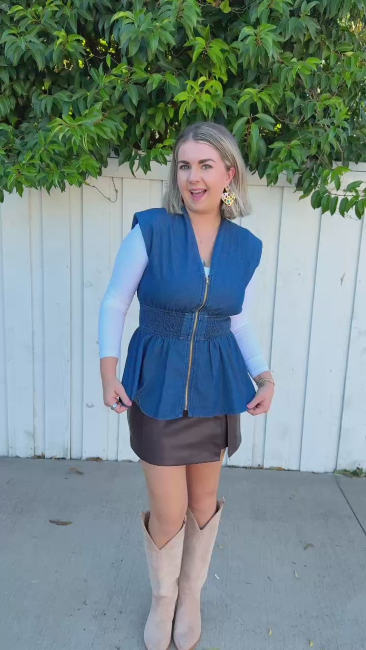 Sleeveless denim top with a full zip front and stretchy ribbed band for a comfortable, flattering fit. Perfect for layering over basics or wearing solo on warmer days.
