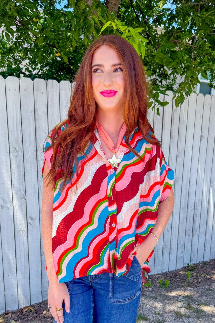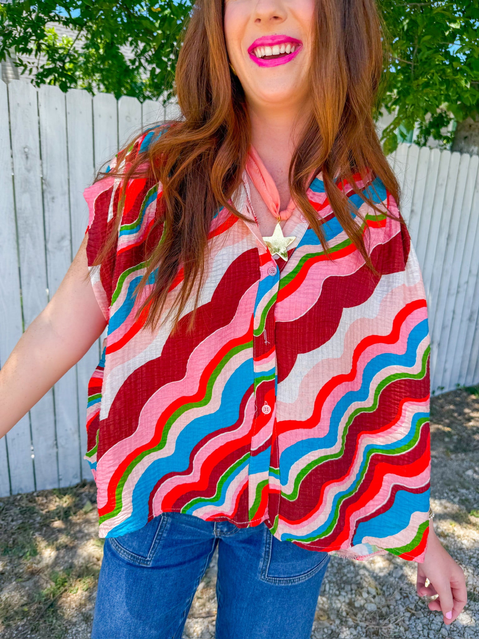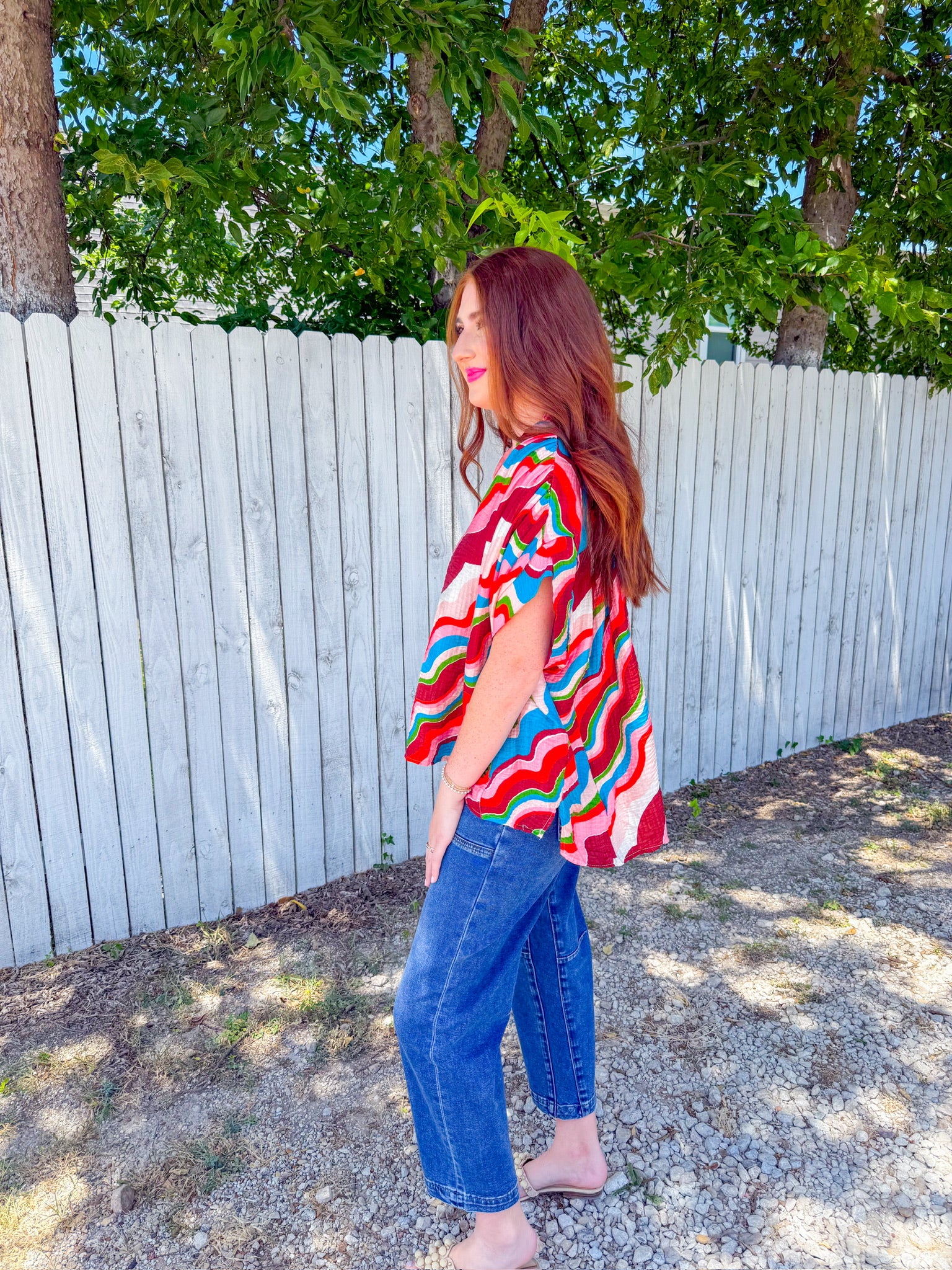 Style it with your favorite denim or a funky skirt and let the colors do all the talking—perfect for concerts, brunches, or just brightening up a regular Tuesday.
