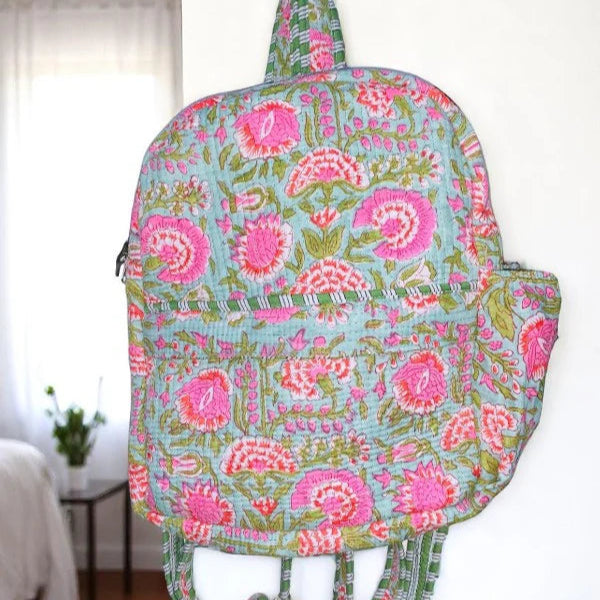 This dreamy floral backpack is the perfect mix of function and flair. With a soothing sage green background and bursts of bold pink and coral blooms, it's like carrying a garden on your back. The quilted cotton fabric adds a cozy touch, while the spacious interior, front pocket, and adjustable straps make it an everyday essential.