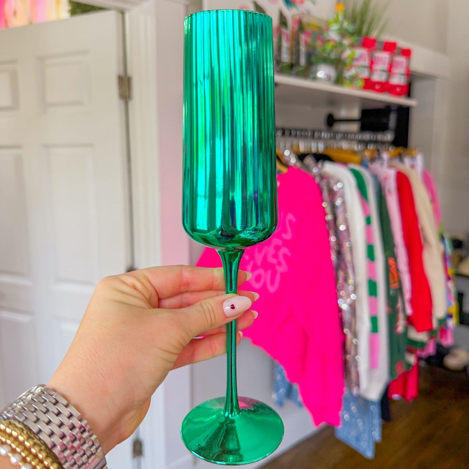The eye-catching reflective finish catches the light beautifully, making every celebration feel extra special. Whether you're hosting a dinner party, bridal shower, or girls' night in, this playful glassware adds a fun pop of color to your table. Cheers to making memories in Southern style.