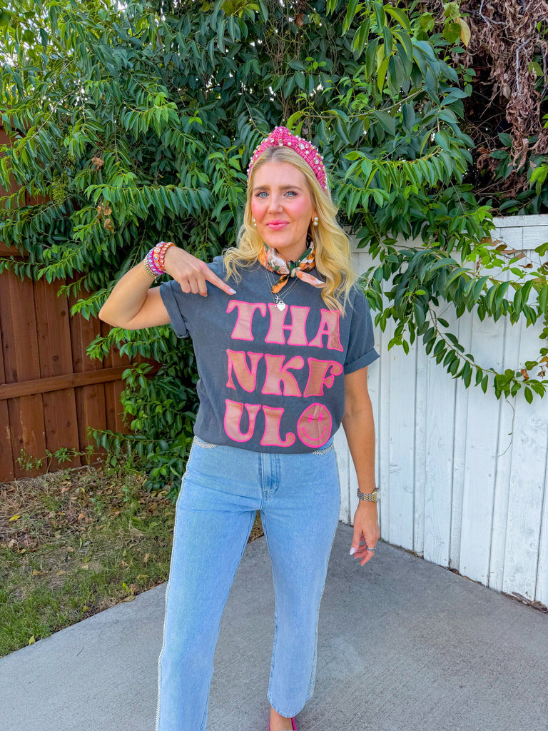 This charcoal graphic tee is a whole mood with its bold “THANKFUL” lettering in retro bubble font and a cheeky smiley face to match.