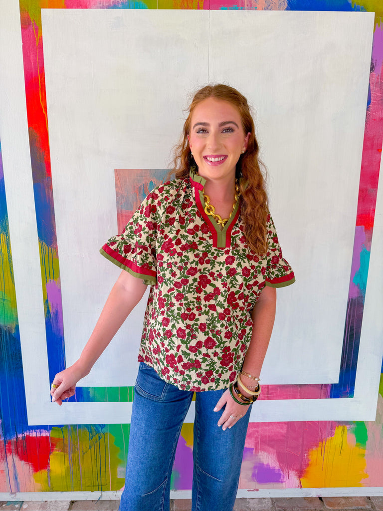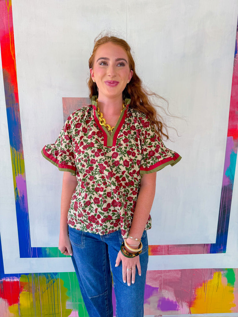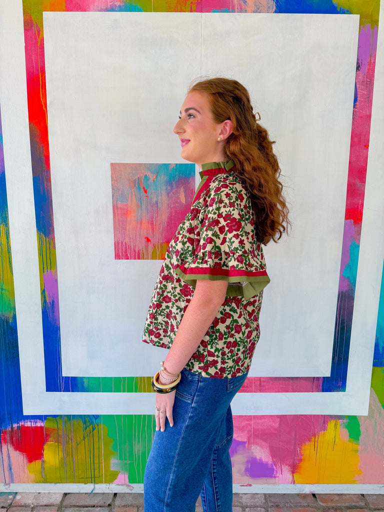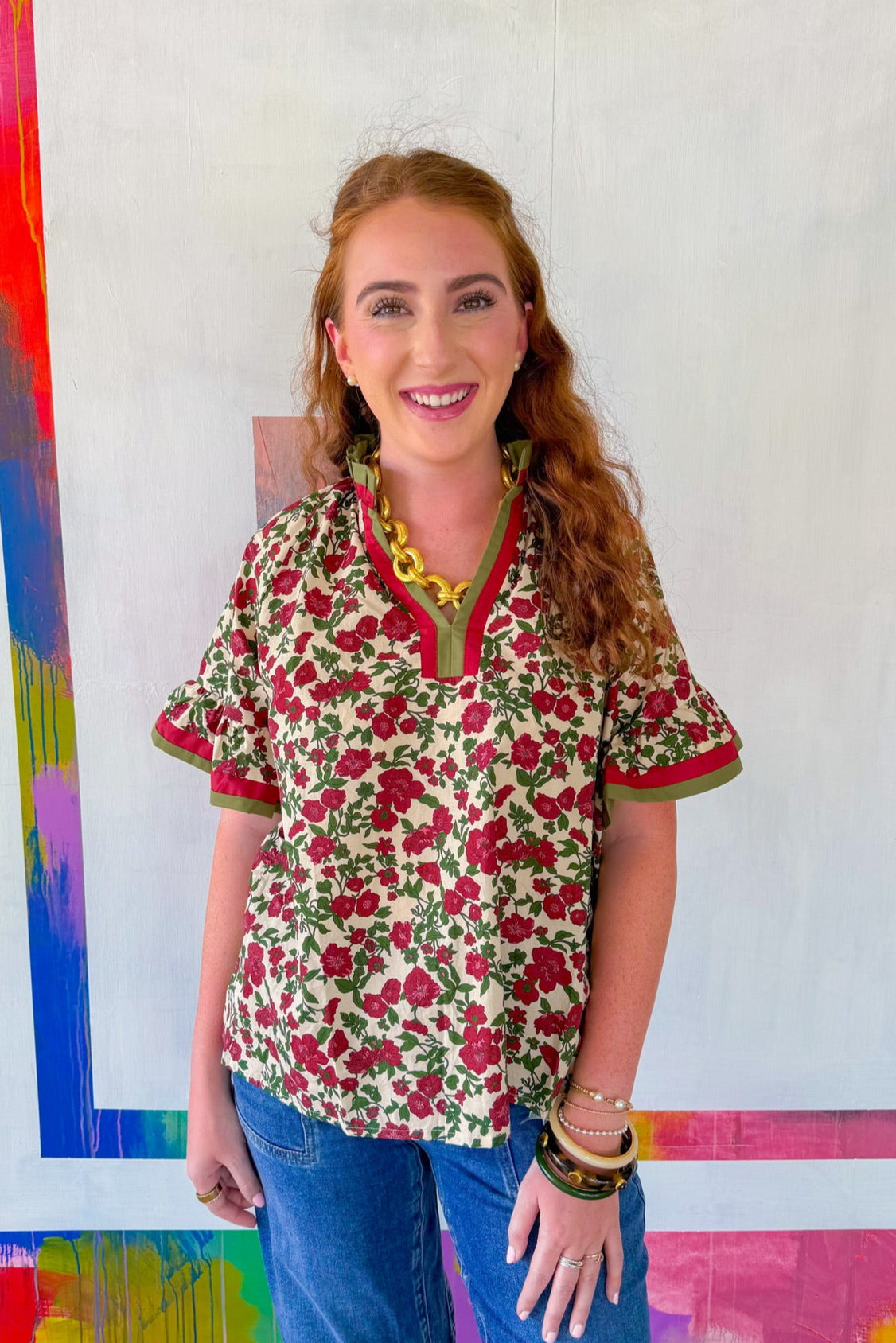This floral statement top pairs bold style with timeless details, featuring a rich burgundy and green print against an ecru background.