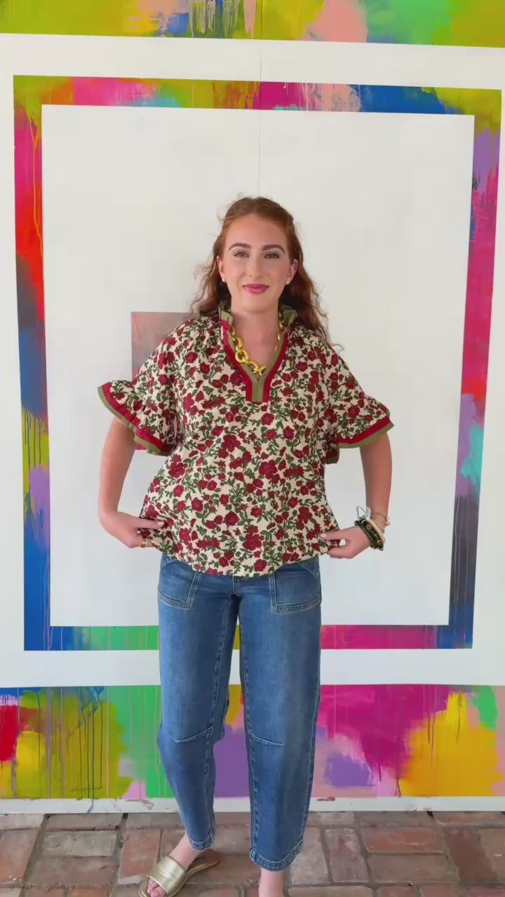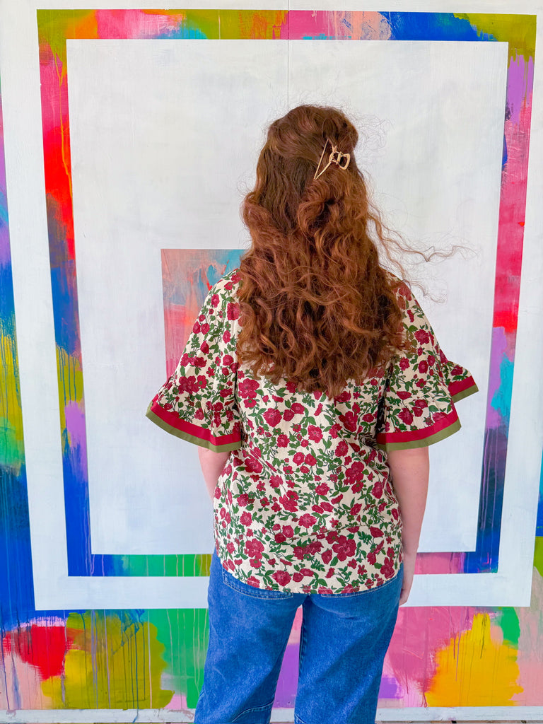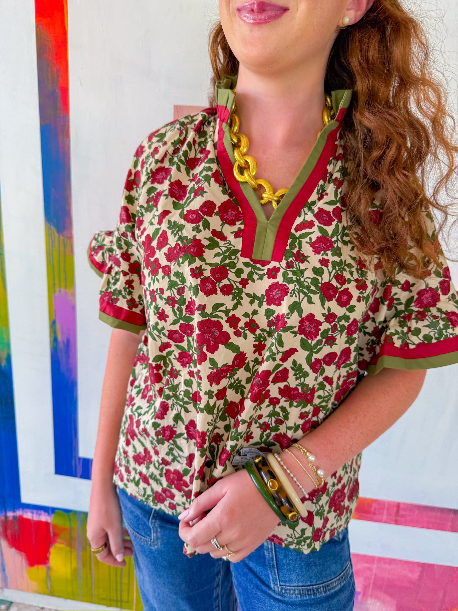 This floral statement top pairs bold style with timeless details, featuring a rich burgundy and green print against an ecru background.
