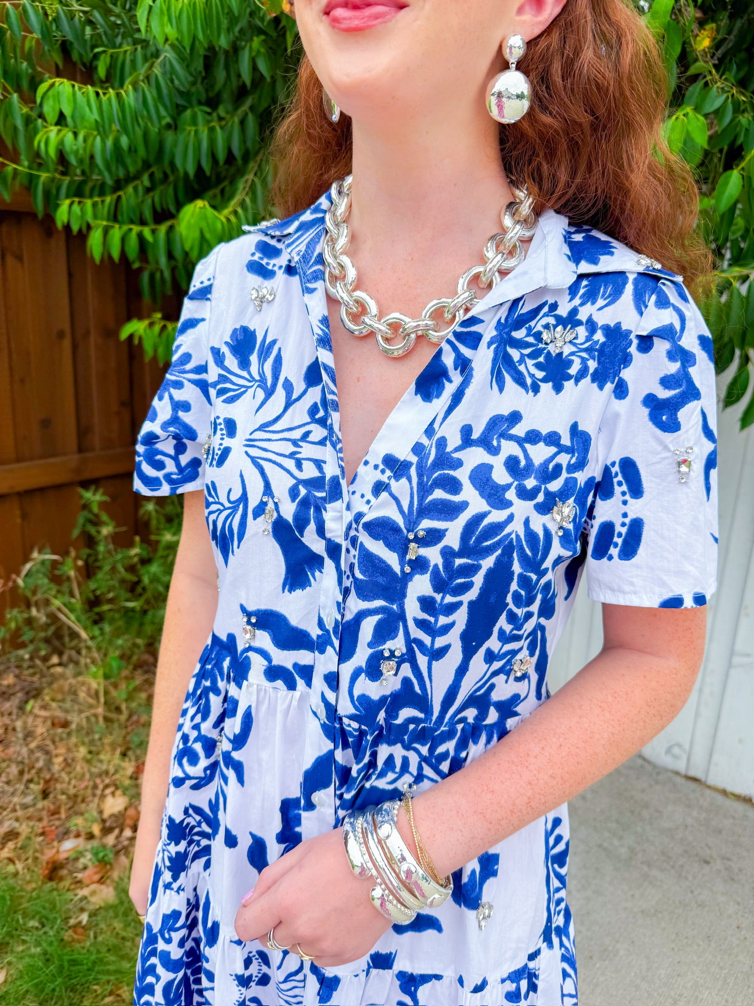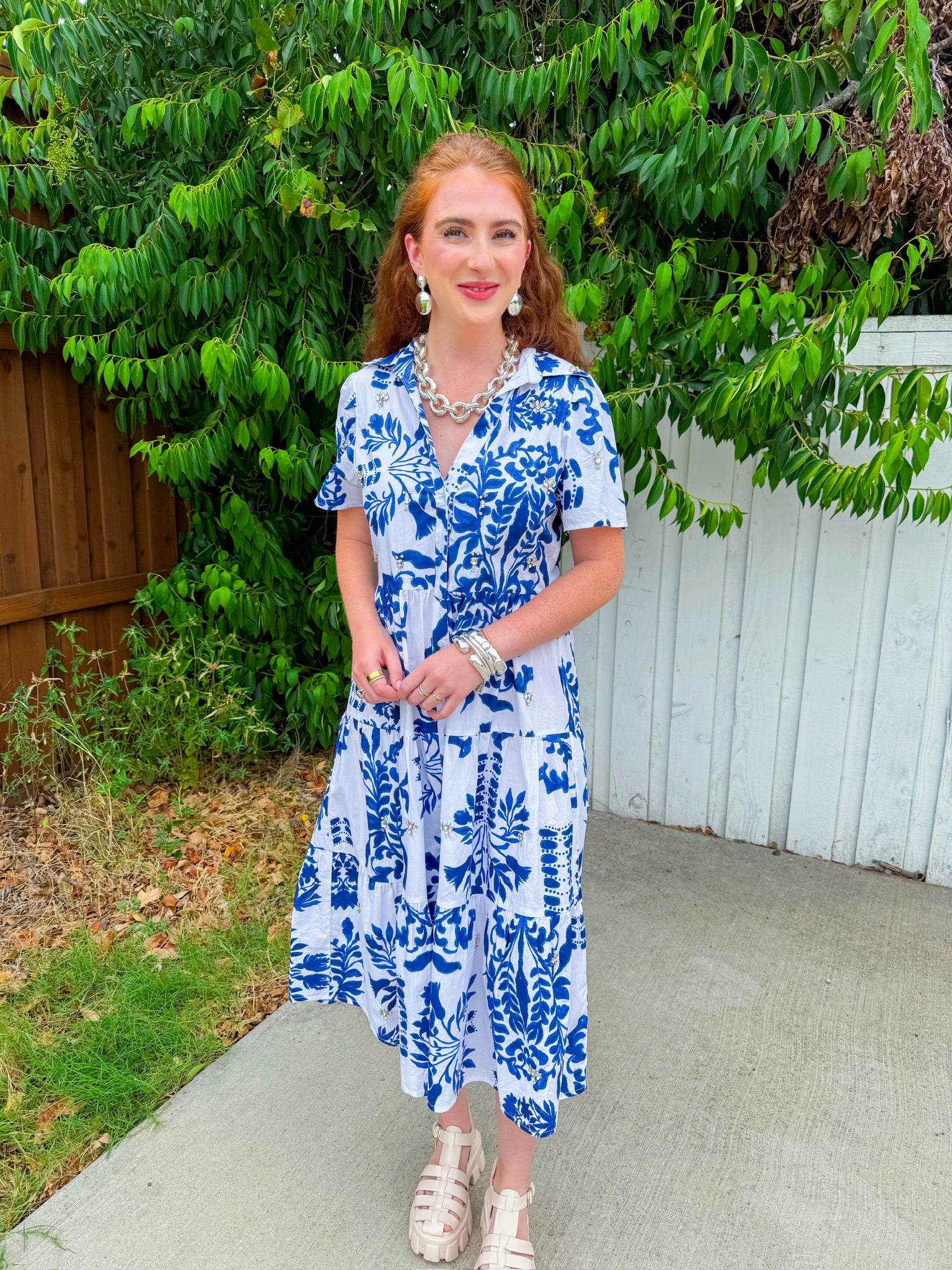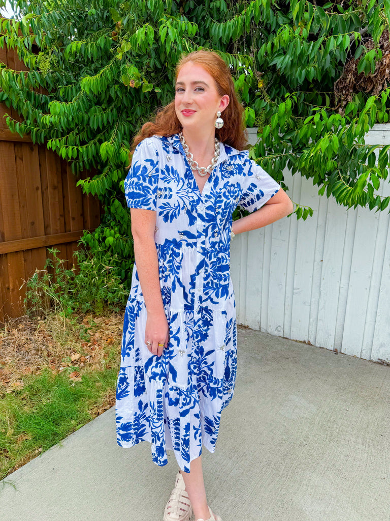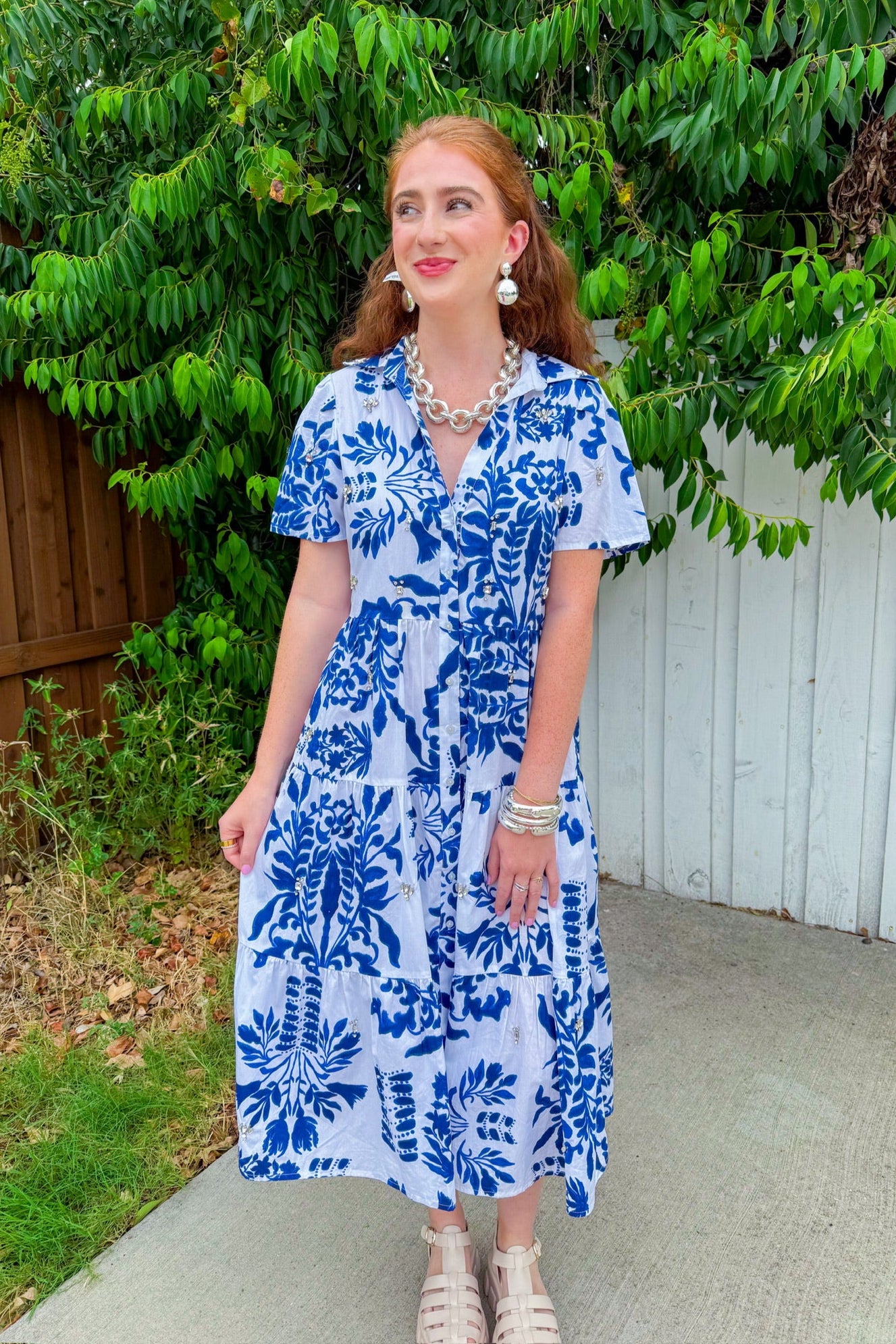 This Blue & White Midi Dress is timeless with its crisp white base and bold cobalt floral print, while rhinestone detailing adds the perfect touch of sparkle.