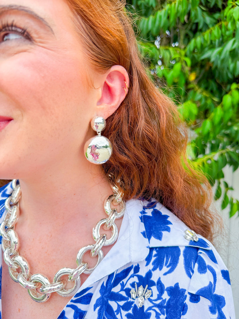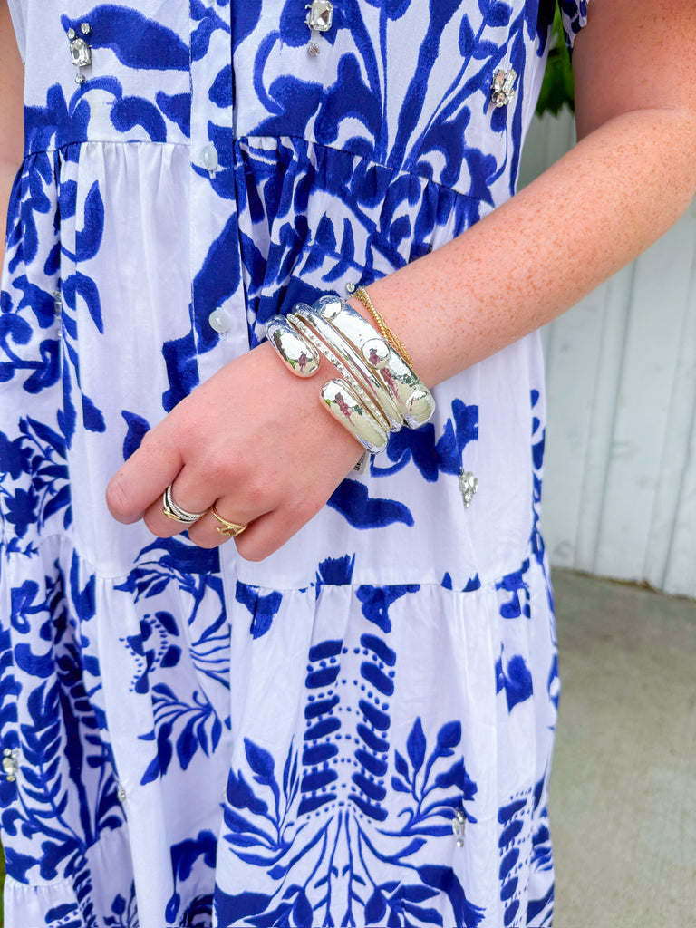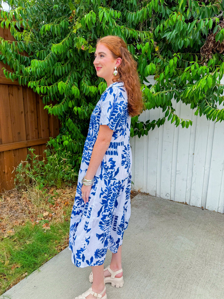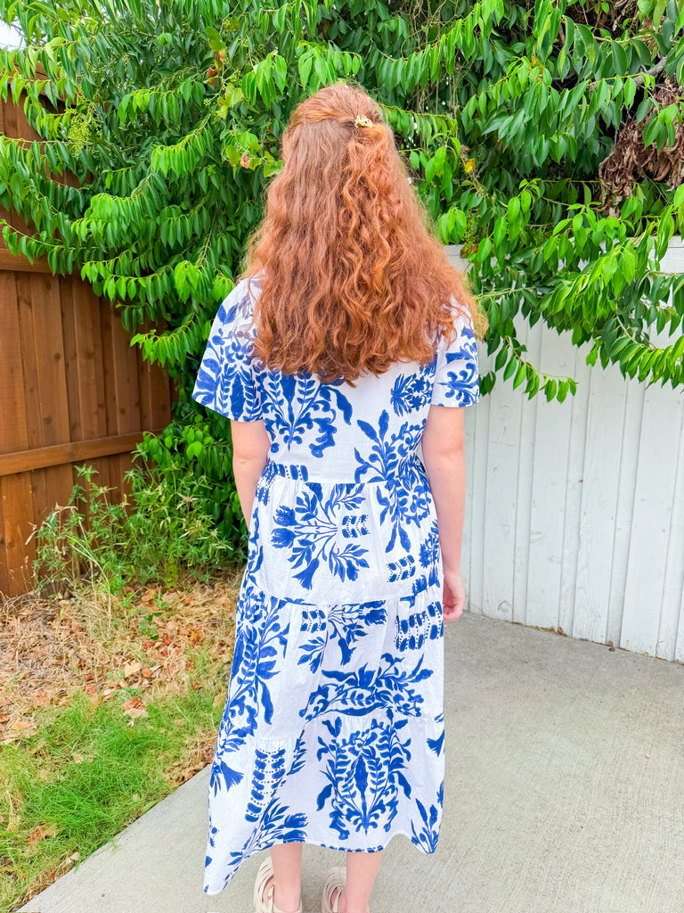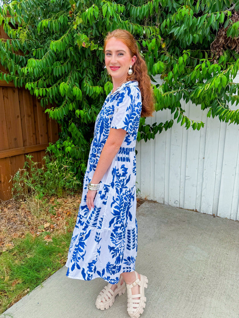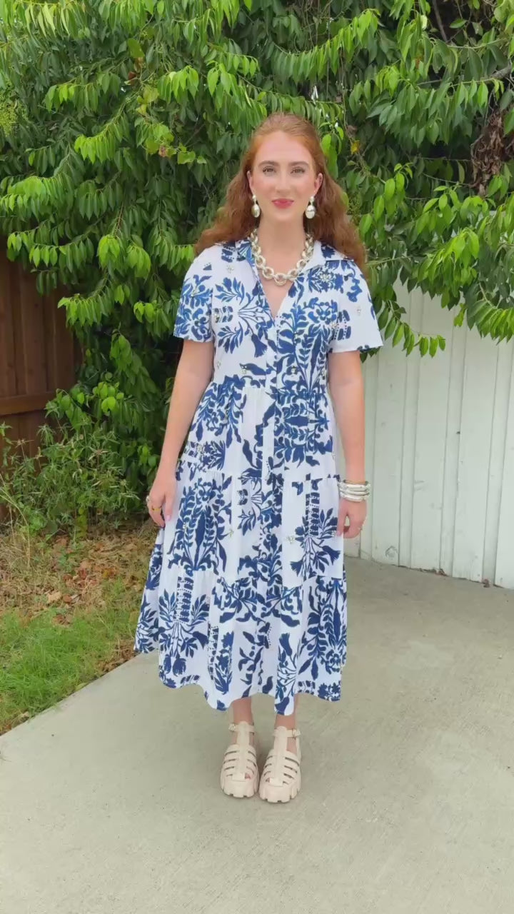 This Blue & White Midi Dress is timeless with its crisp white base and bold cobalt floral print, while rhinestone detailing adds the perfect touch of sparkle.