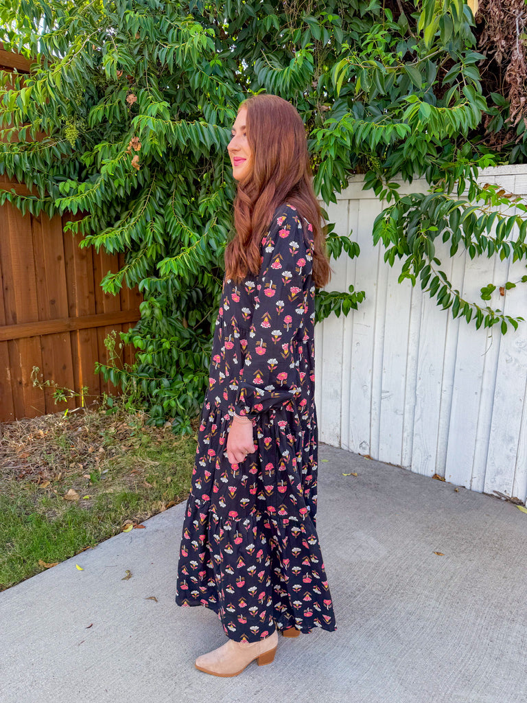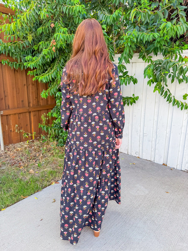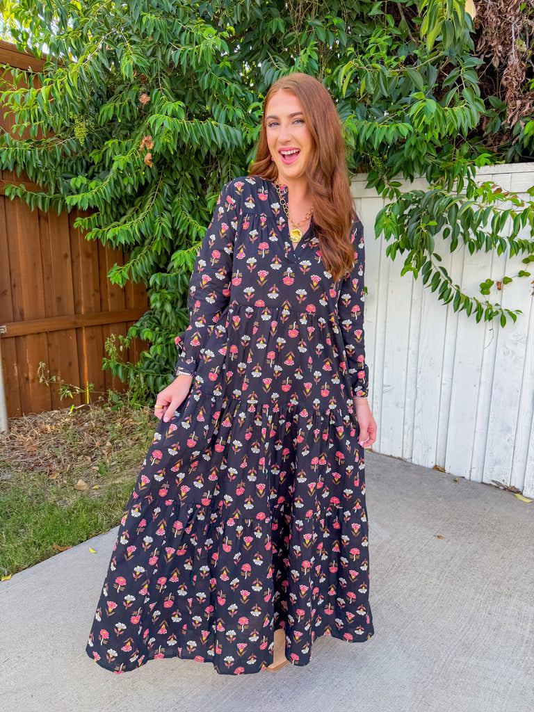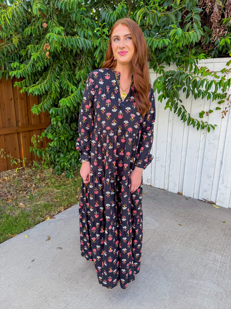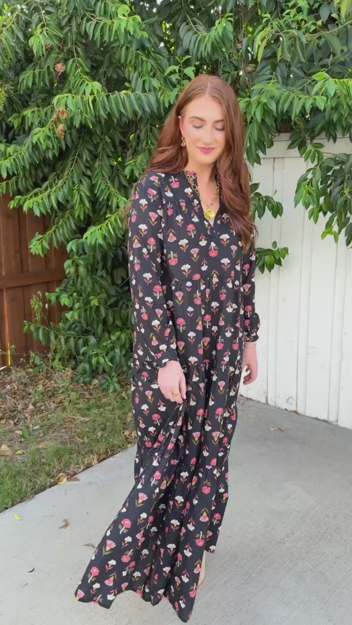 Embrace effortless elegance with the To The Fullest Maxi Dress in black. Its flowy fabric moves gracefully with every step, while the delicate mauve print adds a charming pop of color