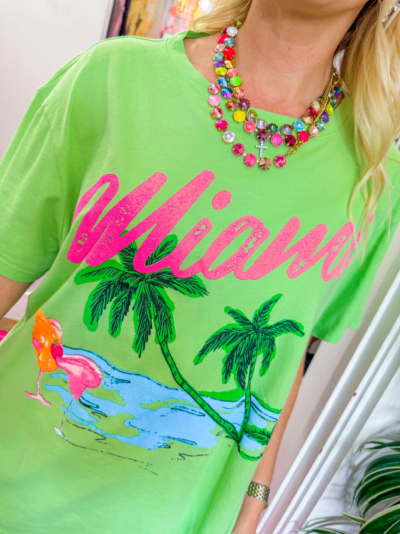 Welcome to Miami! This tee features a Miami graphic and a relaxed, oversized fit. An easy throw on over your Mumu swim or with denim for running errands.