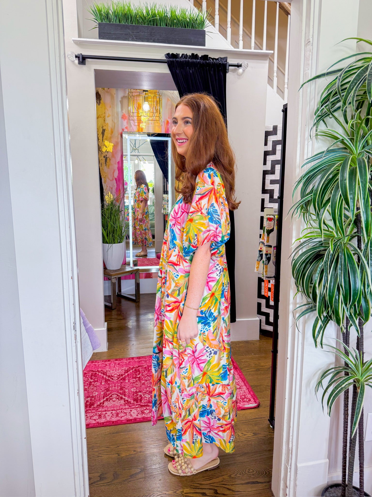 Looking for a dress that flatters your figure while keeping you cool in warm weather? The Tropical Paradise Midi Dress solves the common styling challenge of finding a piece that's both comfortable and versatile enough for multiple occasions. Its vibrant multi-color tropical print works seamlessly from casual daytime outings to evening events, eliminating the need for separate wardrobes. The midi length provides elegant coverage while the breathable fabric keeps you comfortable in heat and humidity. Perfect for those seeking a single dress that transitions effortlessly across seasons and settings without sacrificing style or confidence.