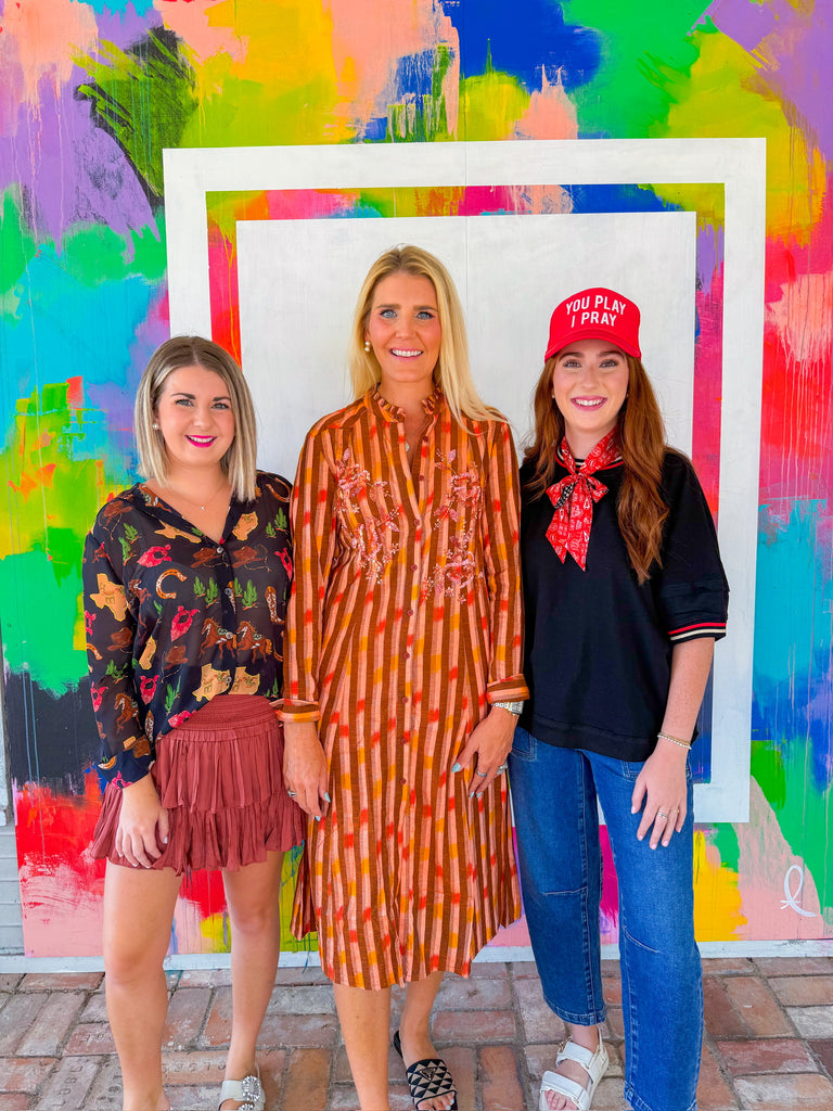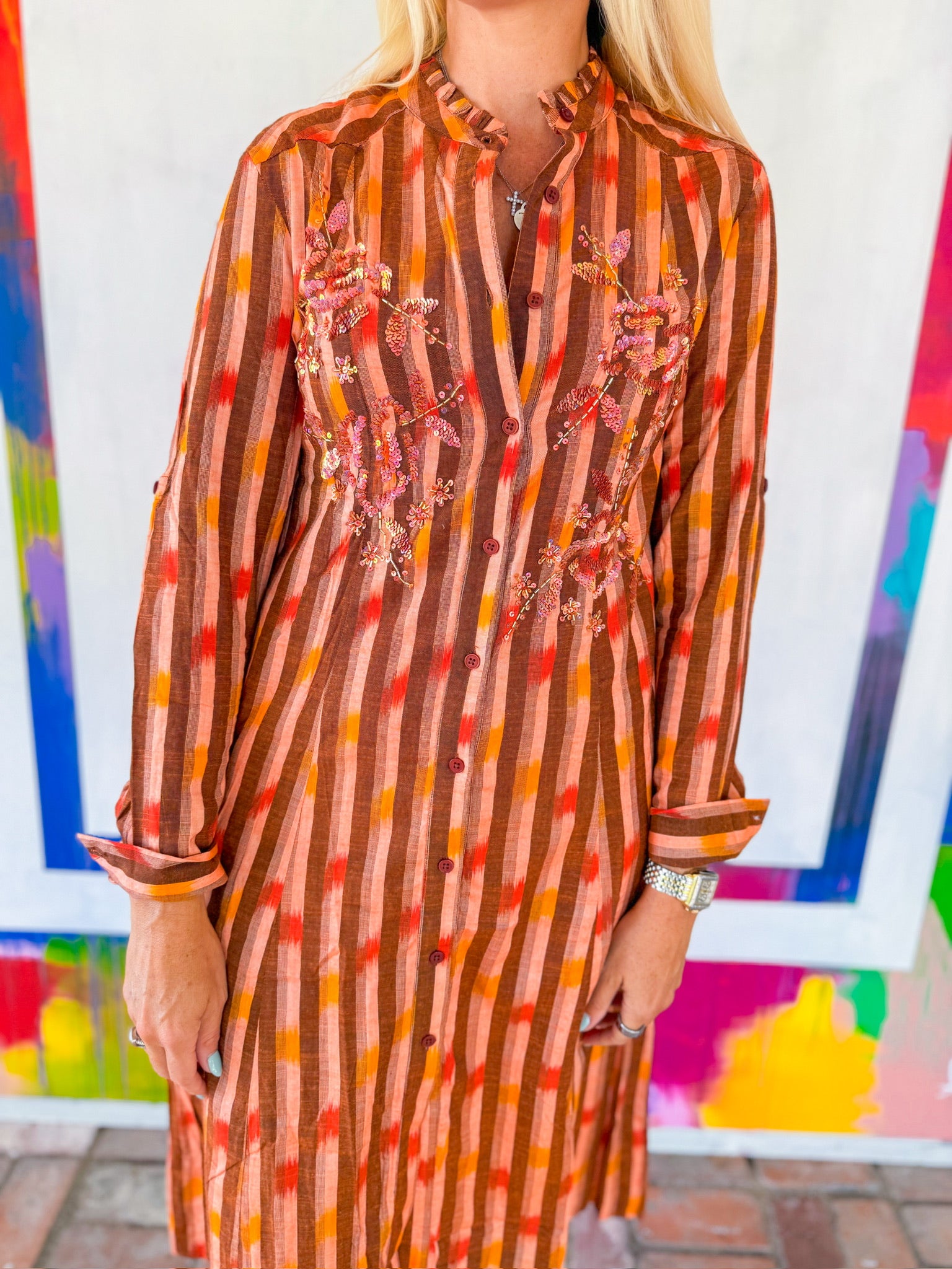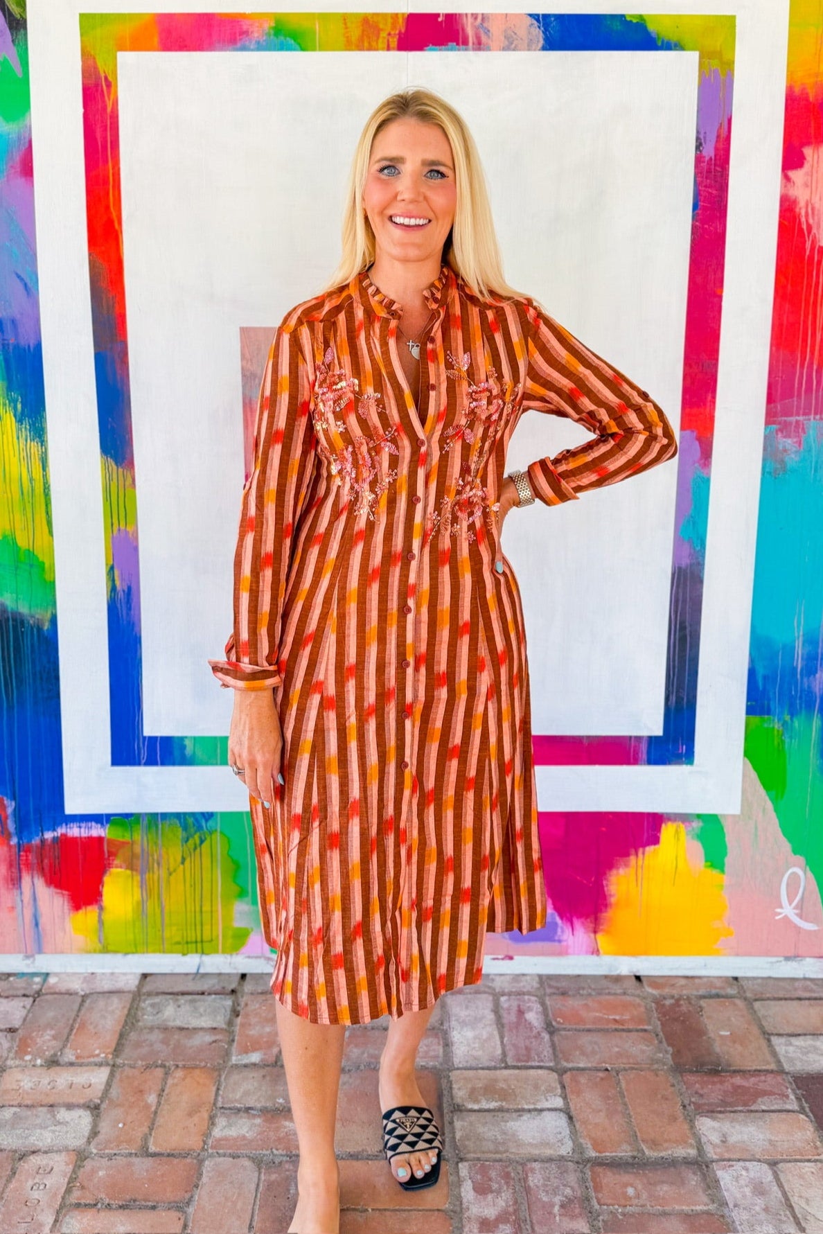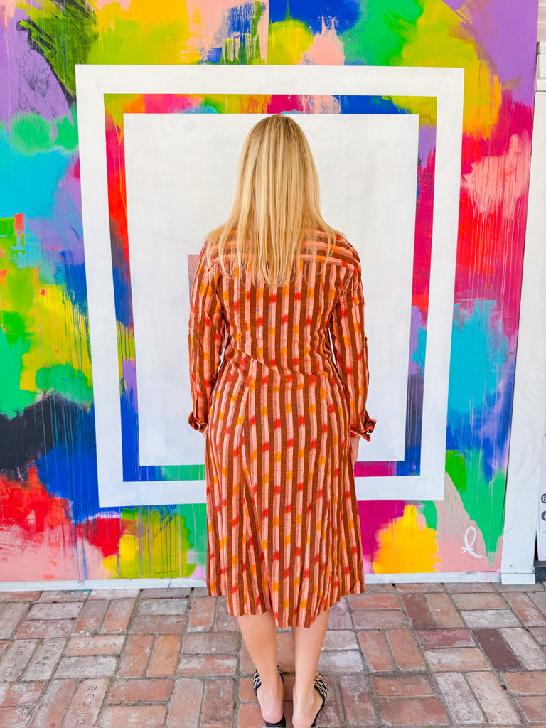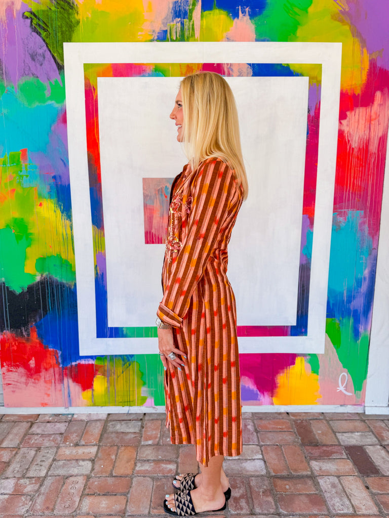 This orange and brown striped midi dress is fall in a look—with its rich warm tones, flowy silhouette, and embroidered floral detailing that adds just the right touch of whimsy.
