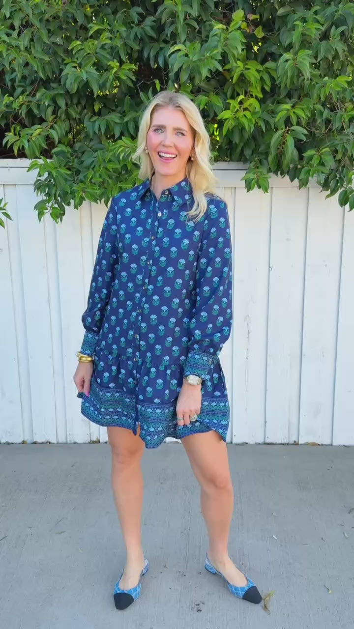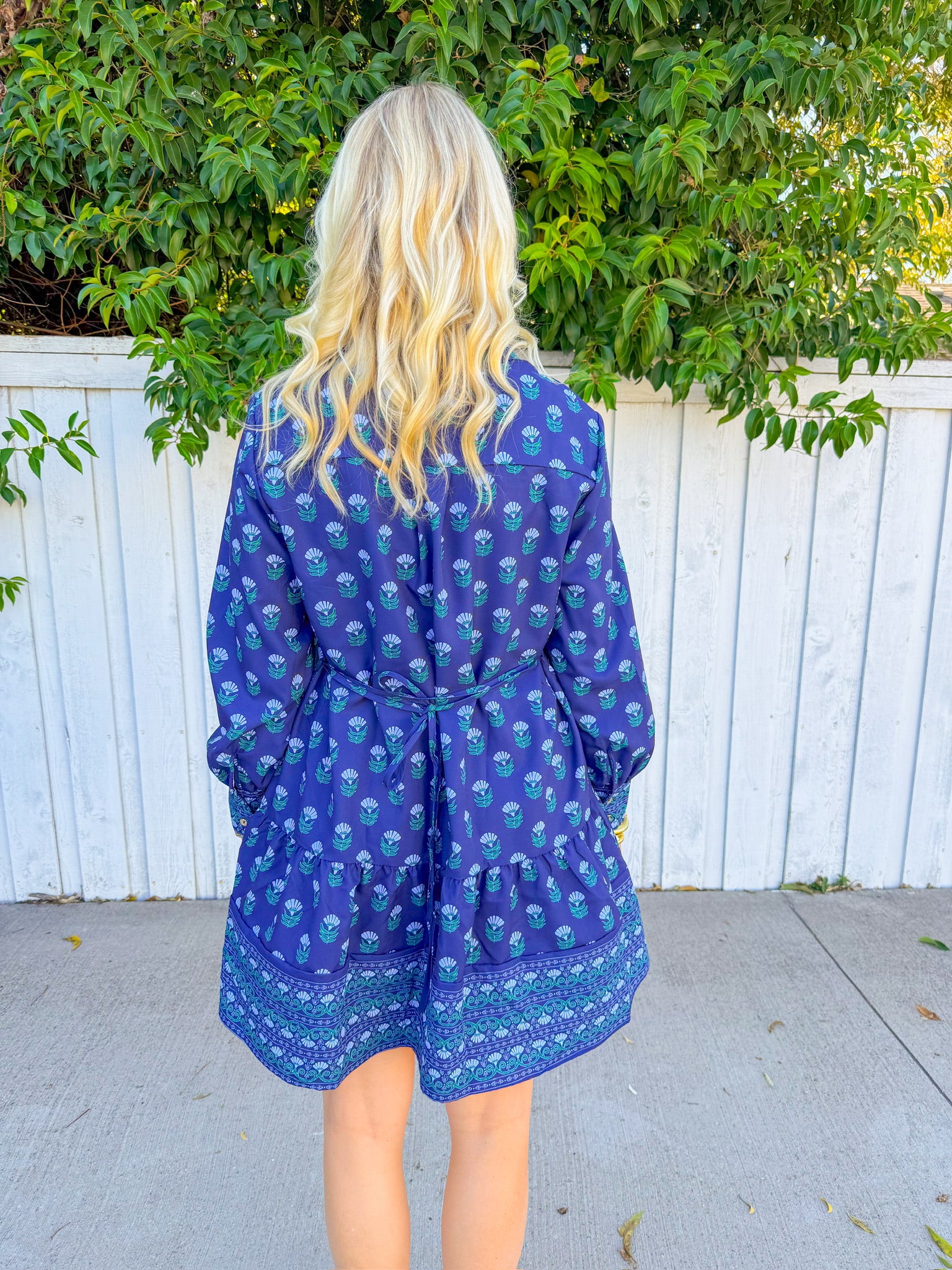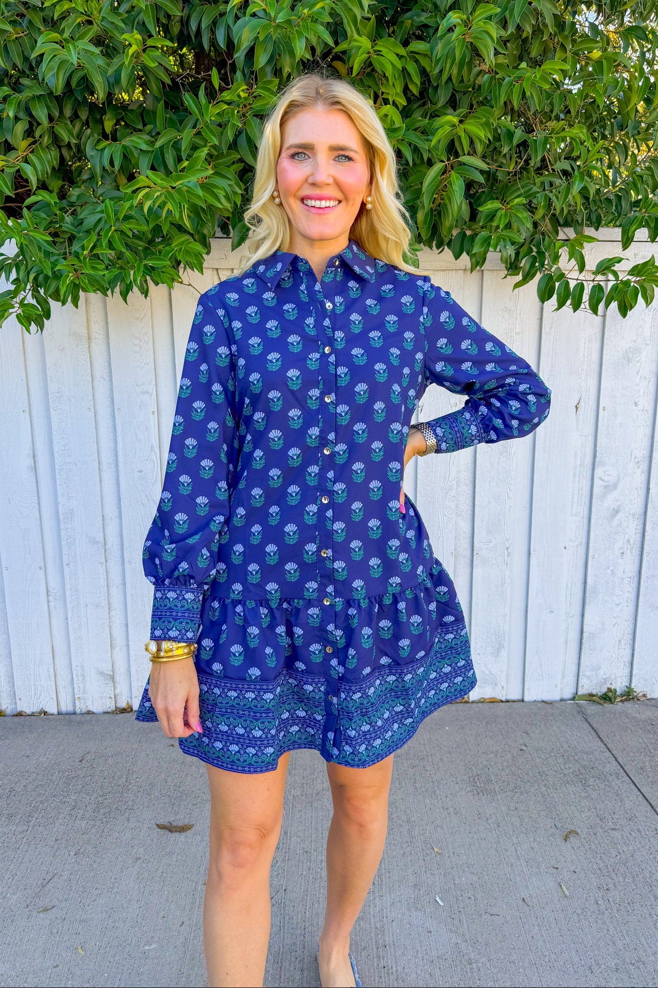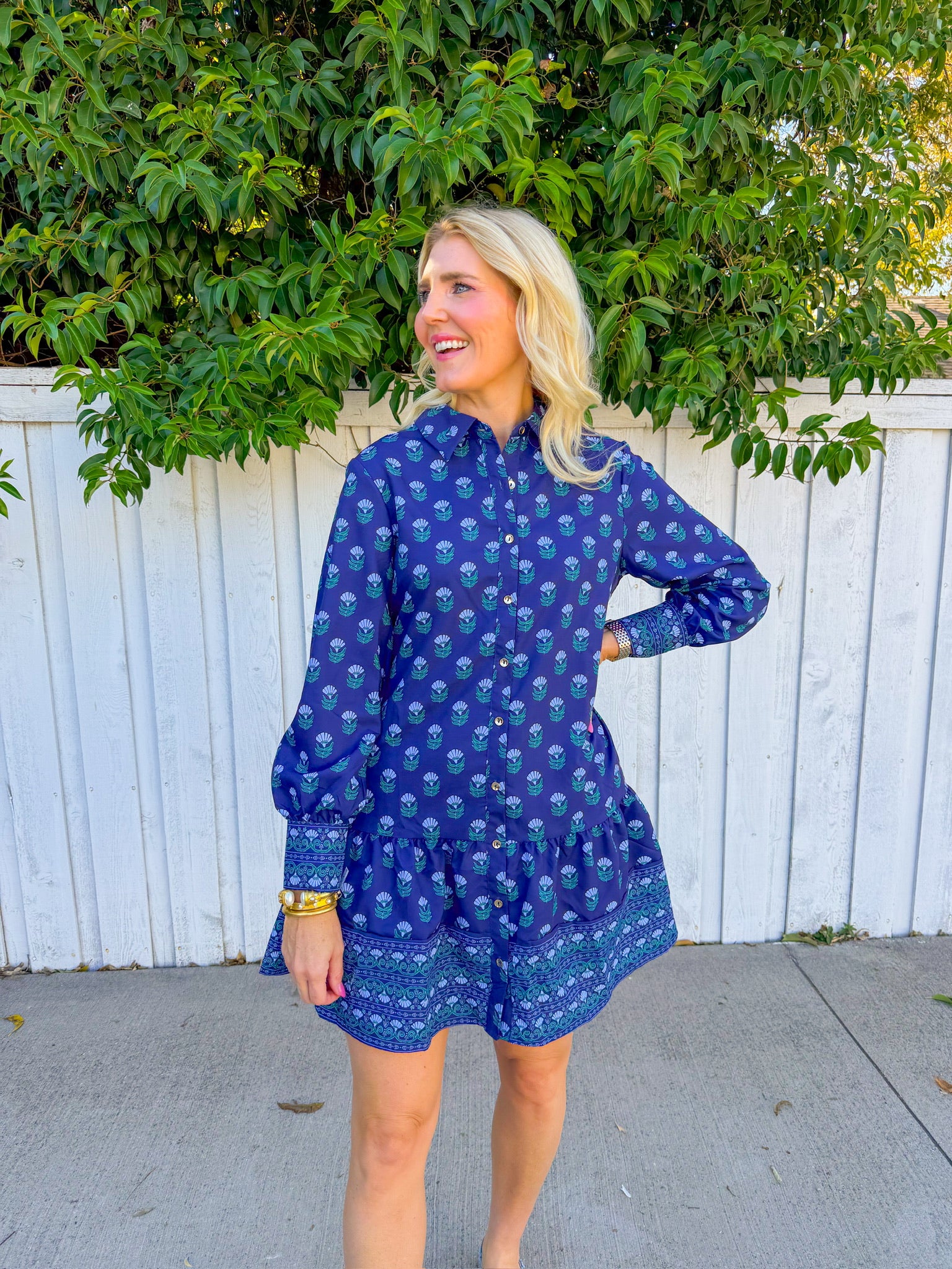 Spin into style with this charming navy mini dress, adorned with a delicate lighter blue and green floral print that brings movement and personality to your wardrobe.