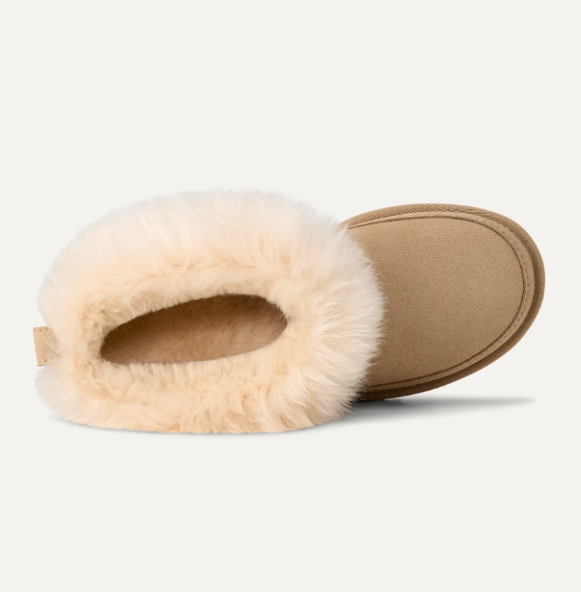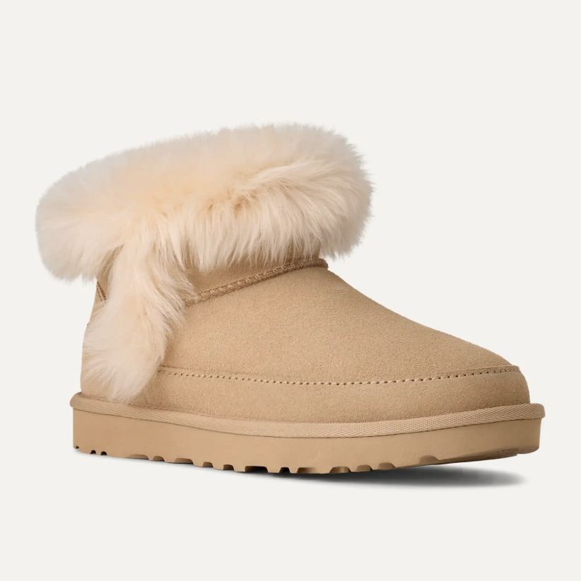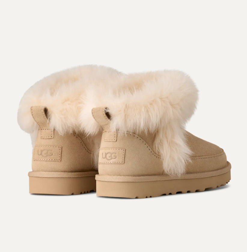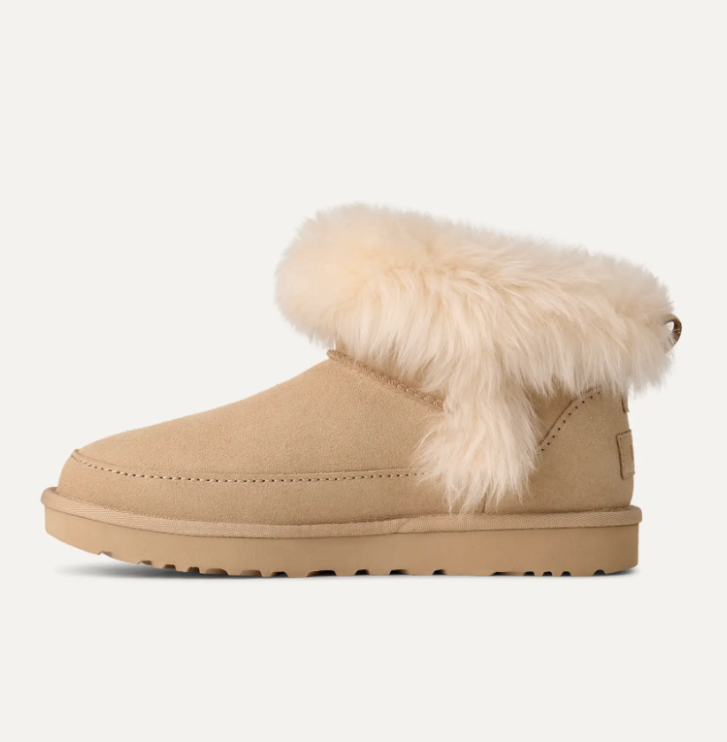 Our Classic Ultra Mini is one our most coveted Classics, and we've made it even more cozy with our Classic Ultra Mini Chalet. Featuring the same lower shaft you love about the original, this one is trimmed in fluffy sheepskin for a full mountain town "moment." It's crafted with rich suede set atop a lightweight sugarcane EVA outsole, and inside you'll be wrapped up in the warmth of our soft UGGplush™ lining from upcycled wool.