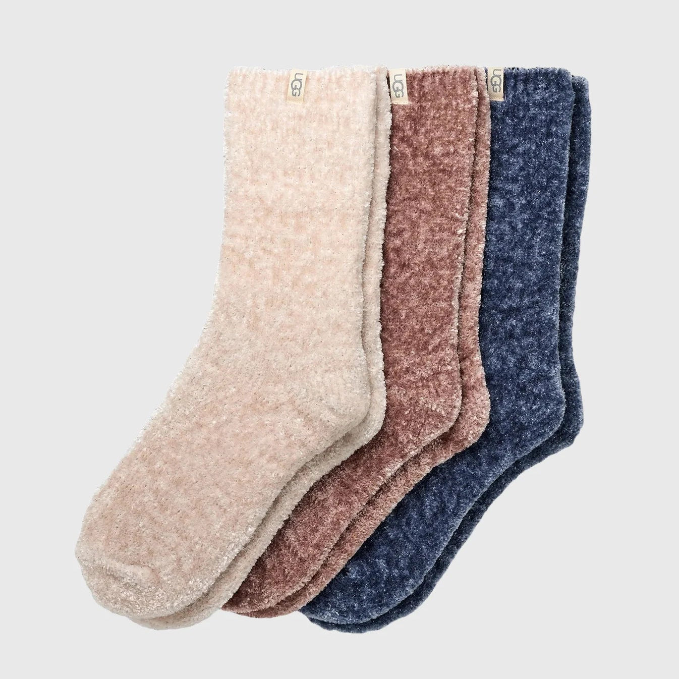 - Pack of three cozy crew socks with tonal subtle shimmer yarn