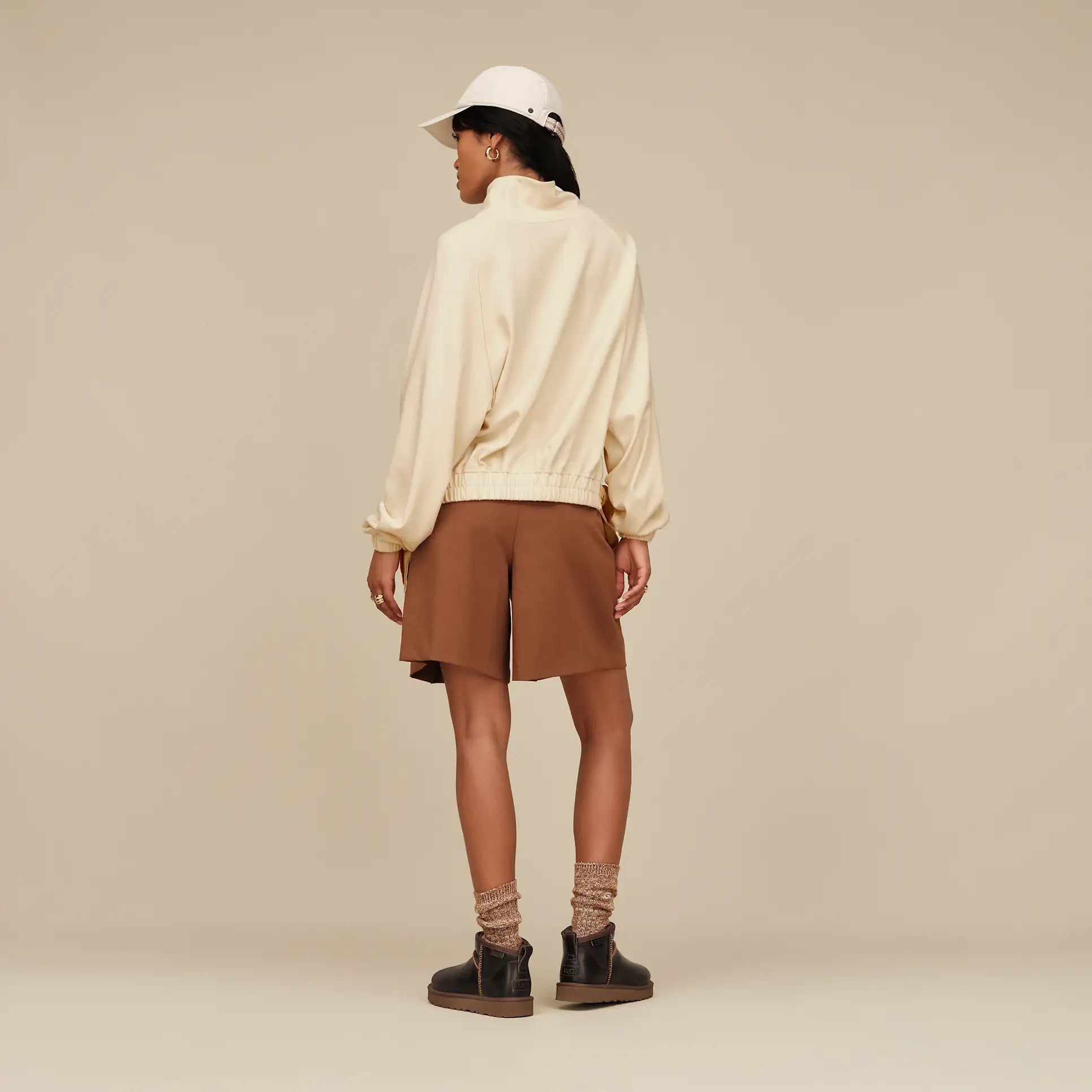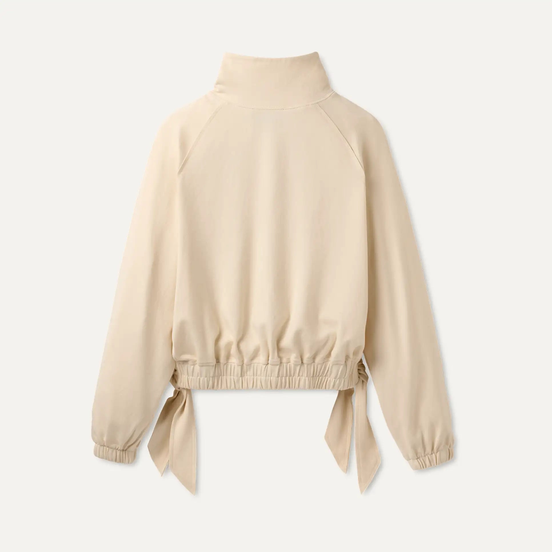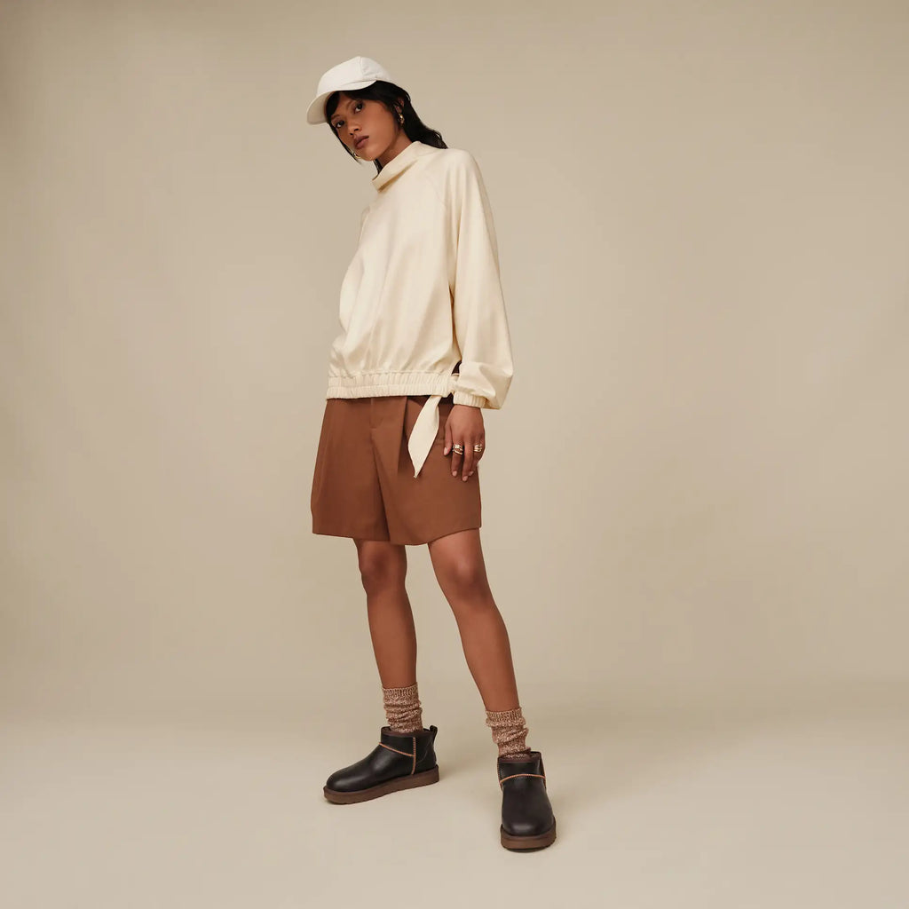 You know soft, but have you felt our Seren? The Seren Top is a funnel neck long-sleeve made from a cotton blend with Responsible Cotton. It has raglan sleeves, a side tie hem, and raw edges for an elevated look from day one.