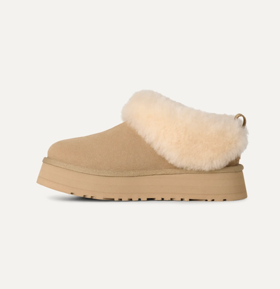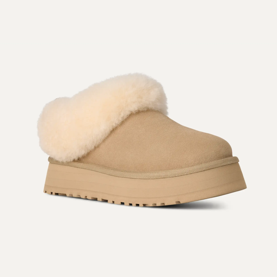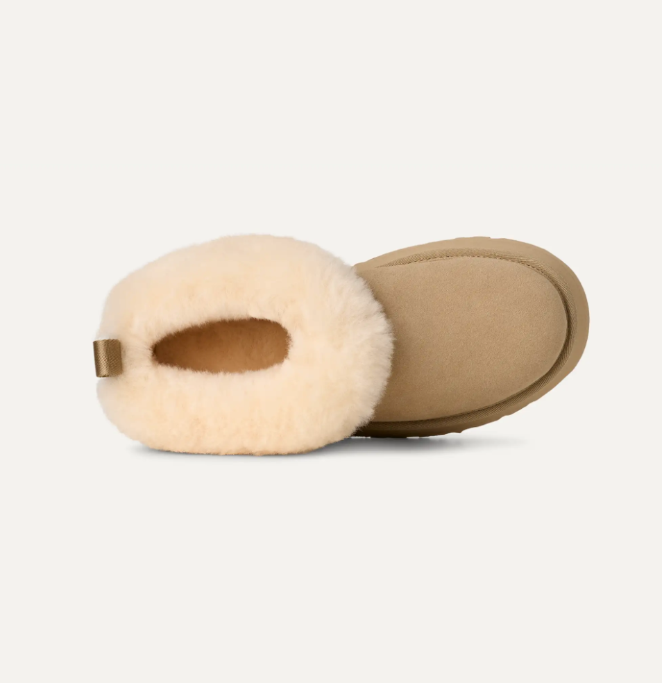Love the Tazz but want even more UGG® coziness? Our Tazzelle is the one for you. This ultra-plush indoor-outdoor slipper features genuine suede and a lightweight 1.75" platform made from springy sugarcane EVA. Sheepskin lines the interior and continues onto the lush fixed cuff, so you can wear these with socks, or without.