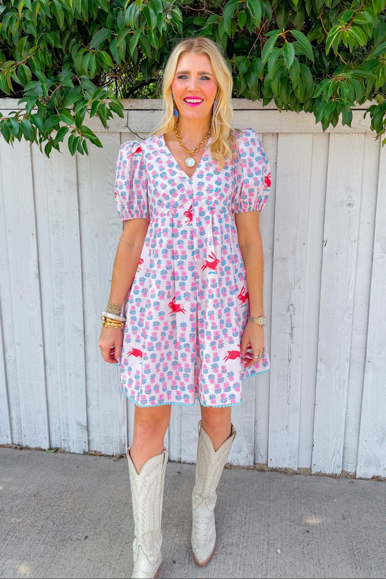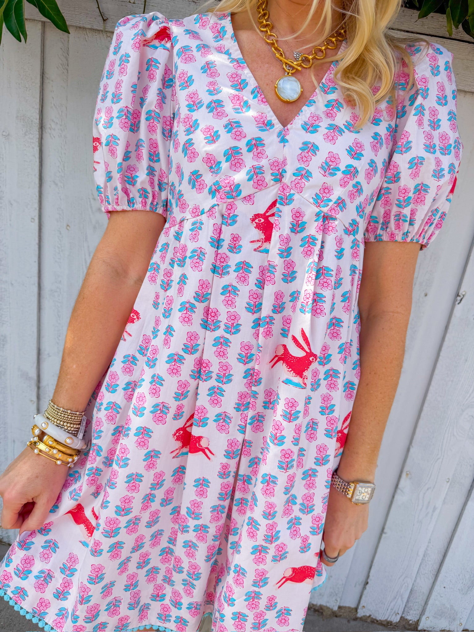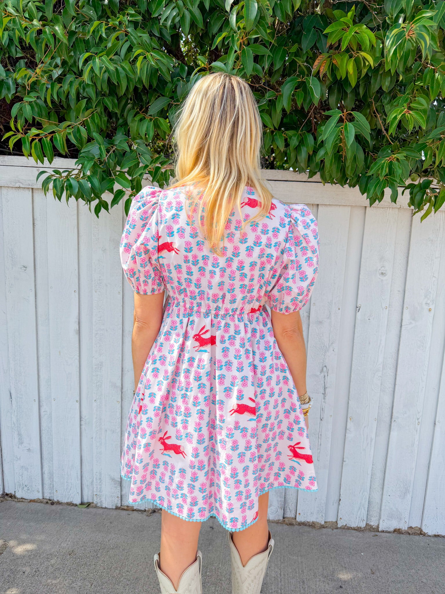 Hop into spring with this whimsical ivory mini dress featuring a scattered orange running rabbit motif layered over a charming pink and blue floral print. Perfect for those who love a little personality in their wardrobe, this playful piece combines two delightful patterns for a fun, eye-catching look.