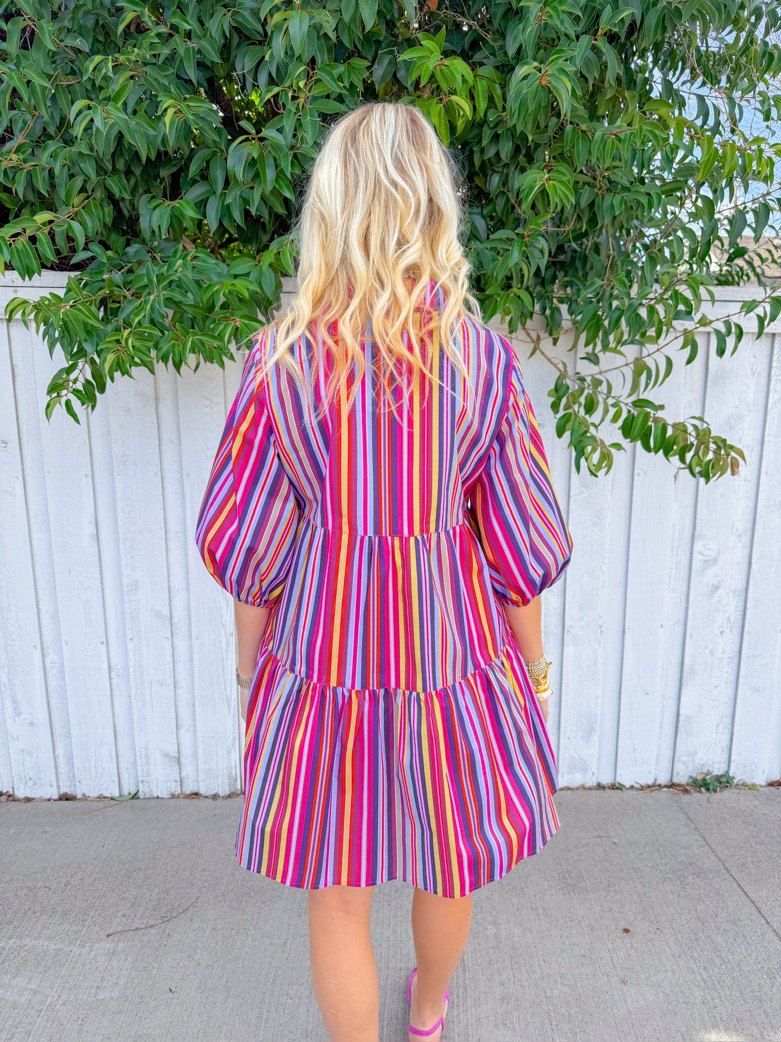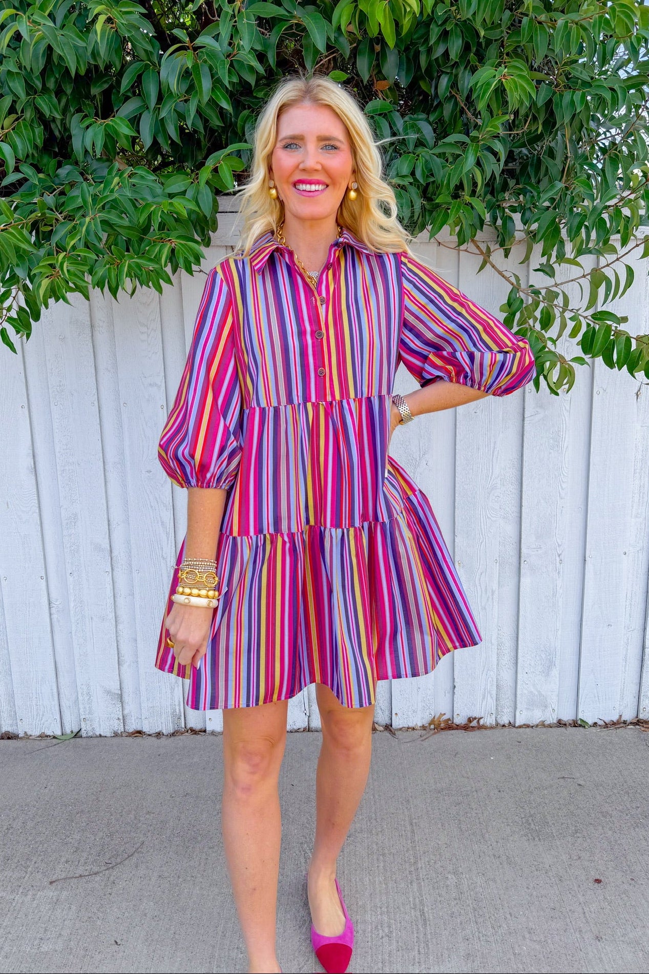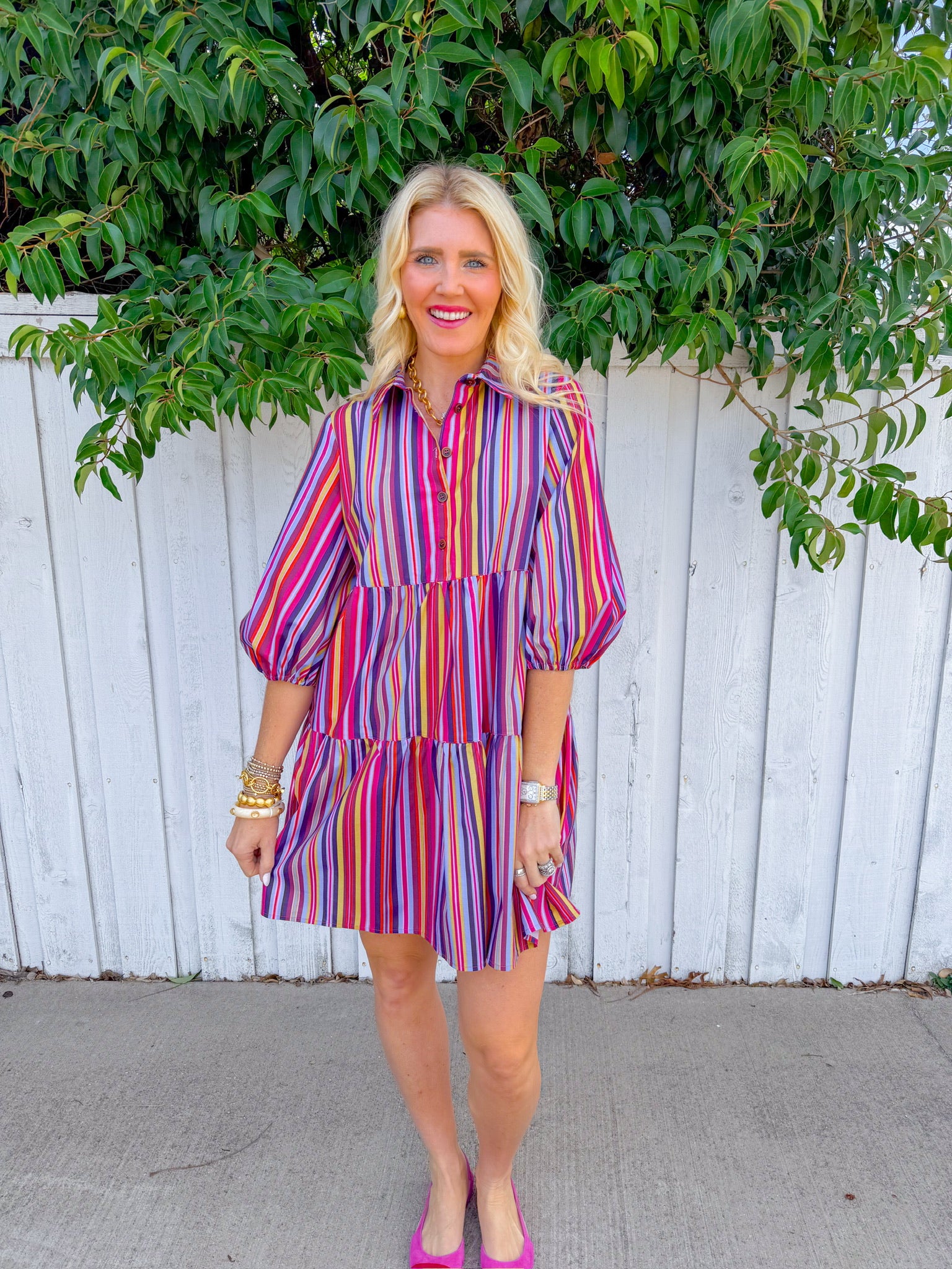 Stripes never looked so fun! This Uncle Frank tiered stripe mini dress brings the perfect pop of color with its vibrant multi-stripe pattern. The playful tiered seam design adds dimension and movement, while the charming button closure at the neckline keeps things polished.