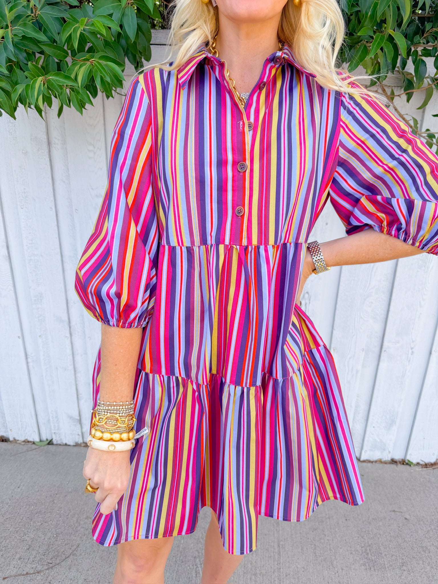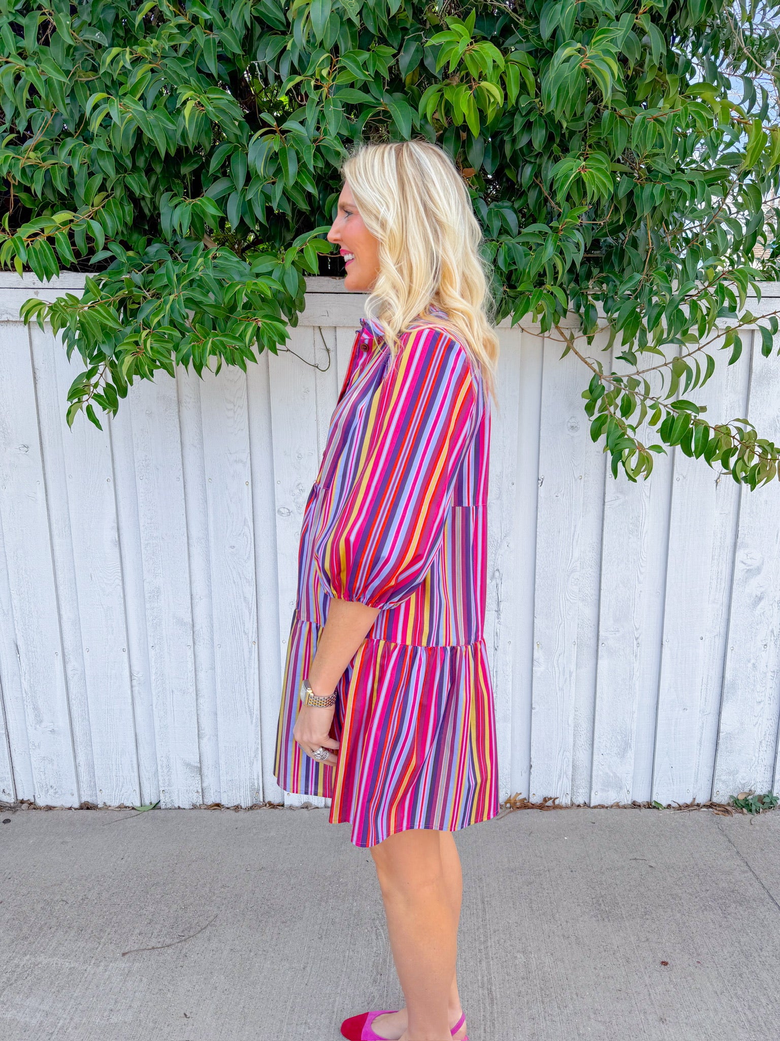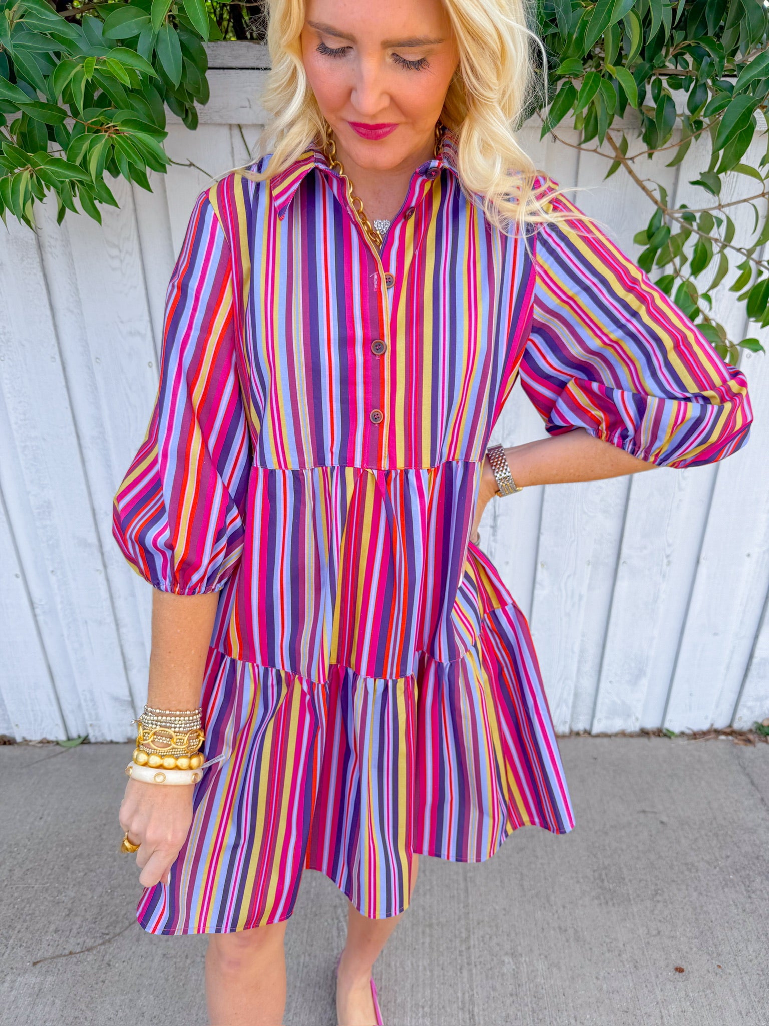 Stripes never looked so fun! This Uncle Frank tiered stripe mini dress brings the perfect pop of color with its vibrant multi-stripe pattern. The playful tiered seam design adds dimension and movement, while the charming button closure at the neckline keeps things polished.
