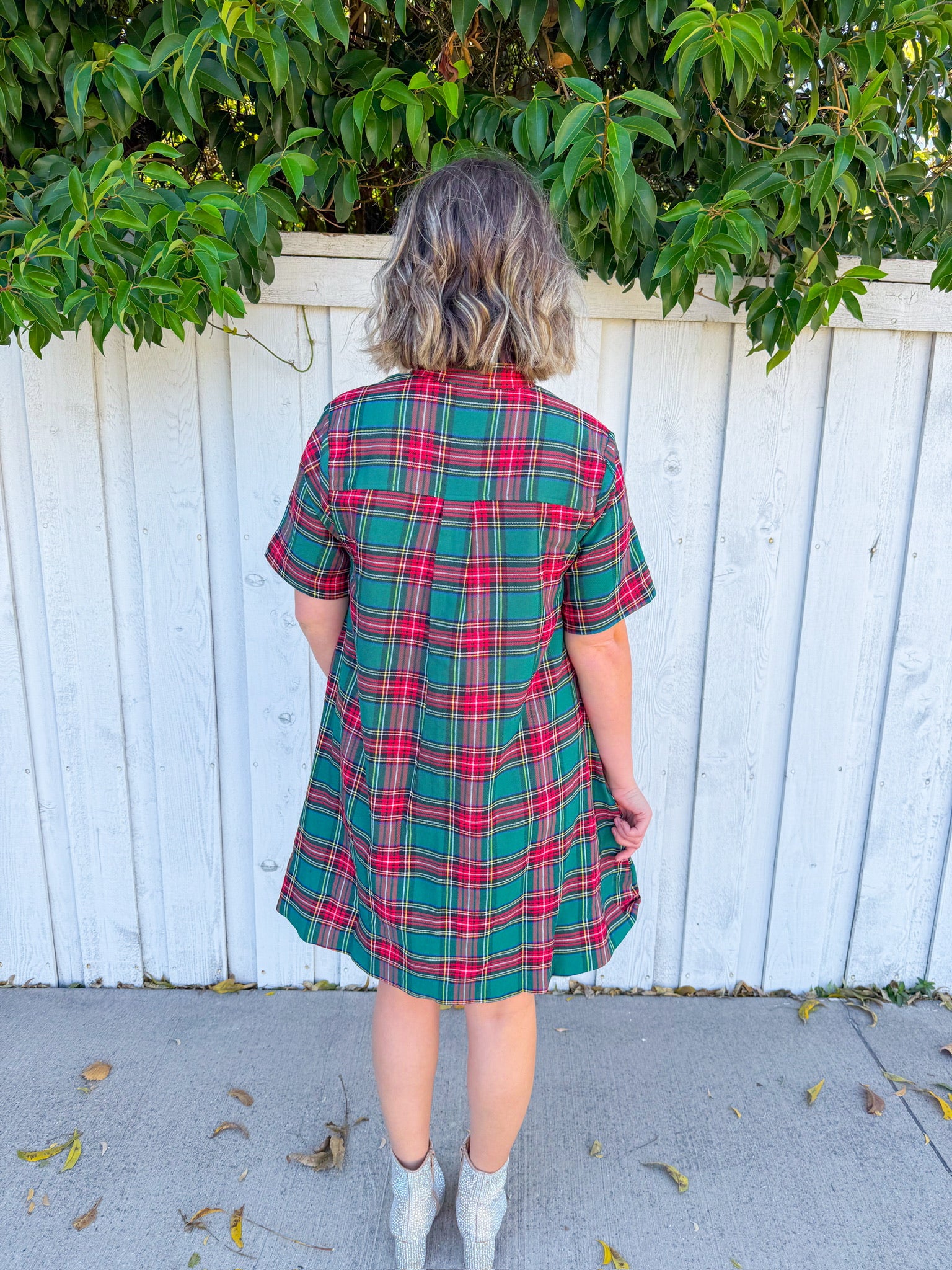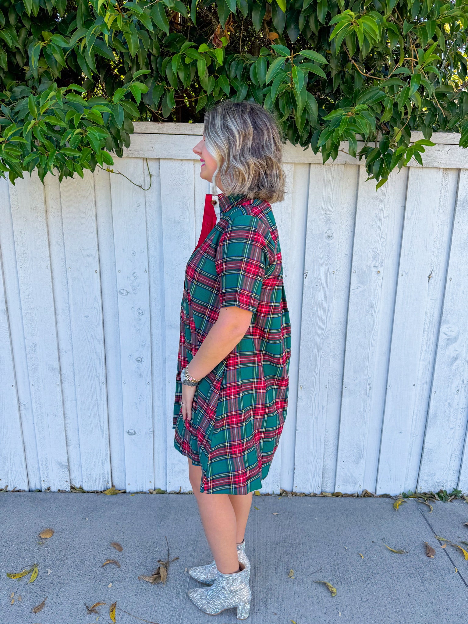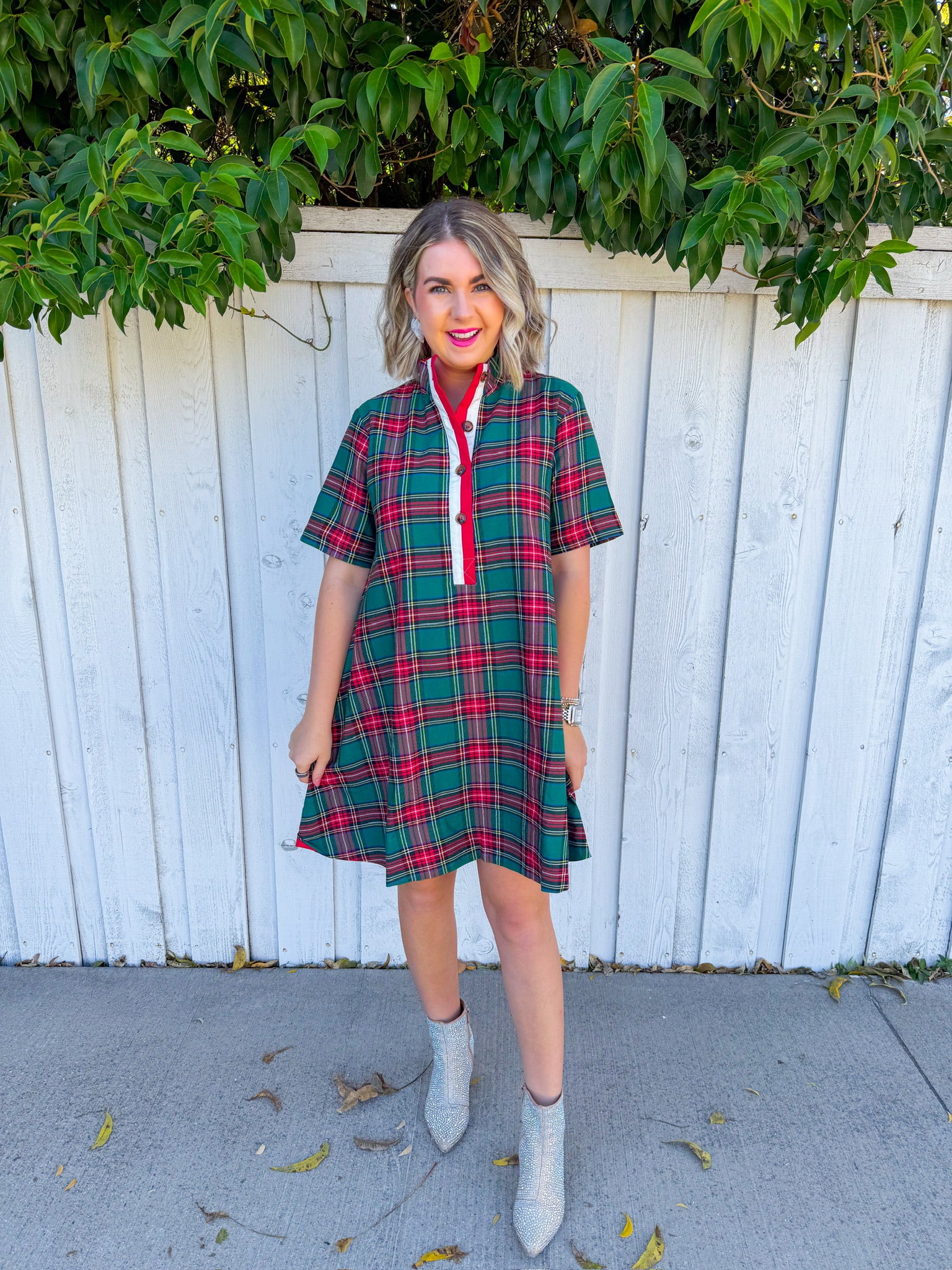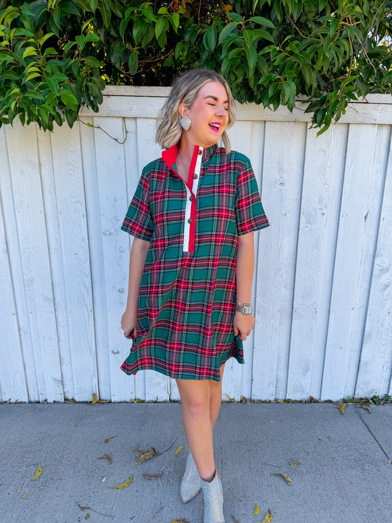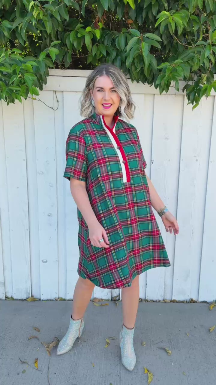 Festive charm meets everyday style with this green plaid mini dress. Crisp red and white striped trim frames the neckline and sleeves, while a classic button closure adds vintage-inspired detail. Perfect for holiday gatherings, seasonal celebrations, or anyone who loves a pop of plaid year-round. Cozy, cute, and ready to turn heads.