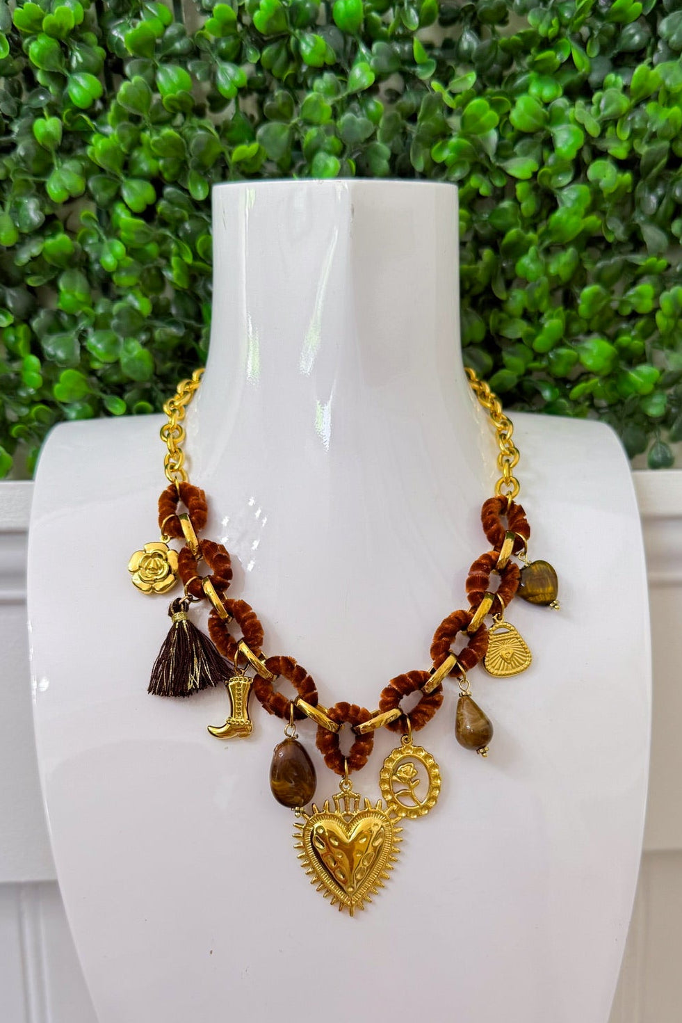 Saddle up in style with this velvet cowgirl necklace that brings Western charm straight to your neck. Featuring a rich brown velvet link paired with gleaming gold accents, this playful piece captures that perfect blend of rugged elegance and modern flair.