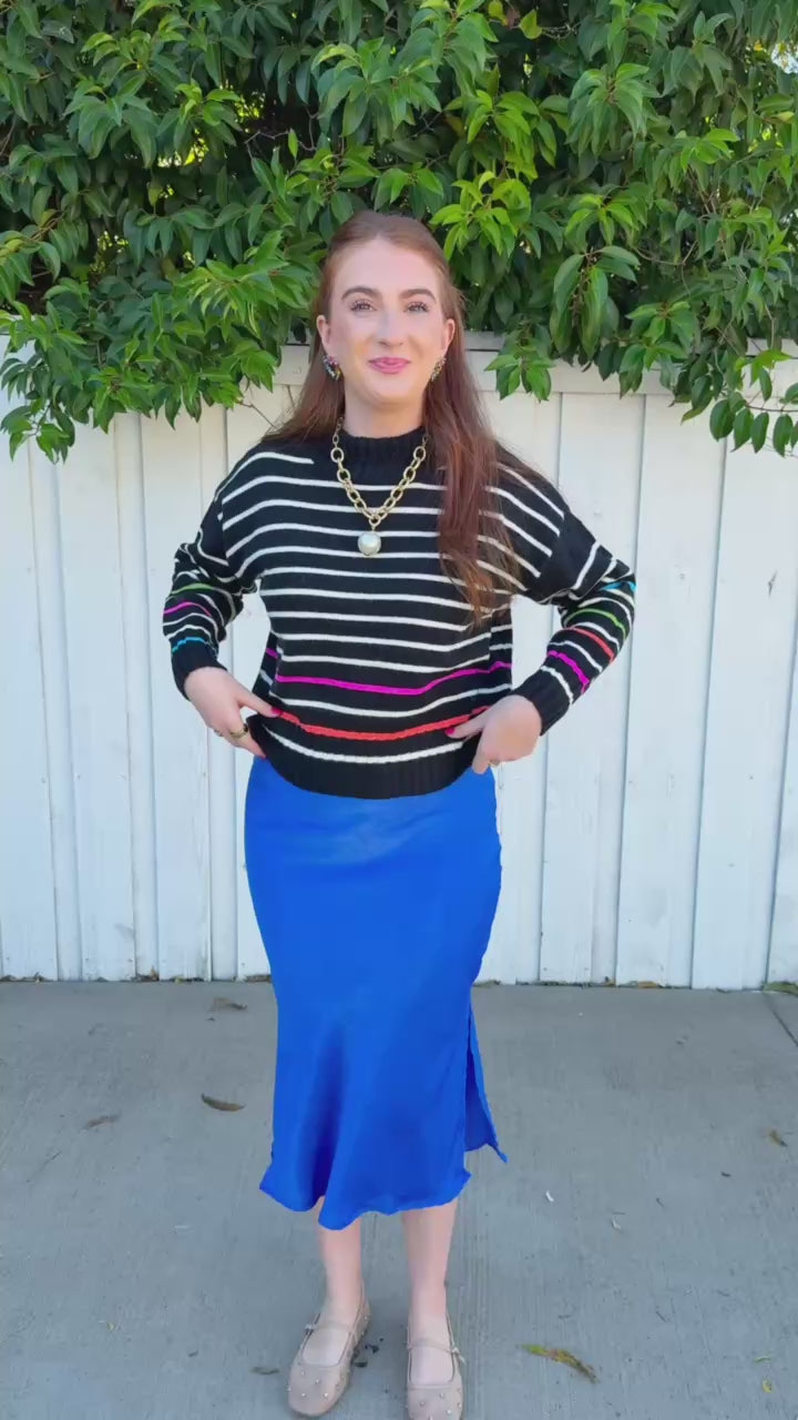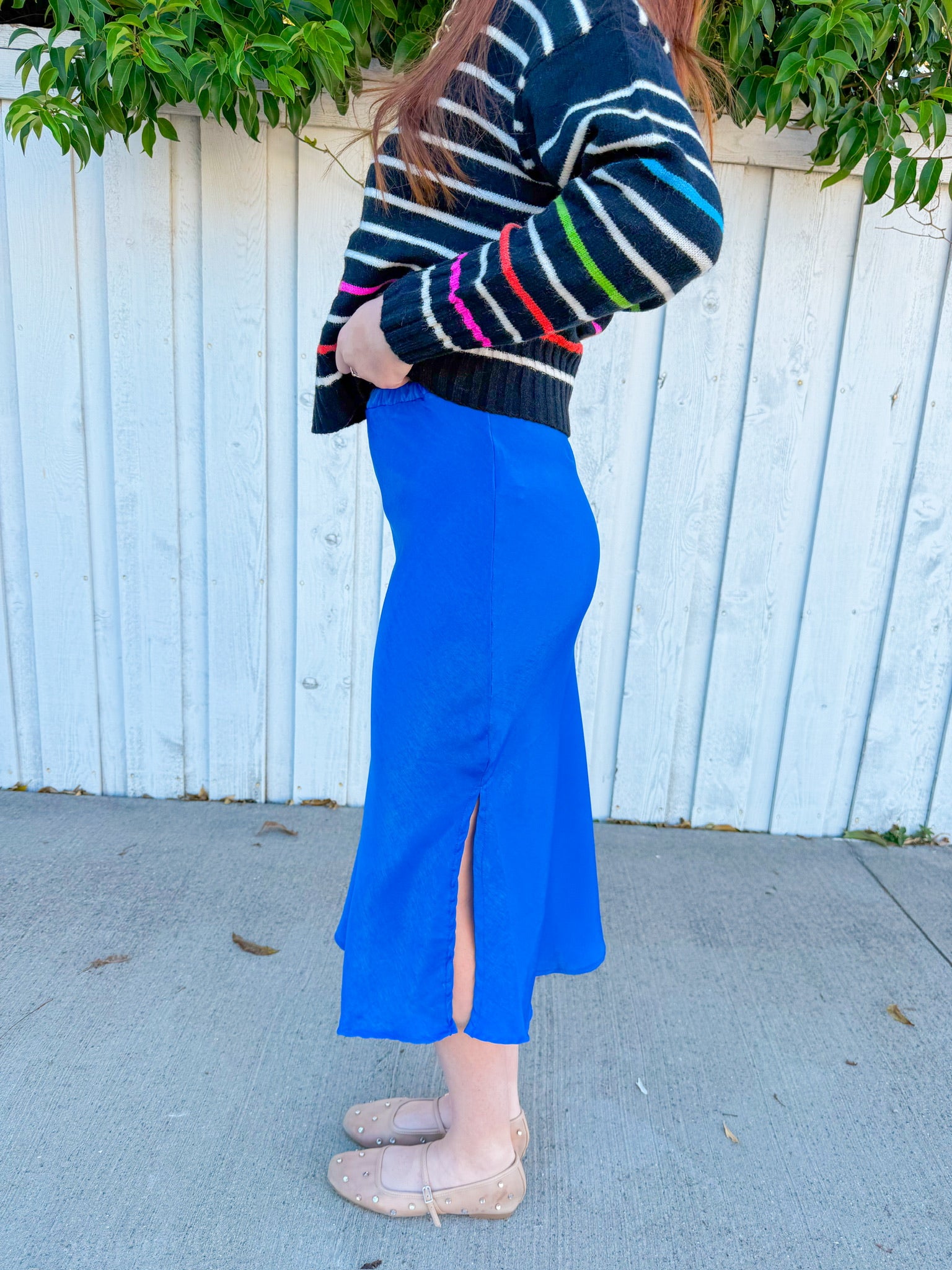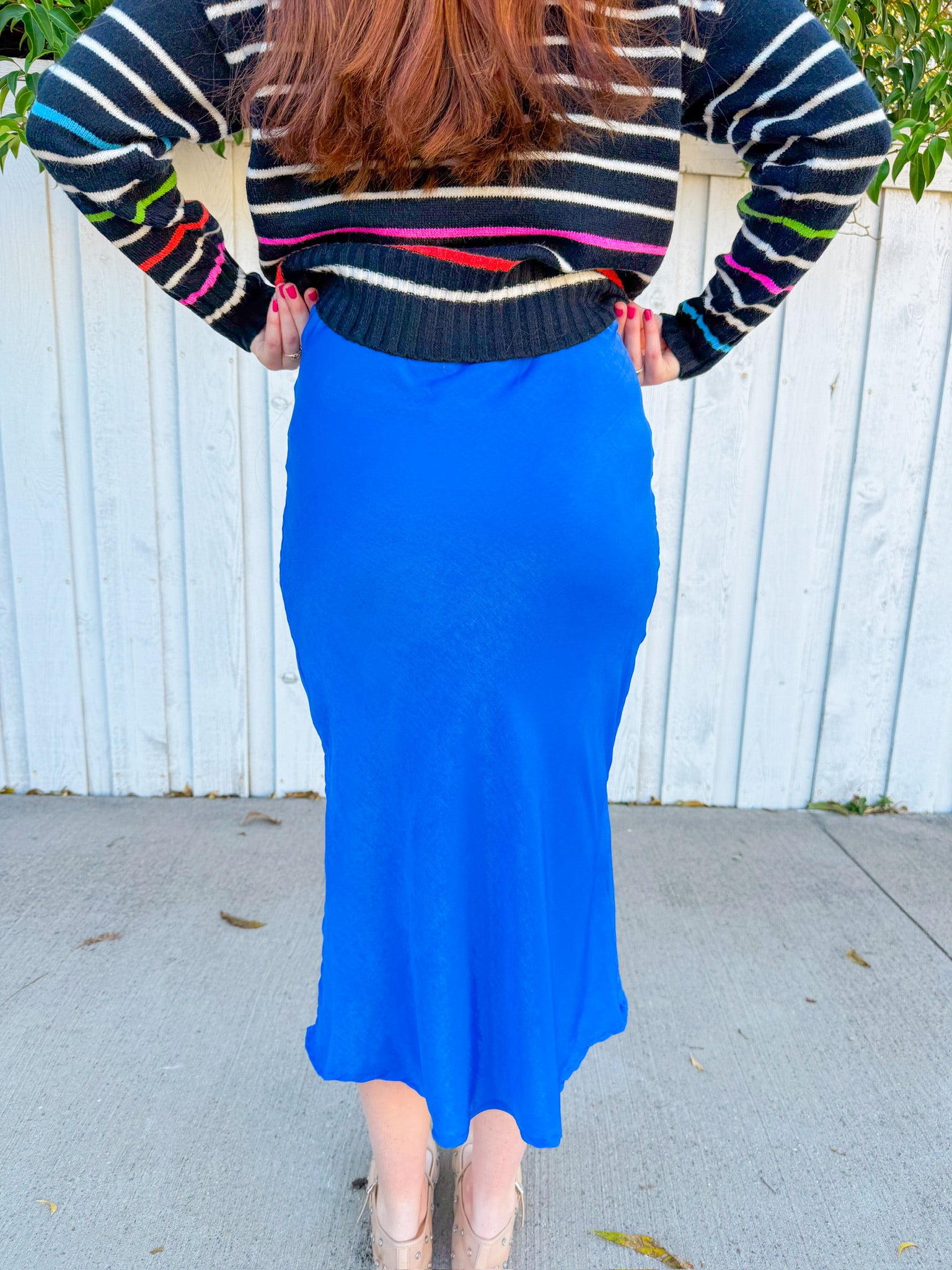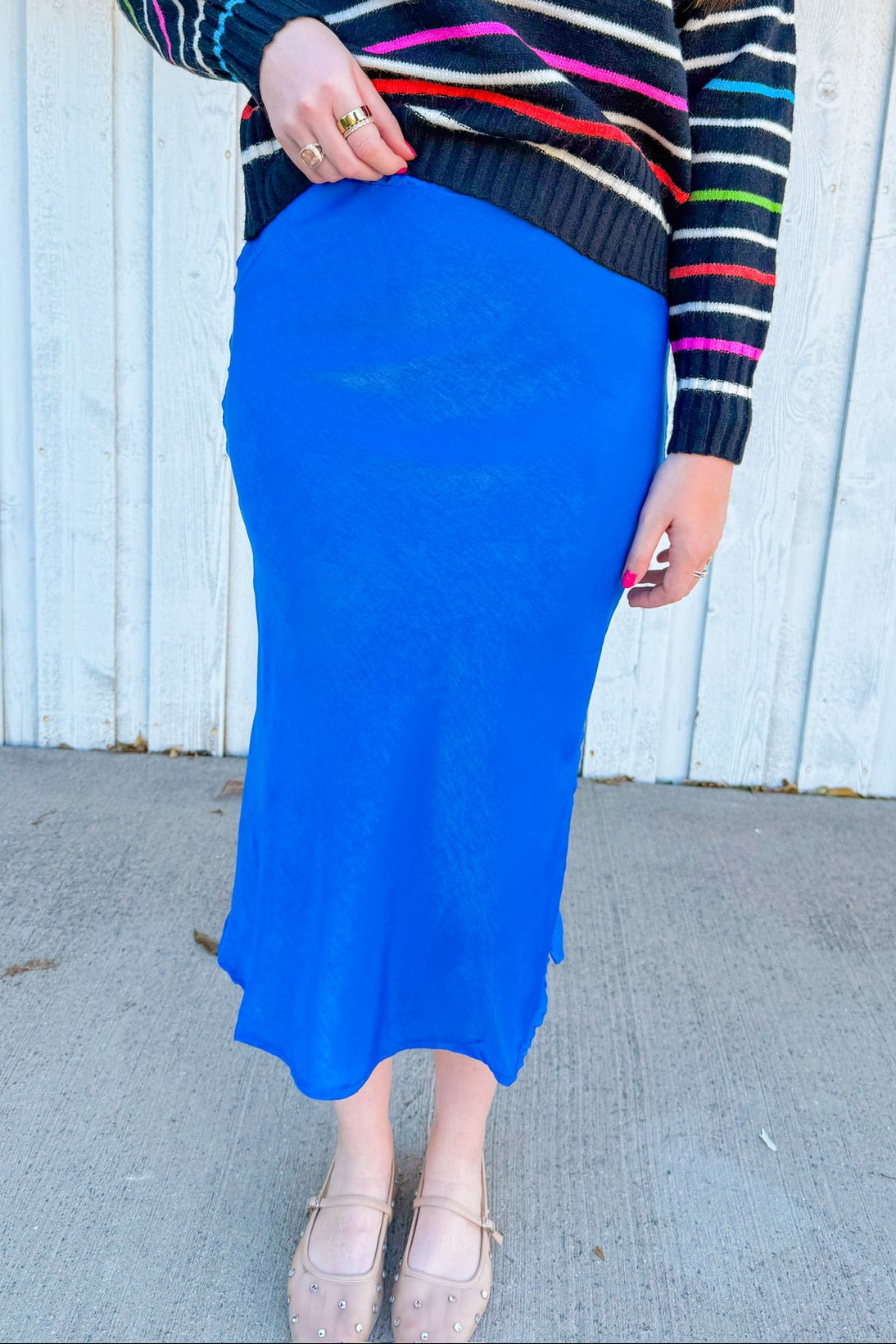 Glide through your day in this electric blue silky midi skirt that's equal parts sophisticated and fun. The smooth, luxurious fabric drapes beautifully, creating an effortless flow with every step.