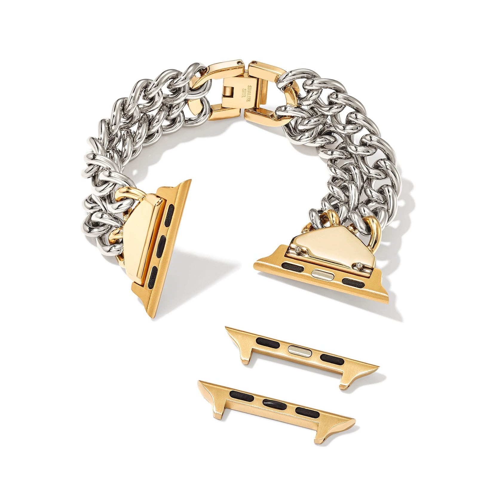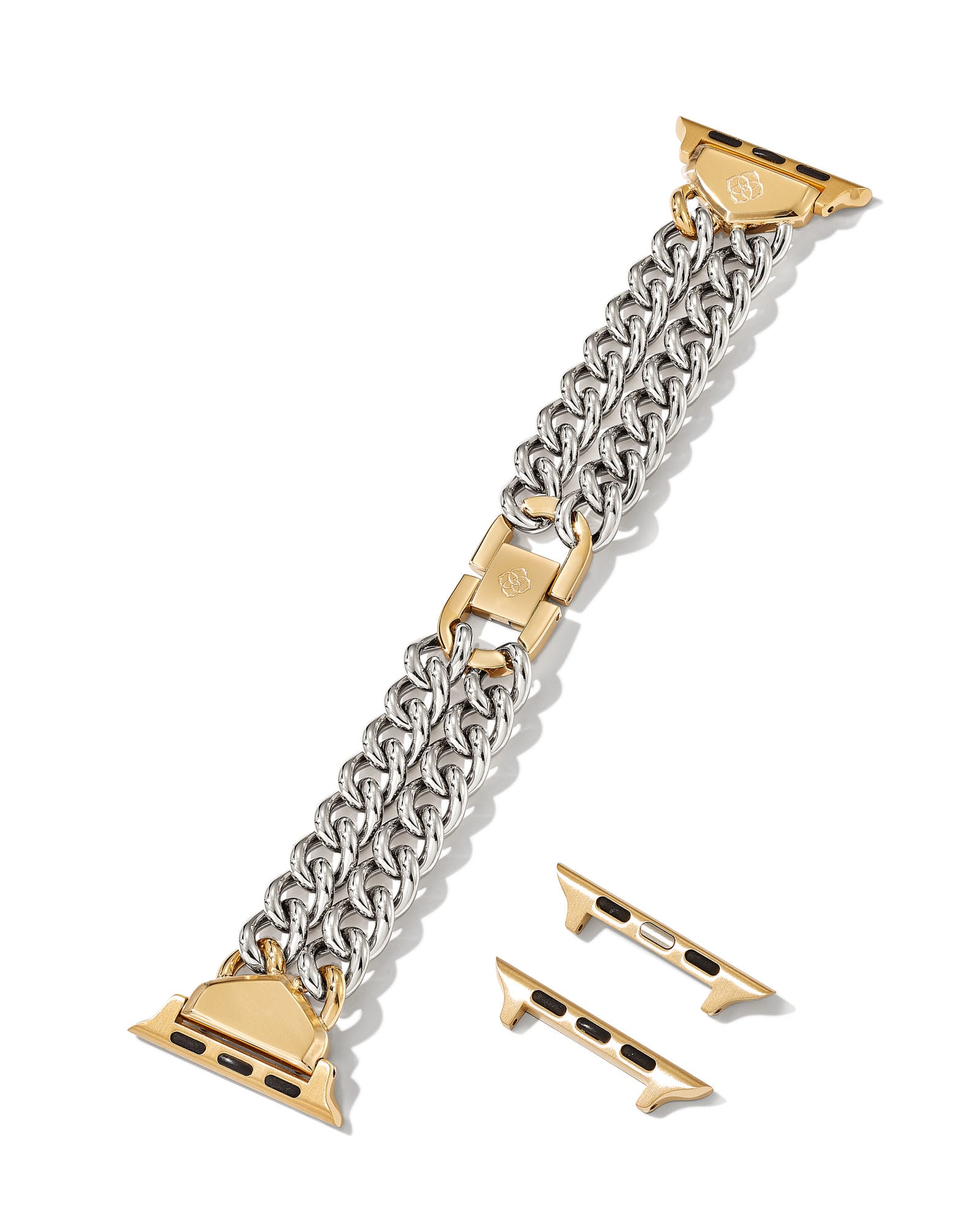 Designed to fit your Apple Watch® and Samsung Galaxy Watch®, the Whitley Double Chain Watch Band in Two Tone Stainless Steel gives your smartwatch a fuss-free layered look with its dual chains. To switch up your bands, simply press down on the easy release mechanism and then align each new band to the pinholes on either side of the watch.