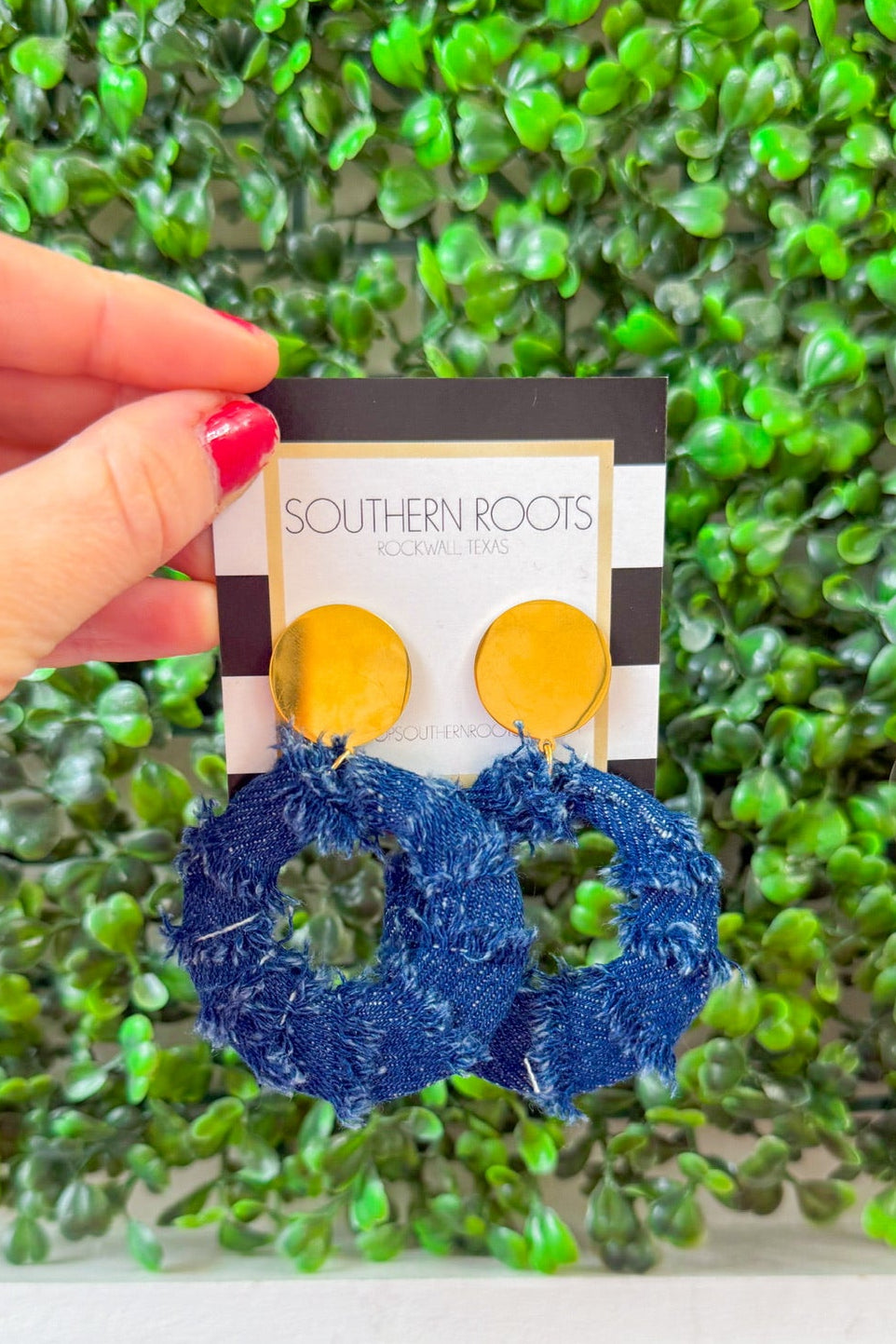 Wild Rodeo Hoops - Denim Saddle up in style with these playful denim hoops that pack serious personality. Flat denim loops sit pretty on iridescent studs that catch the light with every turn of your head.