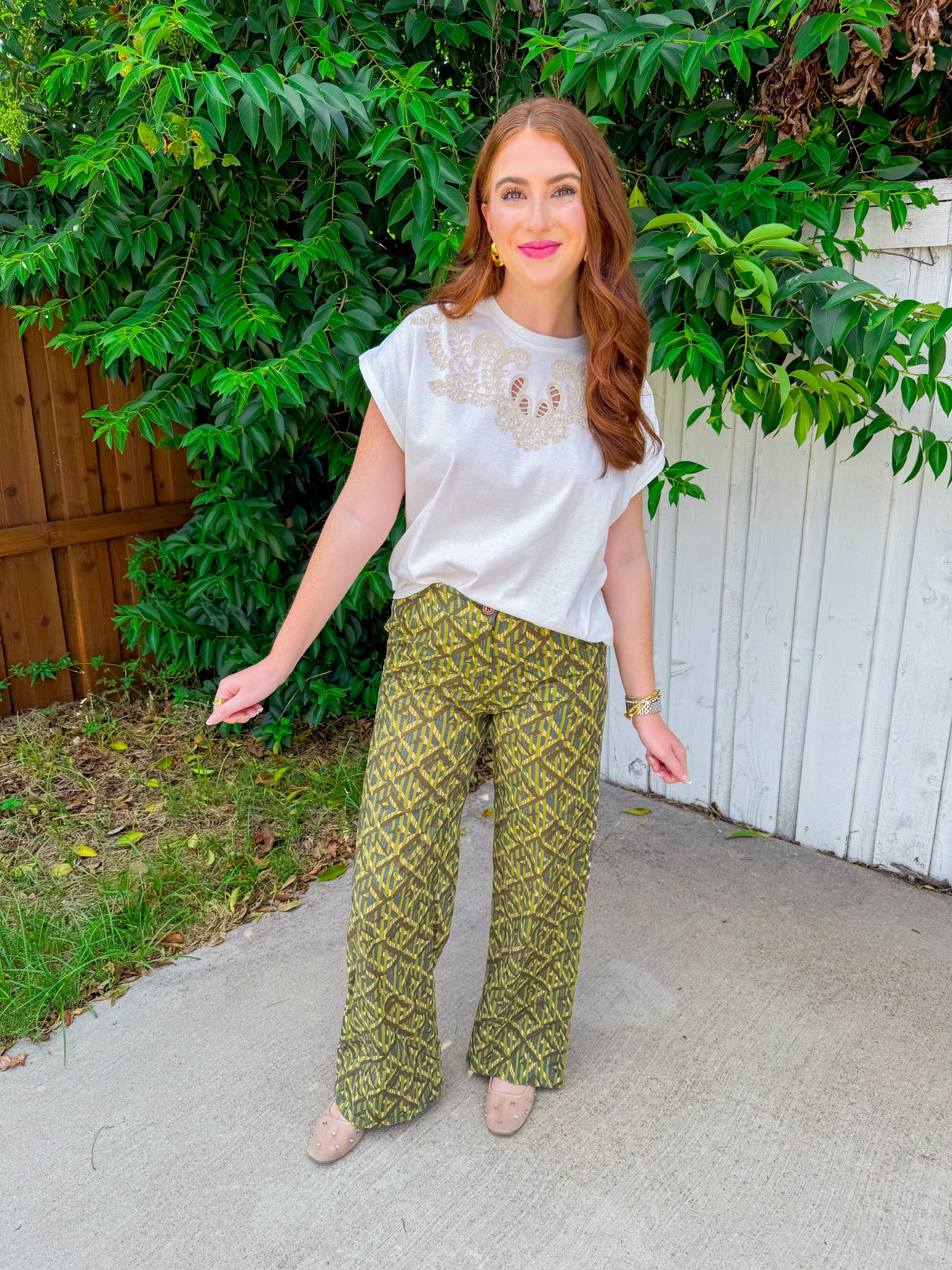 Olive-and-mustard geometric pants with a tailored straight leg—eye-catching yet easy for office days and dinner plans. Pair with a cream sweater and loafers