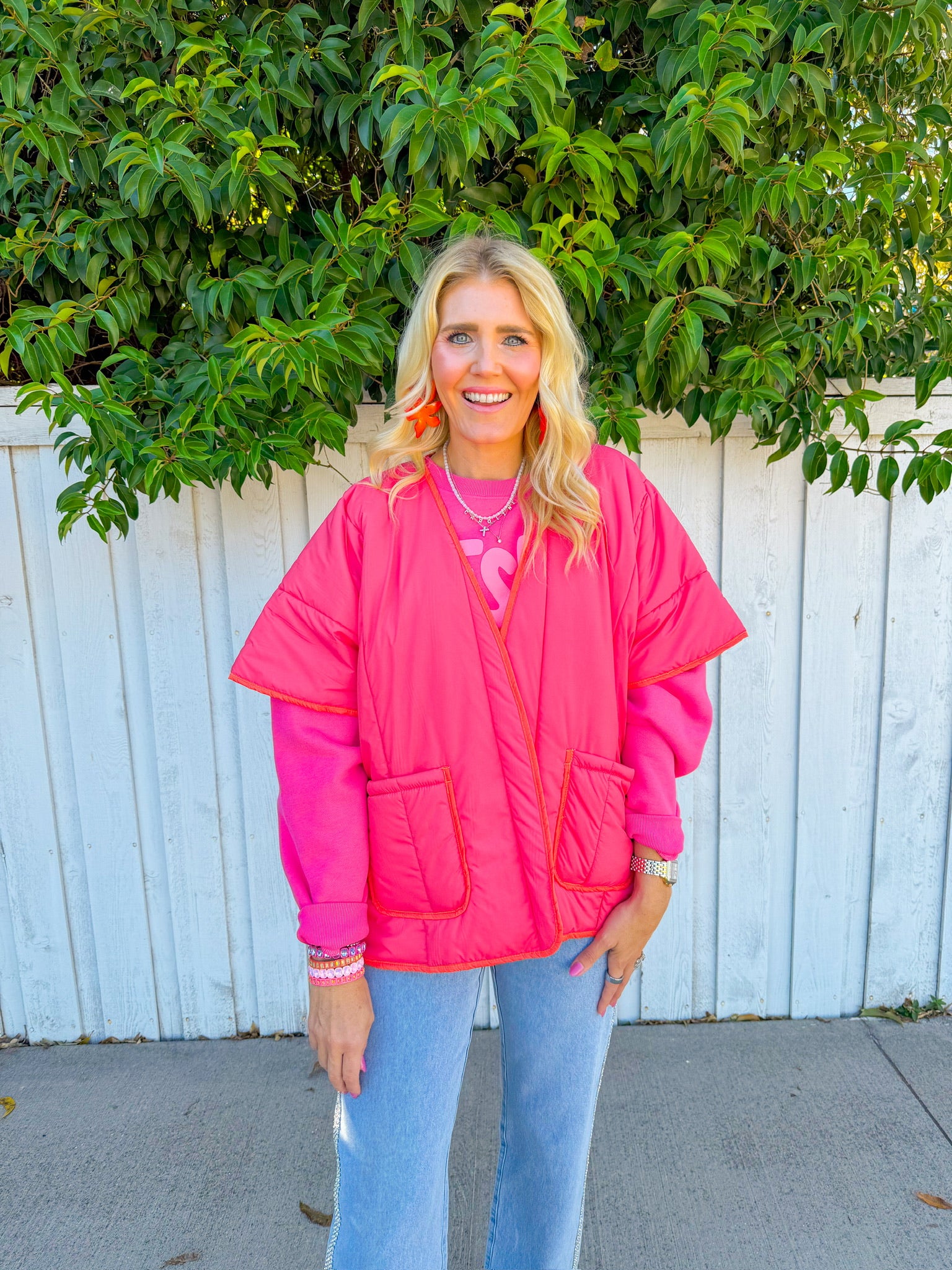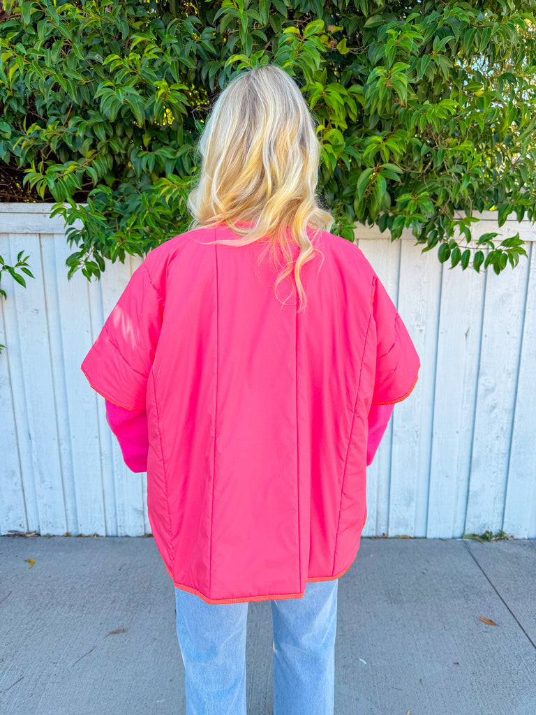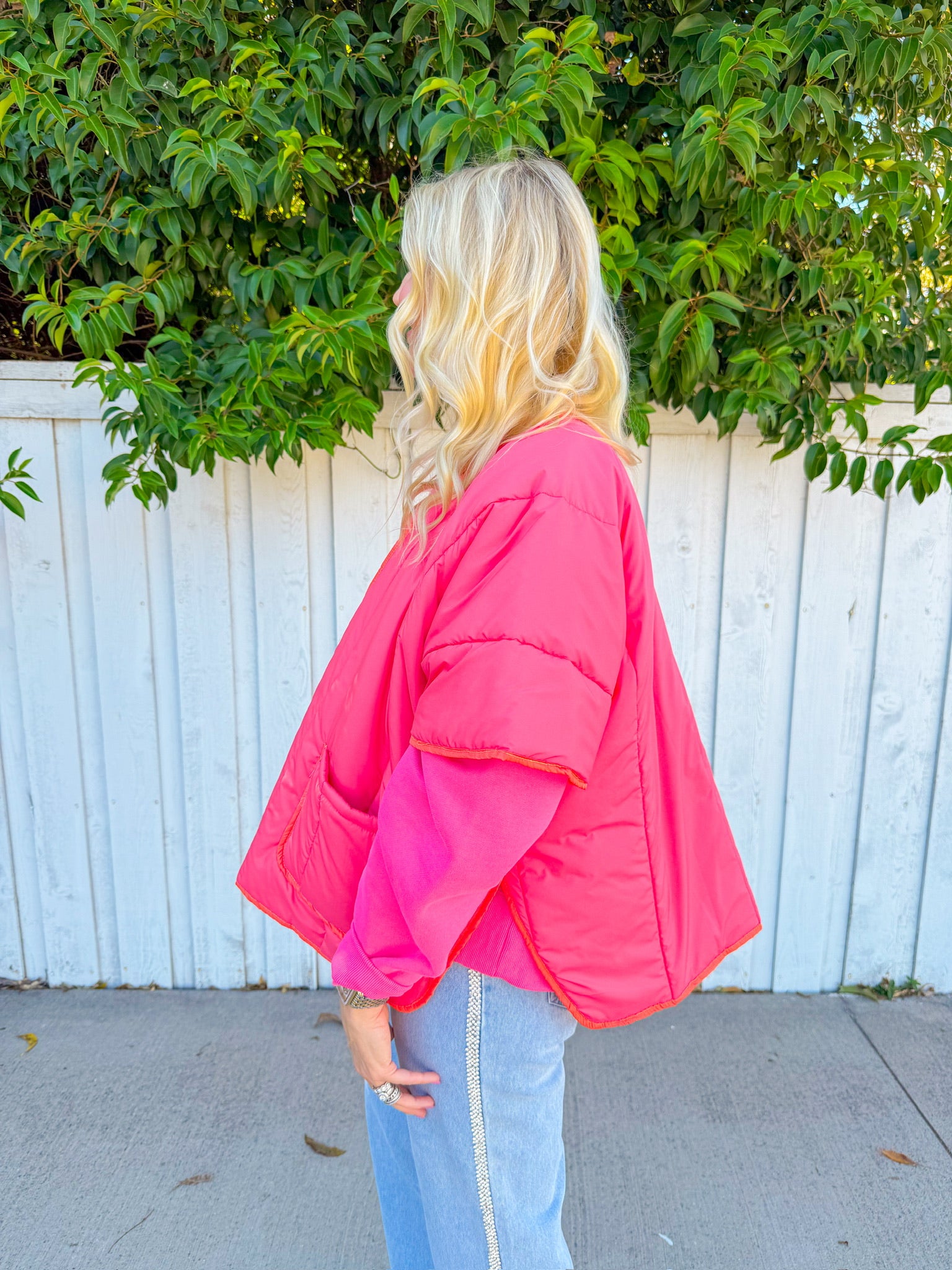 Meet your new favorite reversible layering piece! This coral puffer vest channels poncho vibes with its relaxed cap sleeves and cozy silhouette. Flip it around to reveal a pop of orange on the inside—because why choose when you can have both?