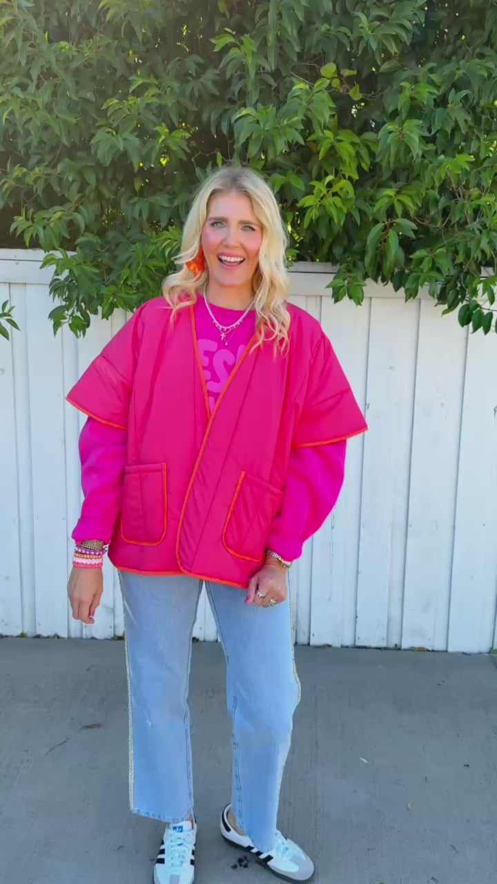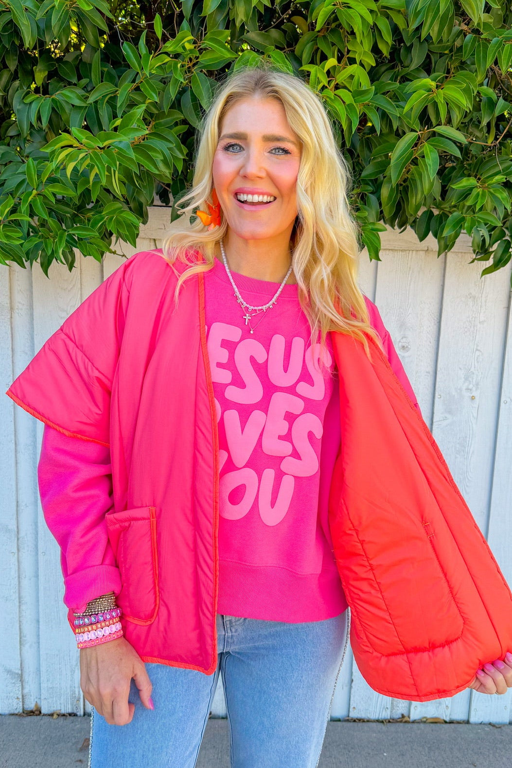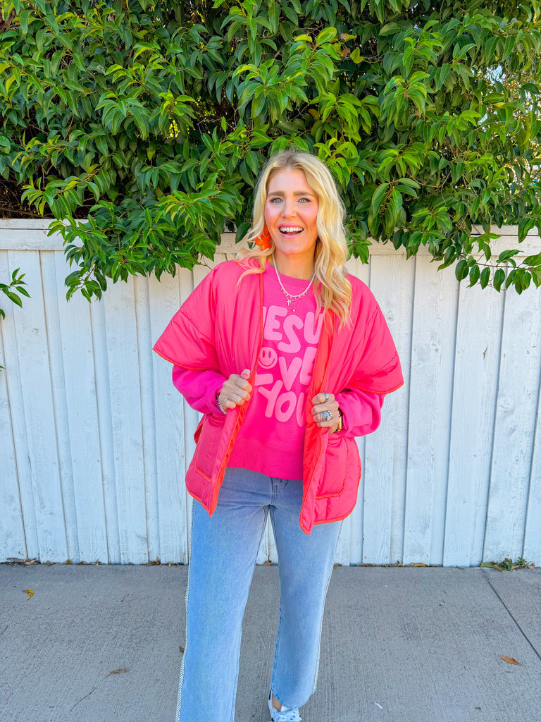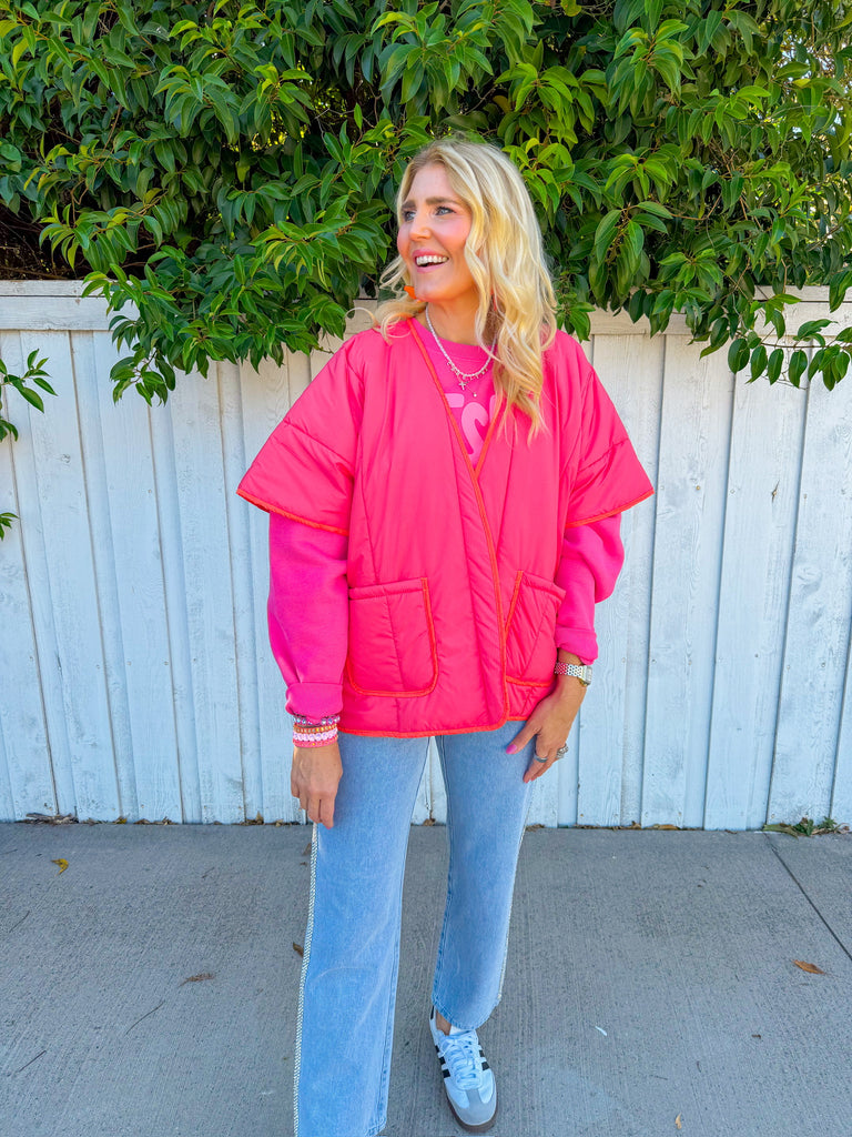 Meet your new favorite reversible layering piece! This coral puffer vest channels poncho vibes with its relaxed cap sleeves and cozy silhouette. Flip it around to reveal a pop of orange on the inside—because why choose when you can have both?