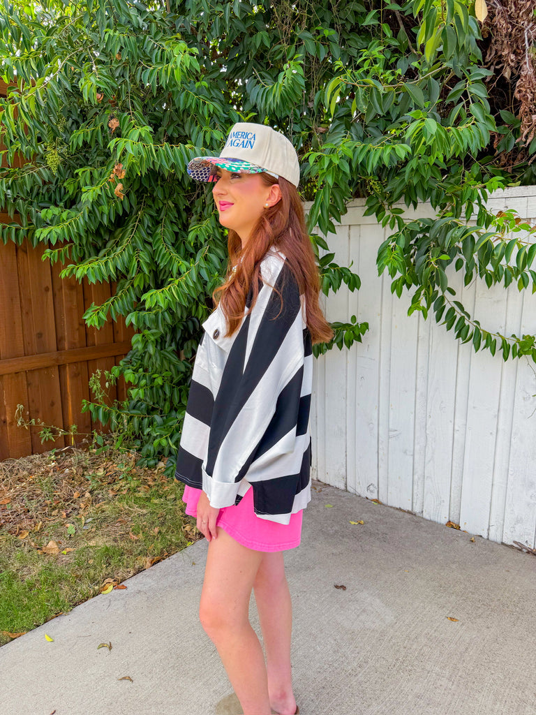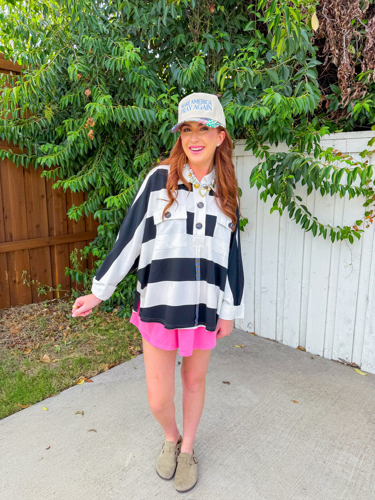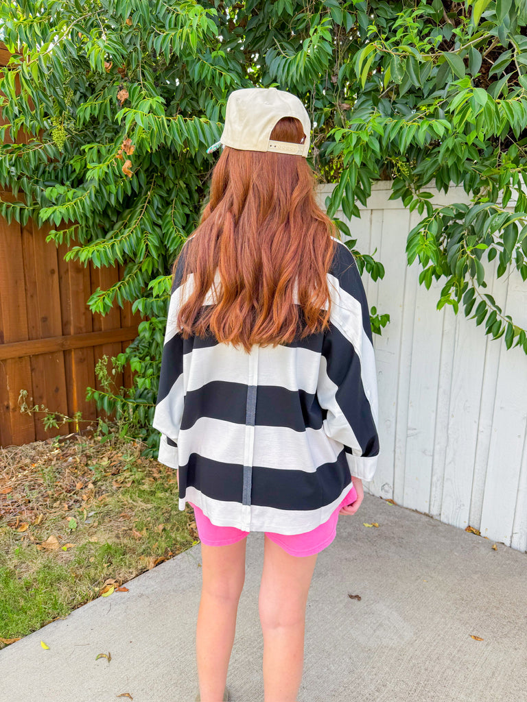 Stay ahead of the style game with this playful oversized striped pullover! Featuring a quarter-length button closure, it’s easy to wear and adds a fun twist to your casual look.