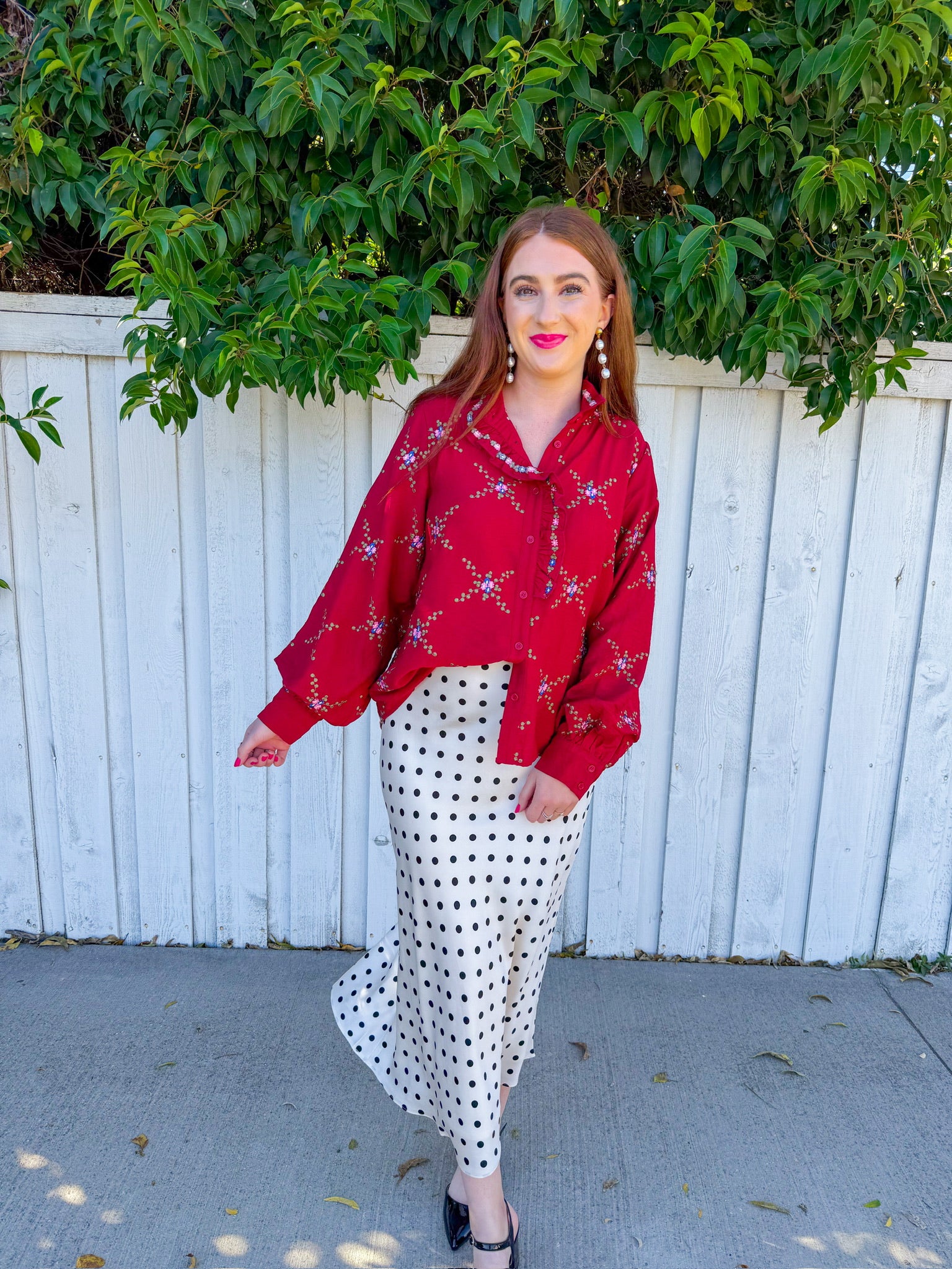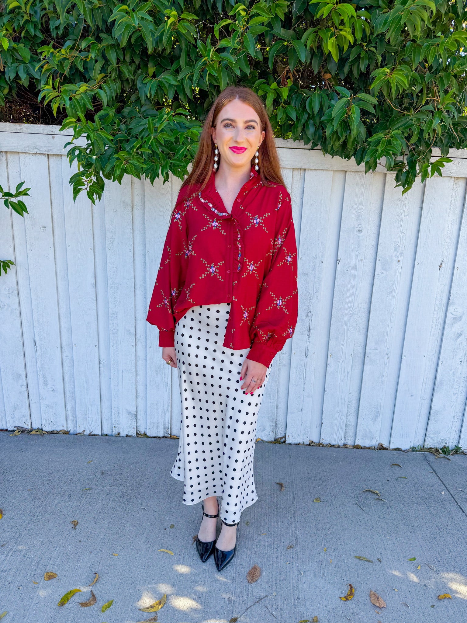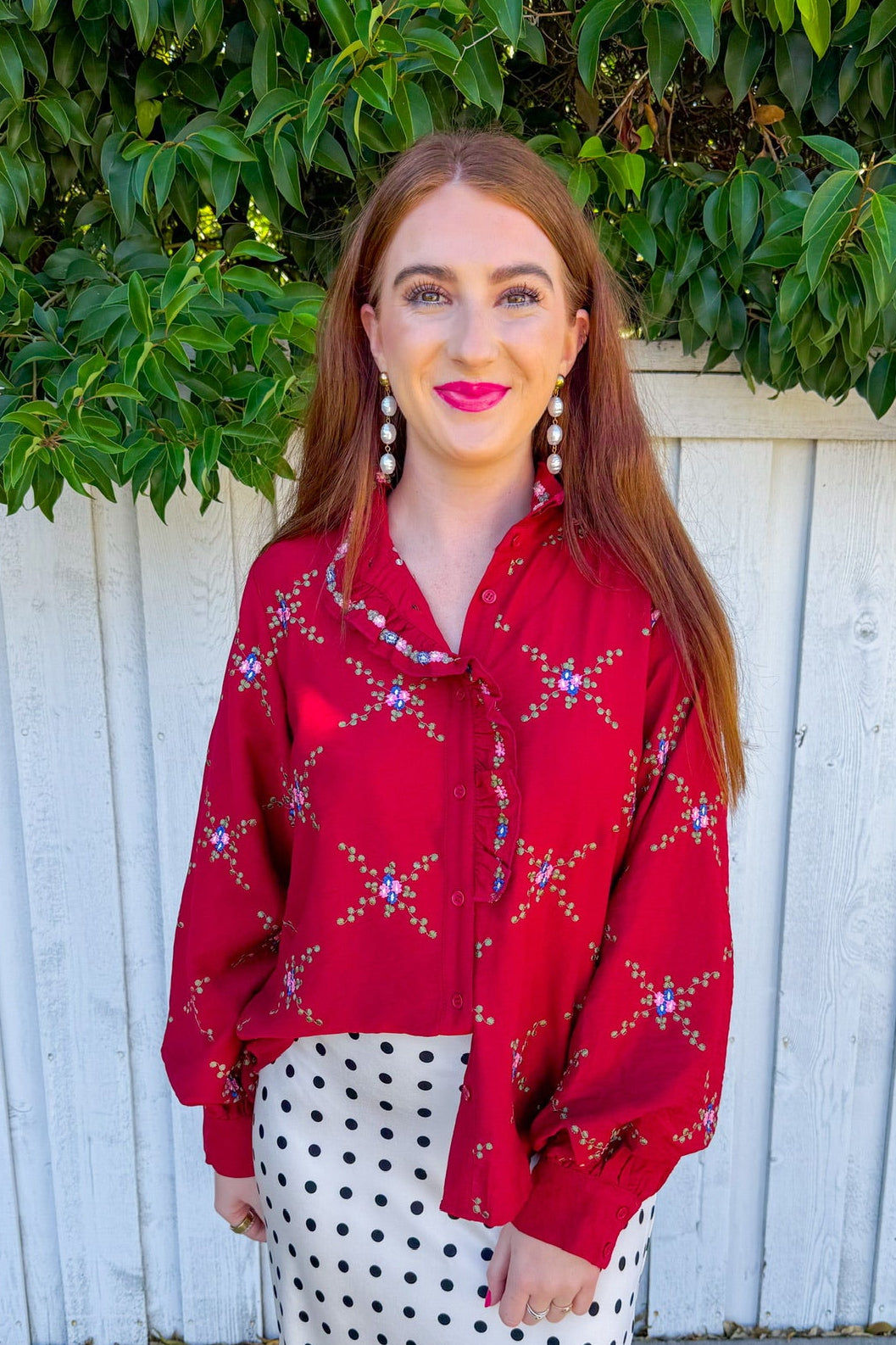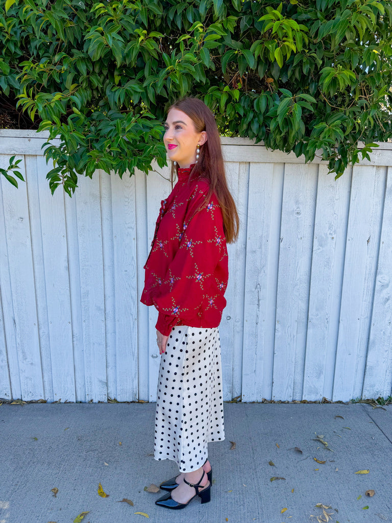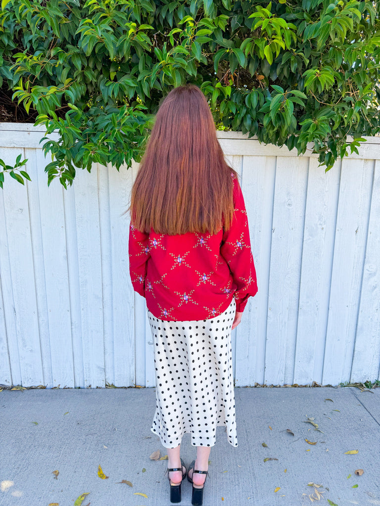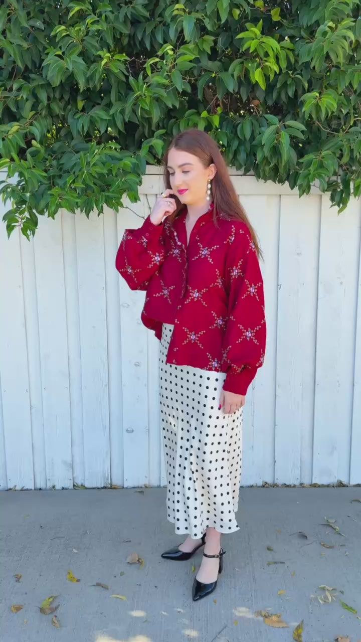 Embrace the season in this striking crimson blouse, where a bold, structured collar frames a delicate criss-cross floral print. Front button closure offers easy styling versatility, while the thicker collar adds dimension and a touch of editorial flair.